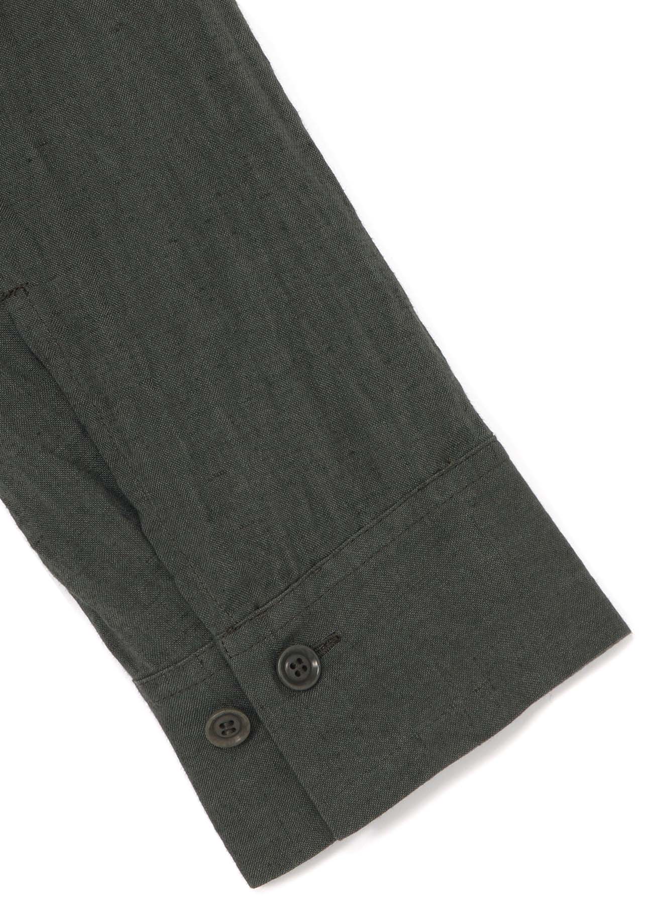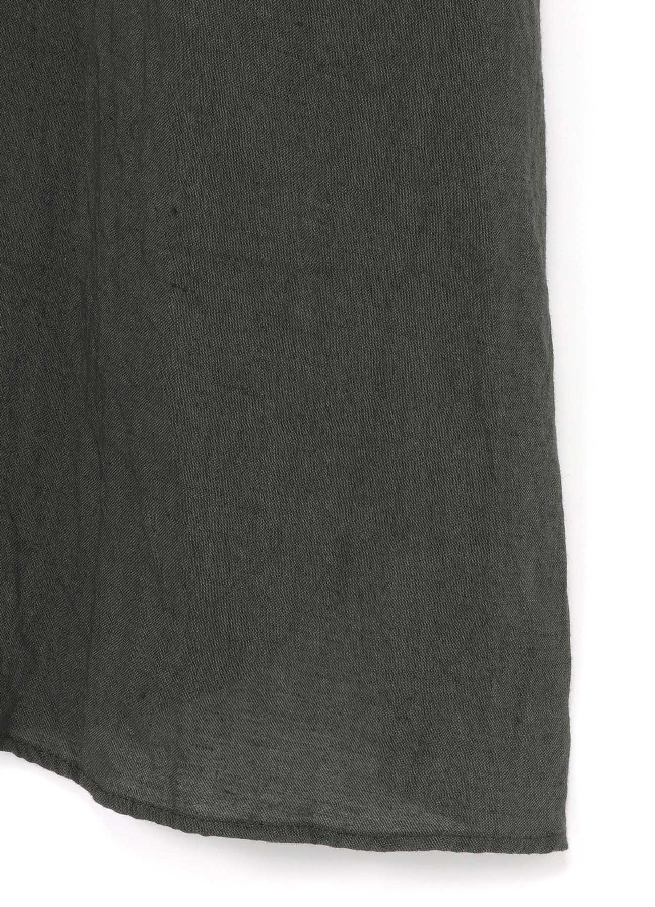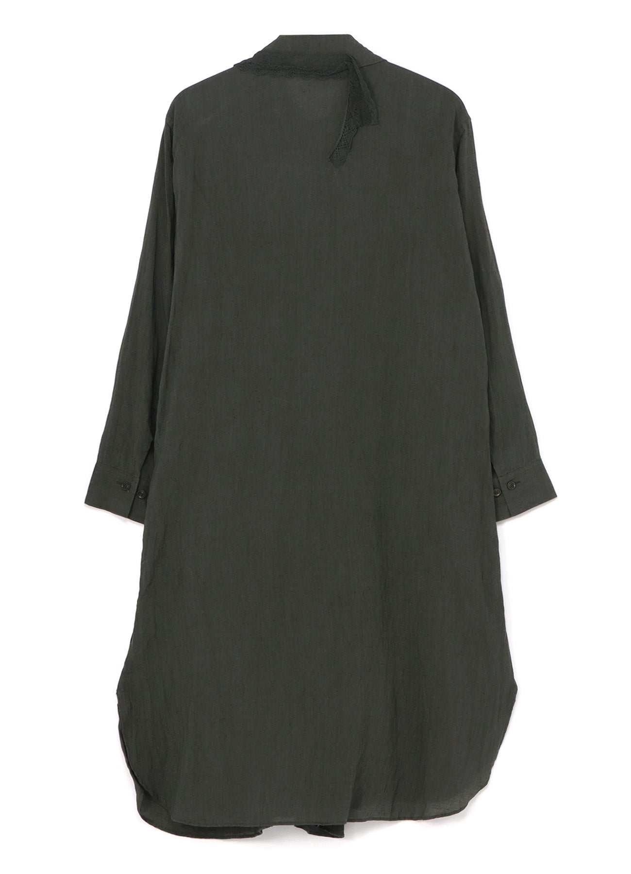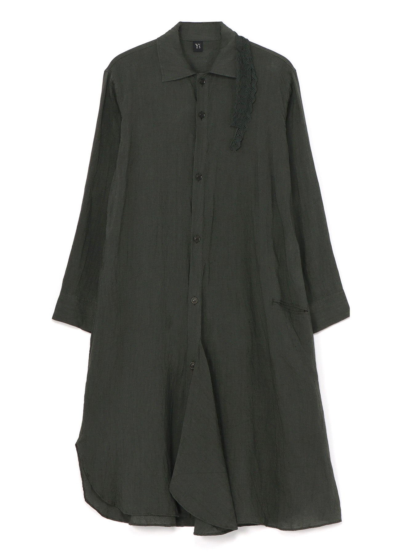 This linen front-drape dress features a fabric with a balance of resilience and a soft touch. Accented by lace combinations, it functions as both a dress and an open-front coat.