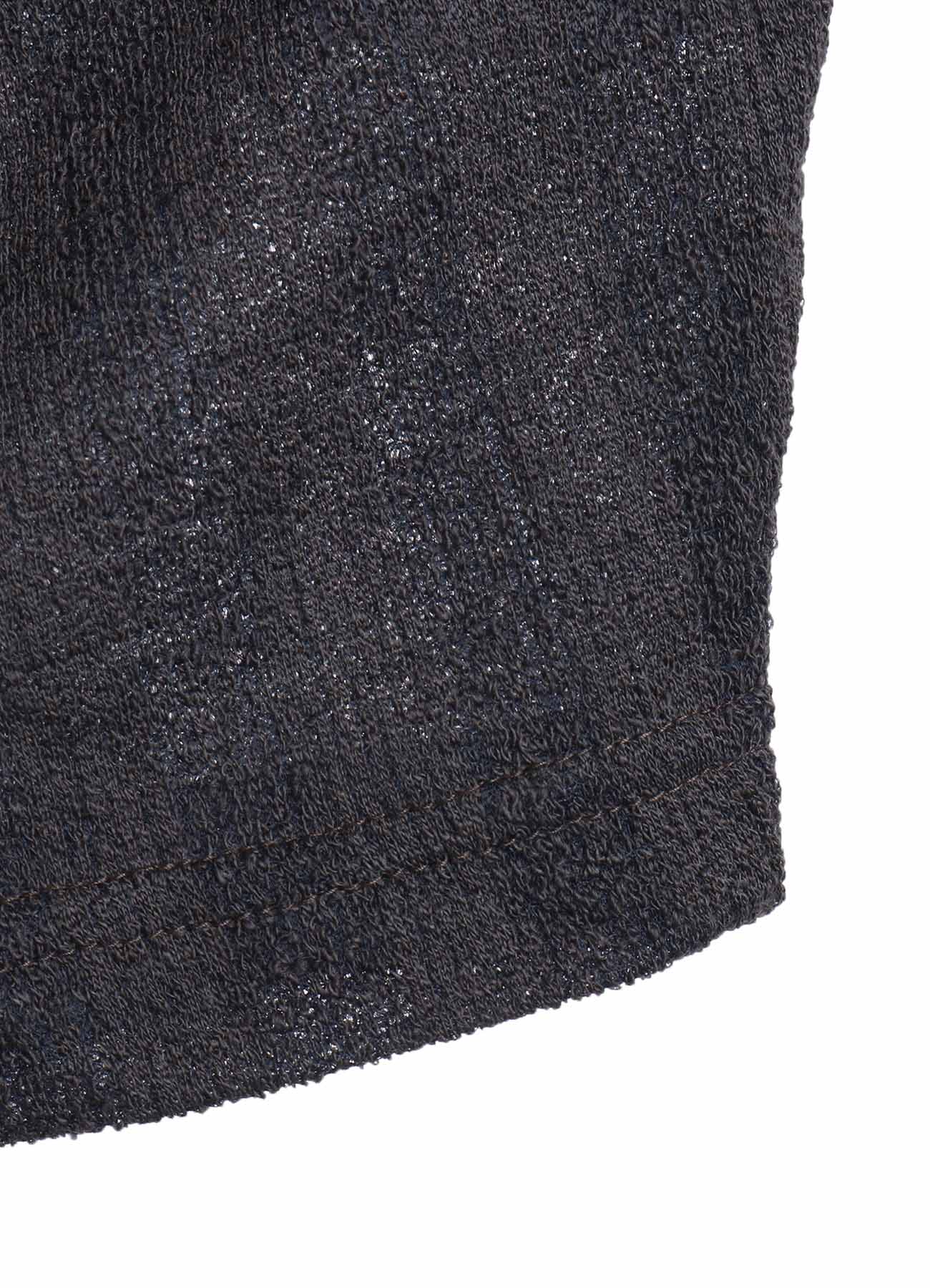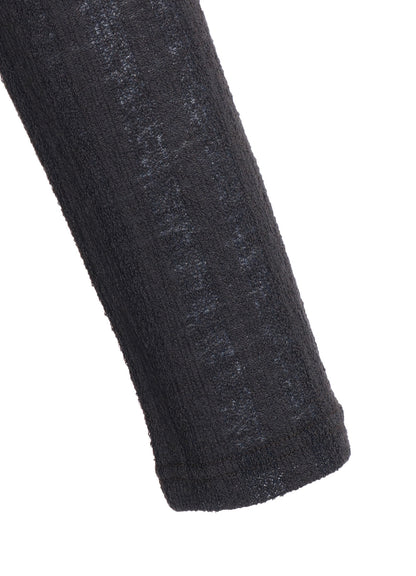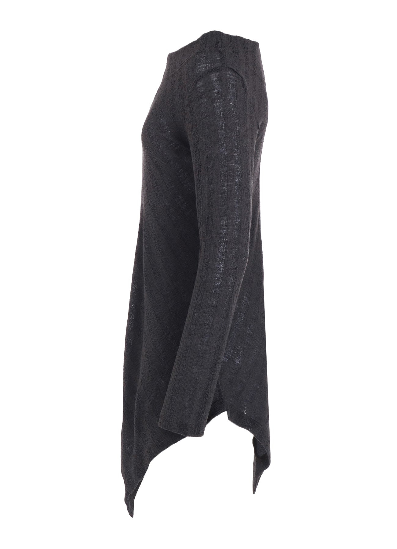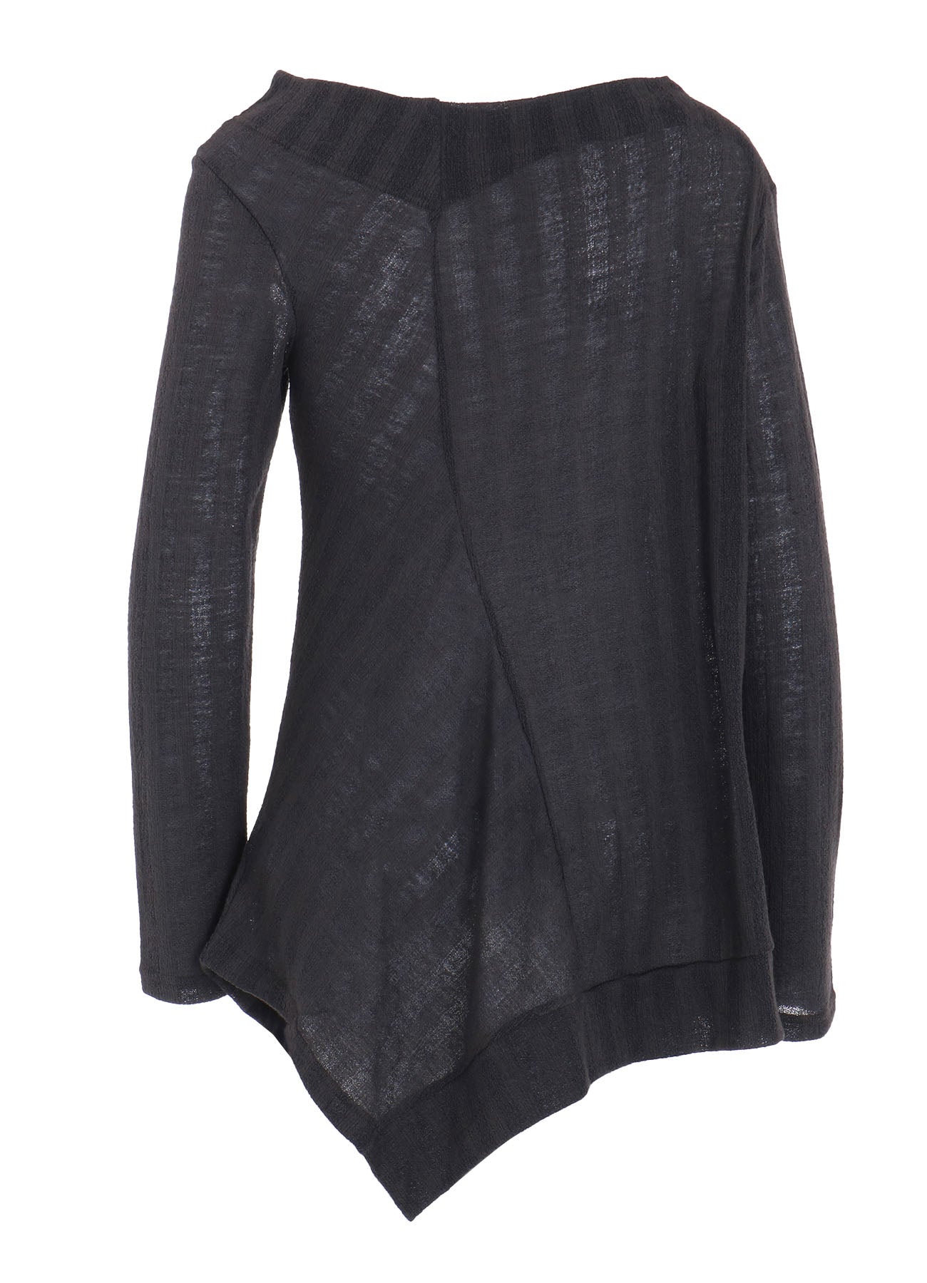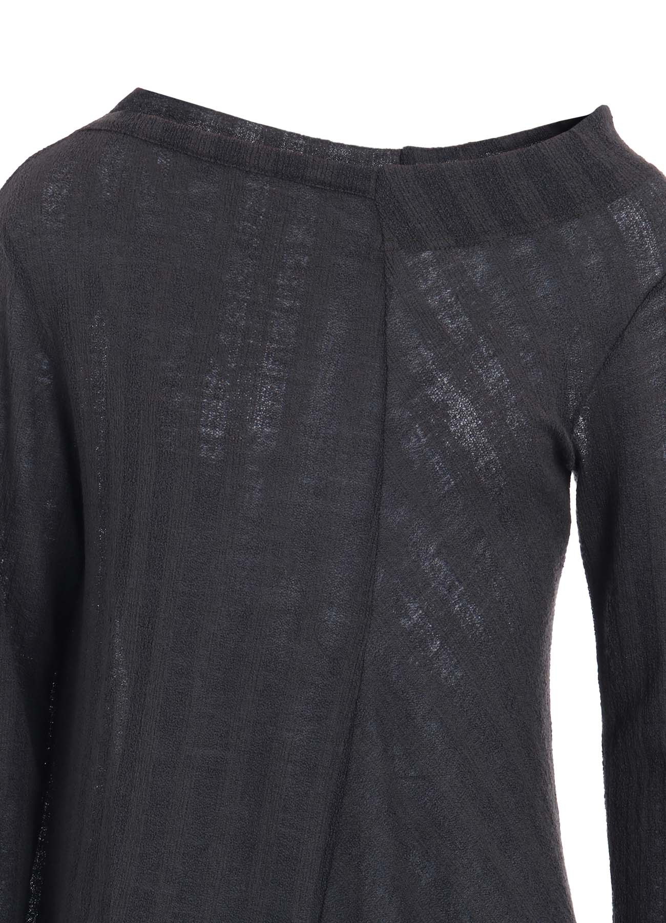This long-sleeved top features a unique transparent stripe jacquard weave and an asymmetric design. The top is tailored to fit closely to the body's silhouette, offering a sleek look. Its asymmetric collar design enhances its modern appeal, making it a versatile addition for layering or standalone wear.