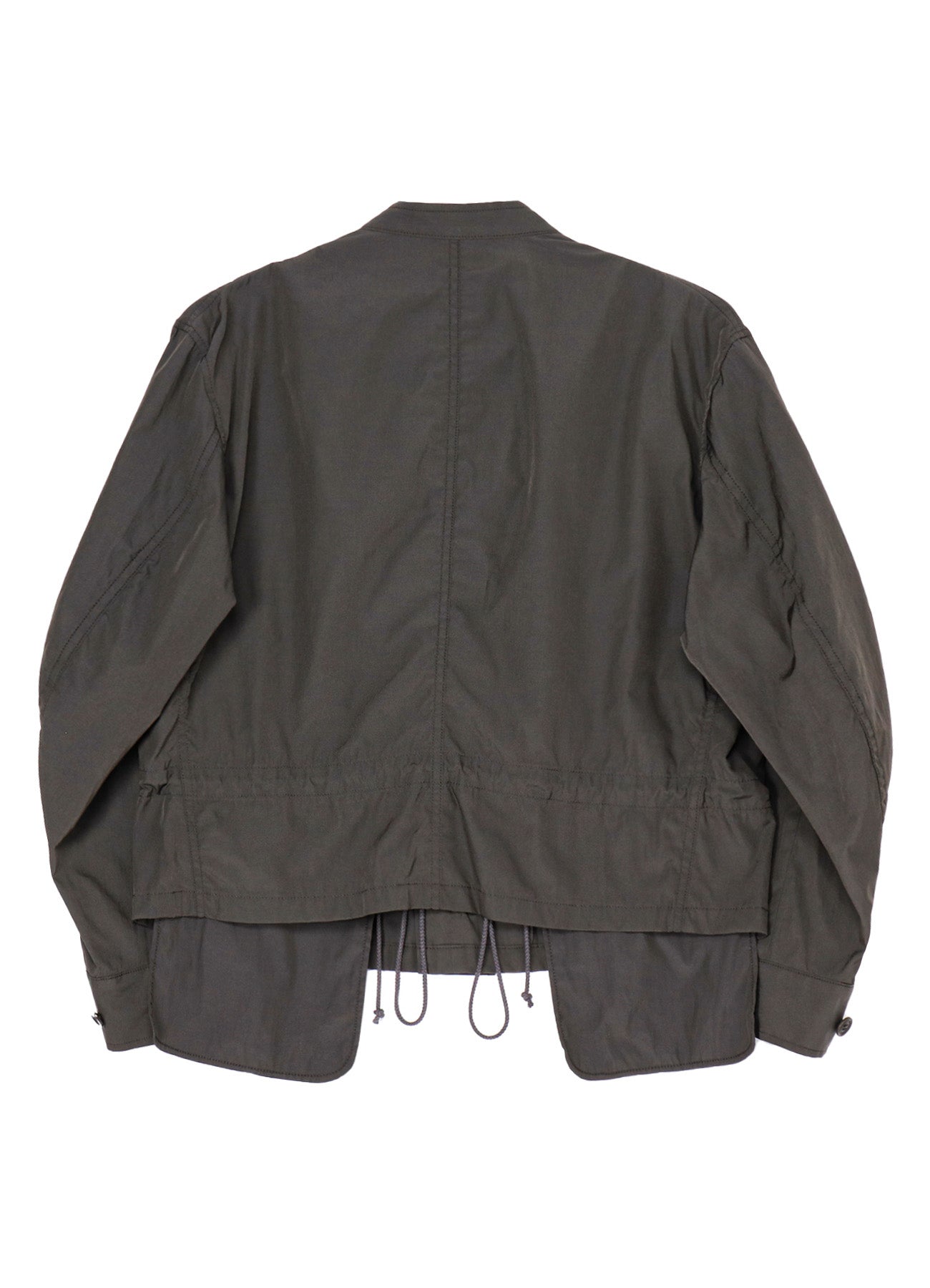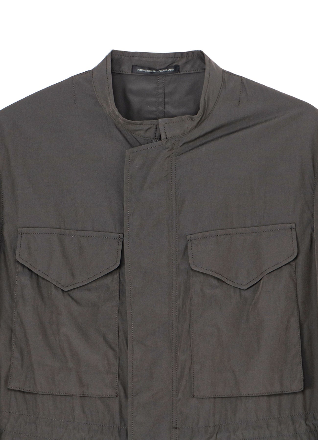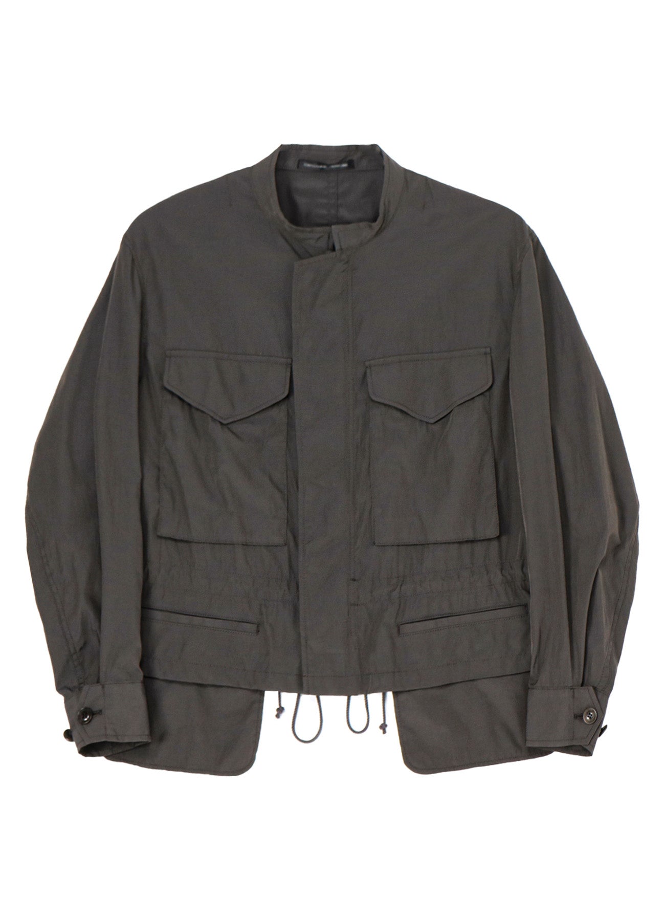 Lightweight short-length blouson with a smooth texture. Made from cotton, triacetate, and polyester twill, the material is perfect for hot weather. Inspired by military field jackets, it features a stand collar and shorter length for a sporty, casual look. The four characteristic pockets' visible pocket bags add a distinct accent.