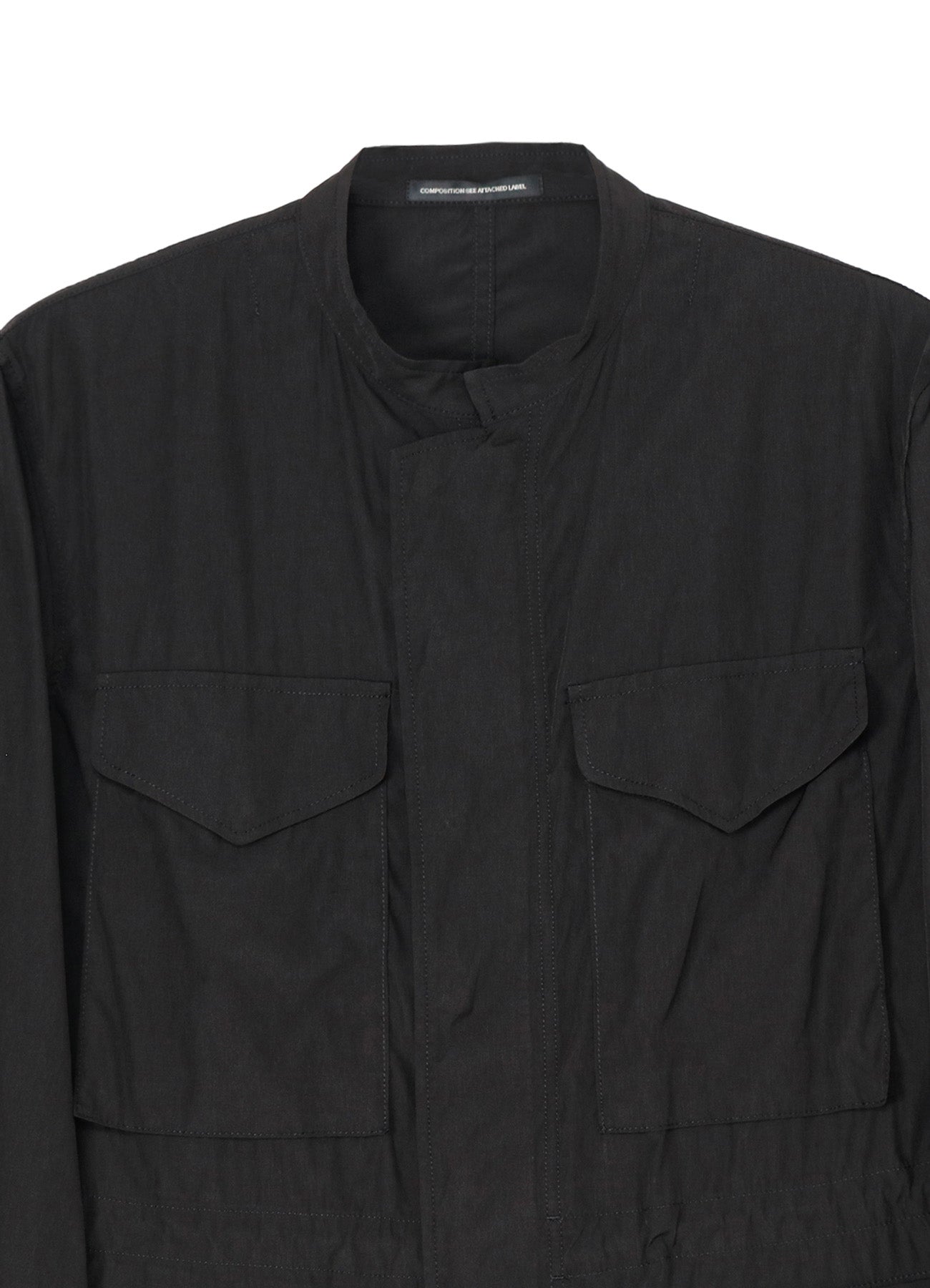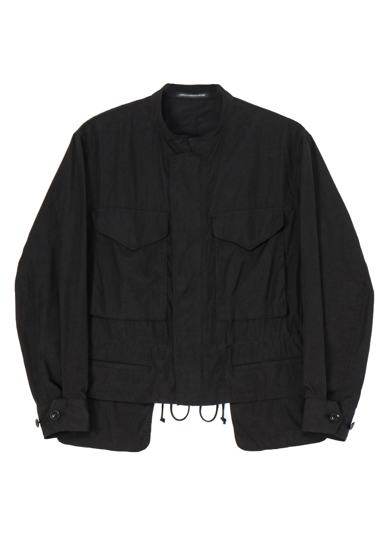Lightweight short-length blouson with a smooth texture. Made from cotton, triacetate, and polyester twill, the material is perfect for hot weather. Inspired by military field jackets, it features a stand collar and shorter length for a sporty, casual look. The four characteristic pockets' visible pocket bags add a distinct accent.