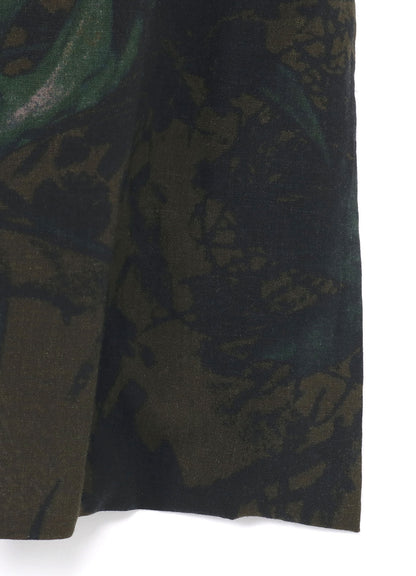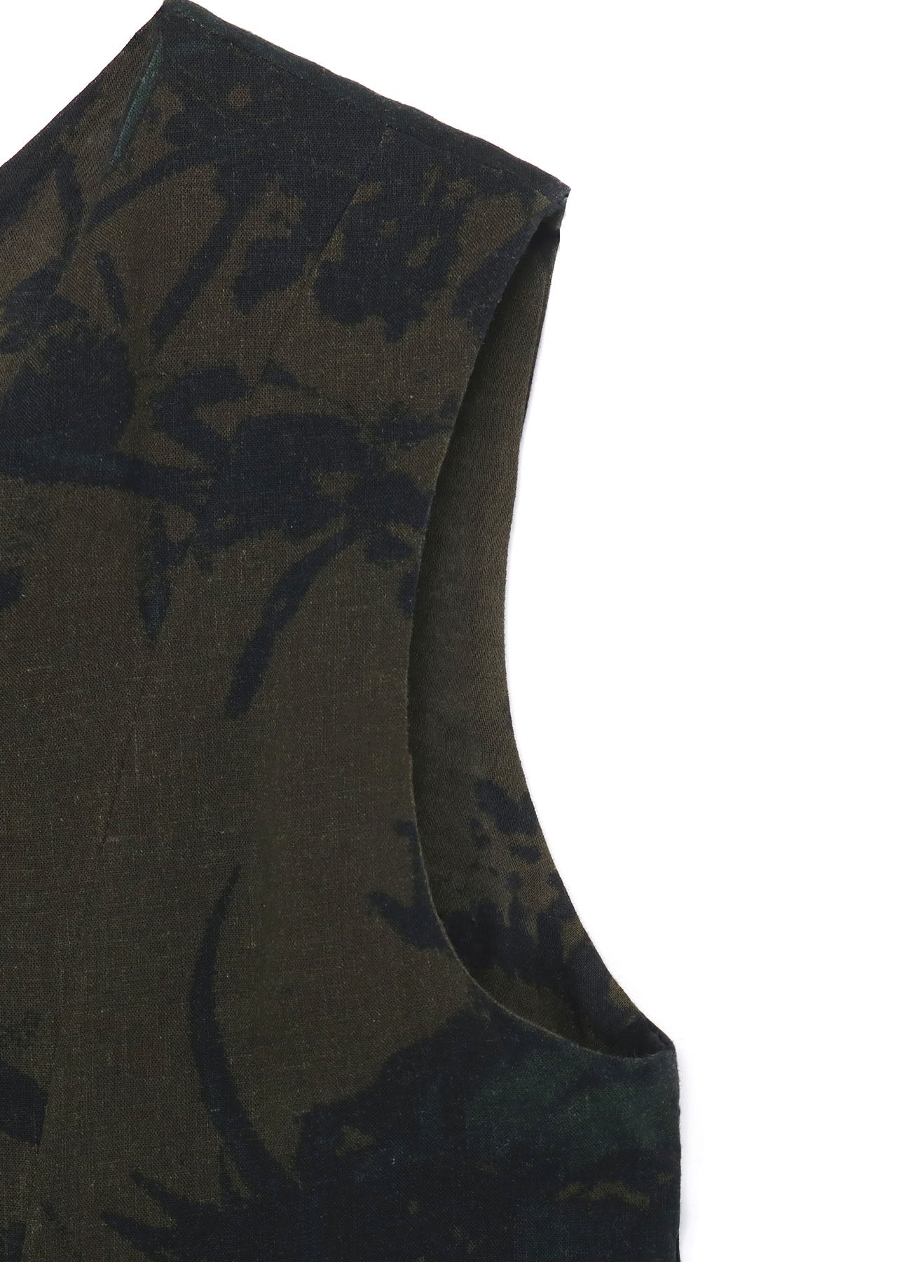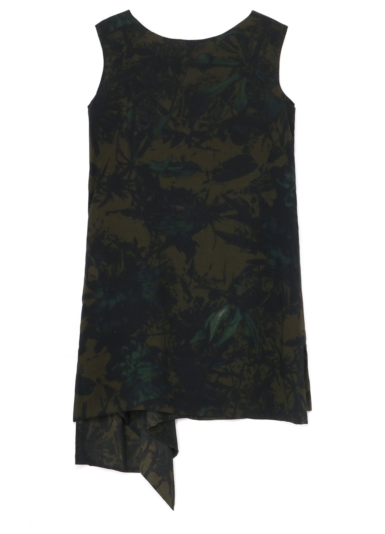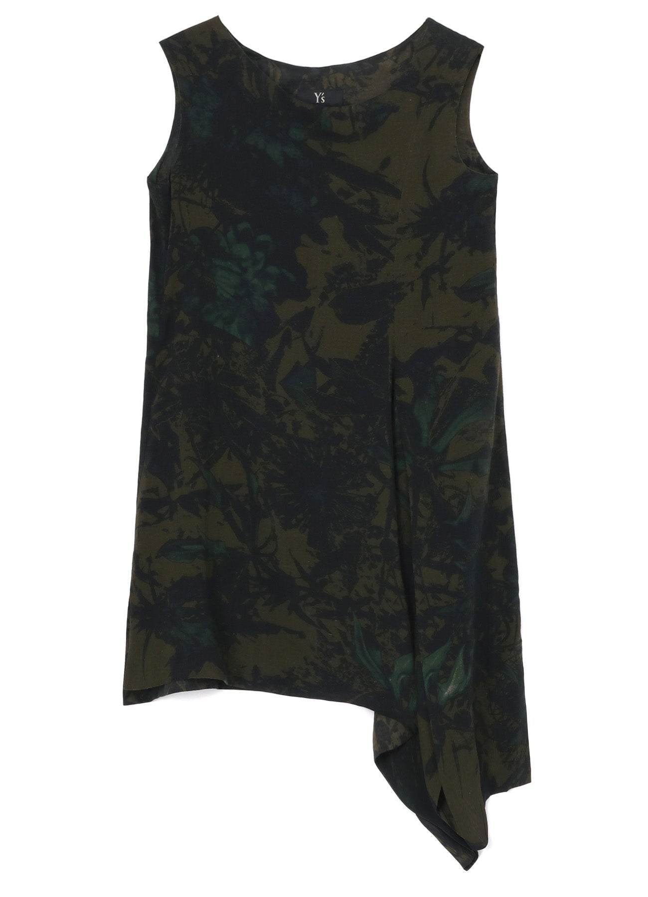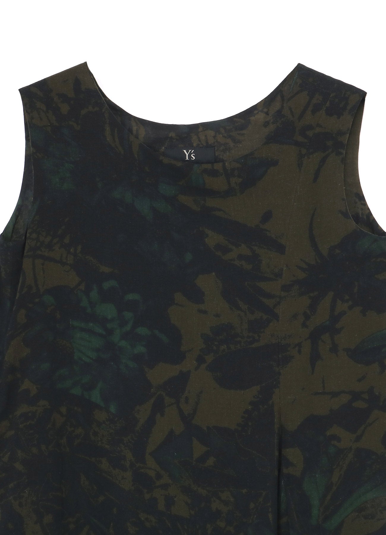 A sleeveless blouse featuring a withered flower motif print. It’s crafted from a soft, voluminous material by sewing with less tension than usual. The front slit gives it a unique drape, creating a simple yet dynamic silhouette.