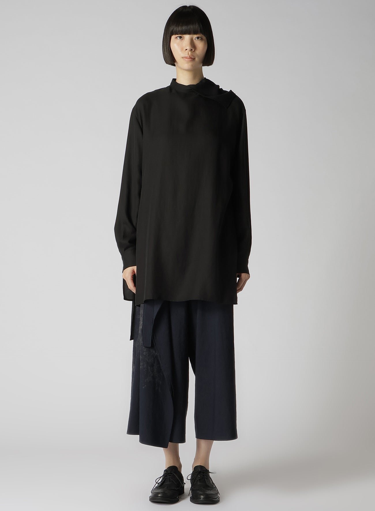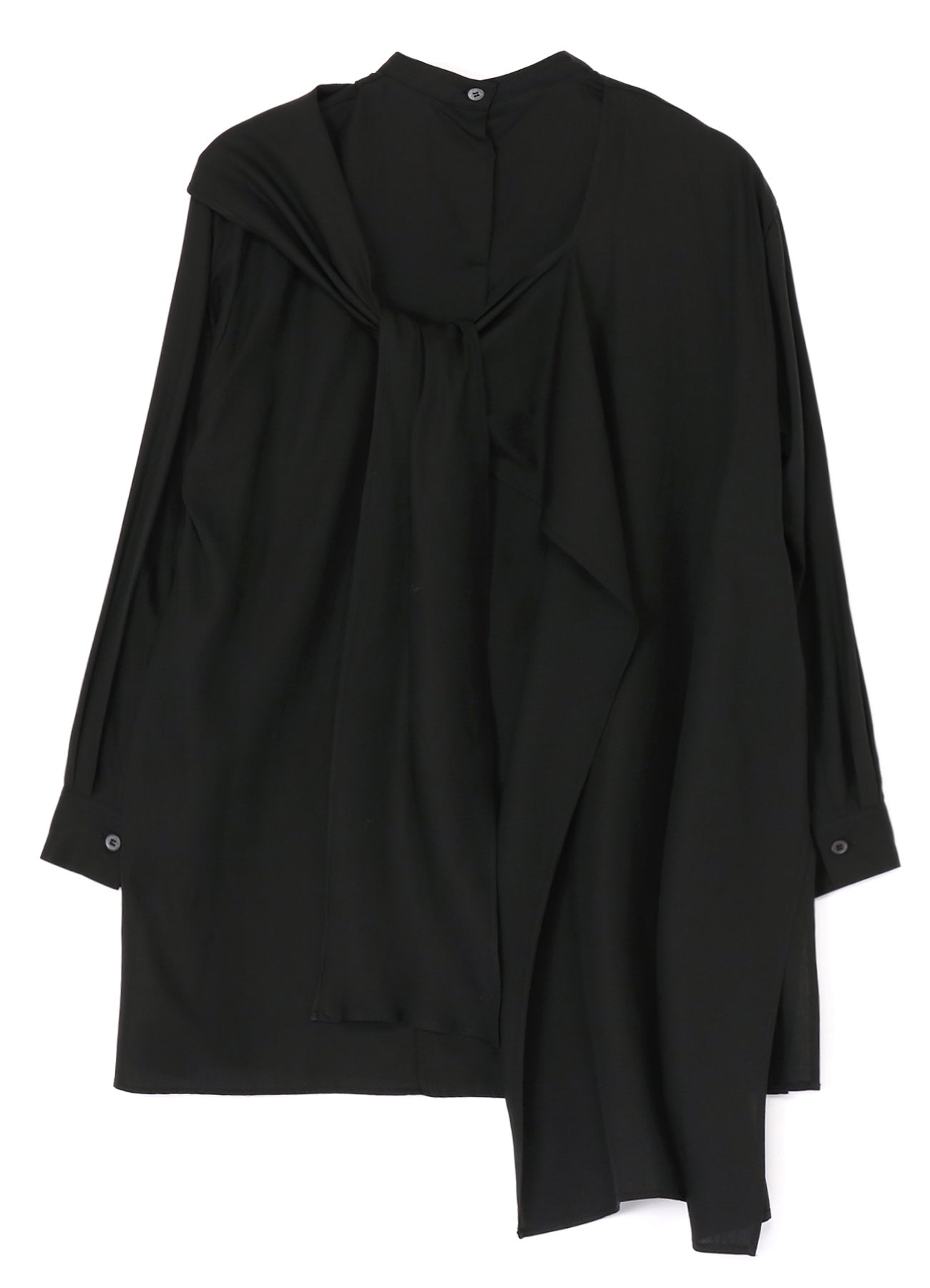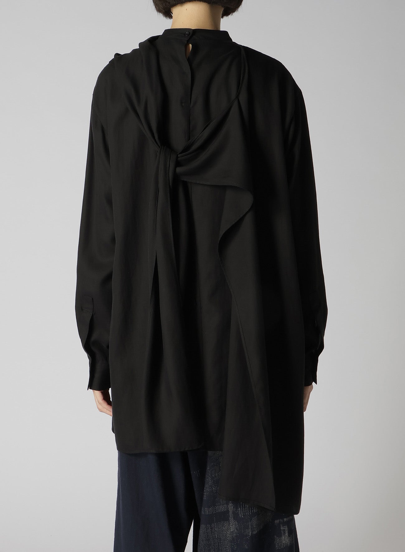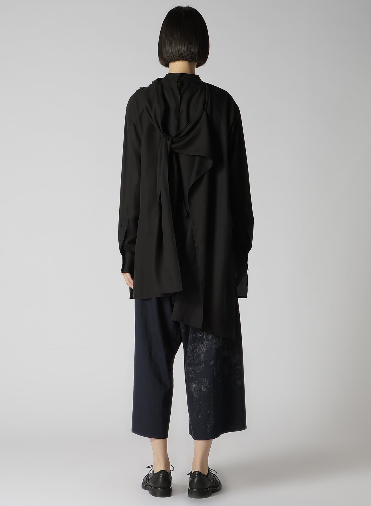 This back-tie blouse features a soft and airy feel thanks to its Viyella fabric. The design includes a tieable ribbon that emerges from the collar and back, which can be styled in various ways, including letting it drape like a scarf. Enjoy the flexible styling options this piece offers.
