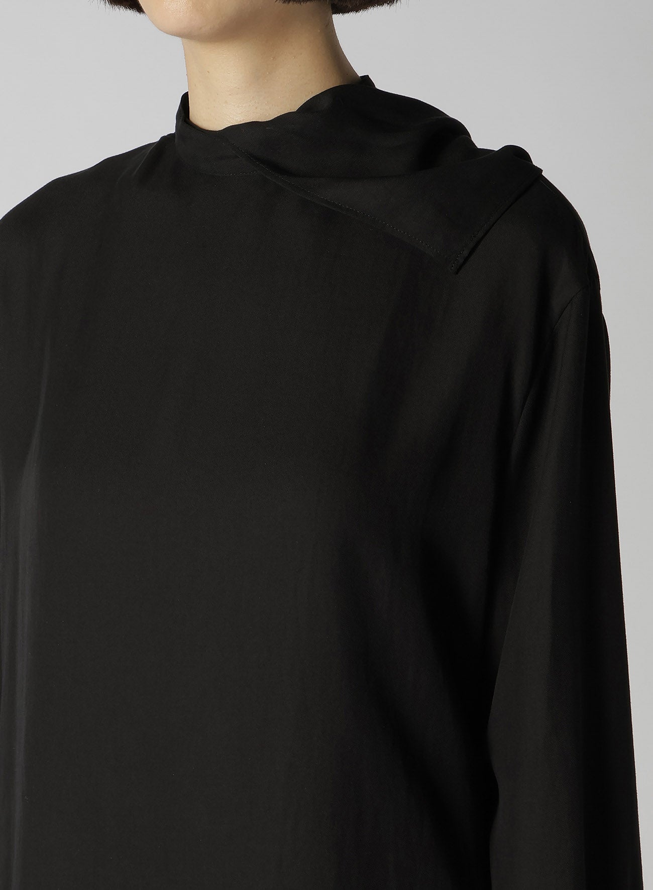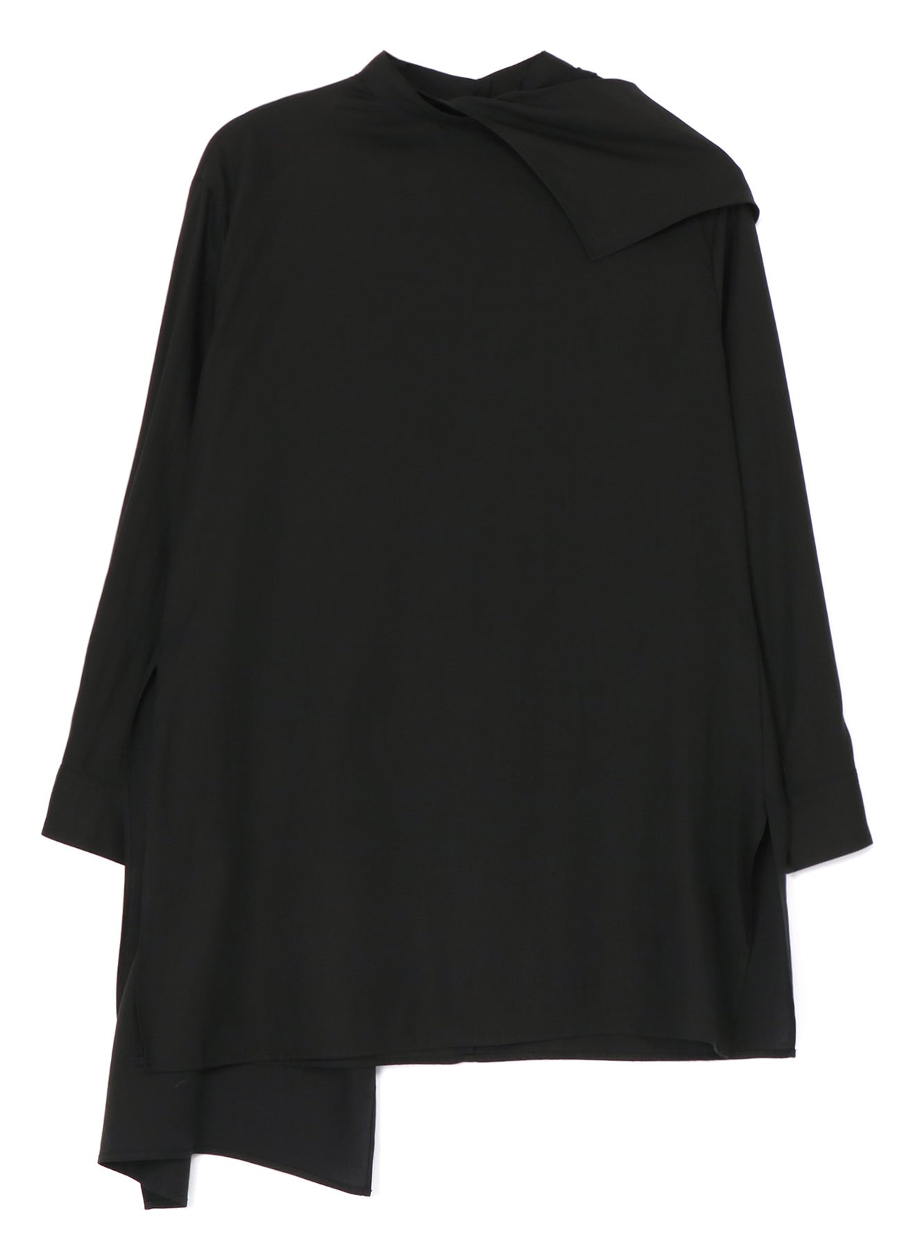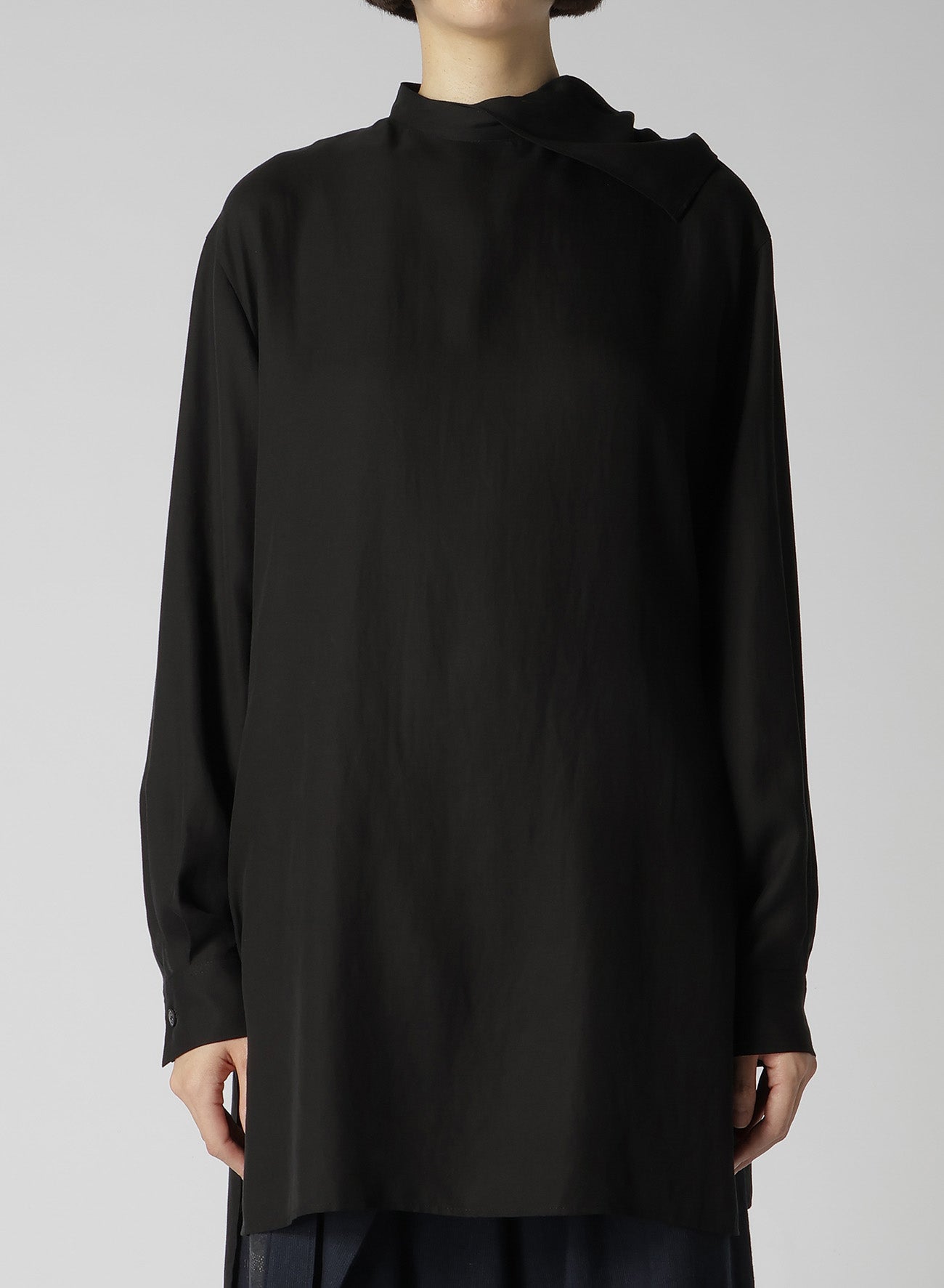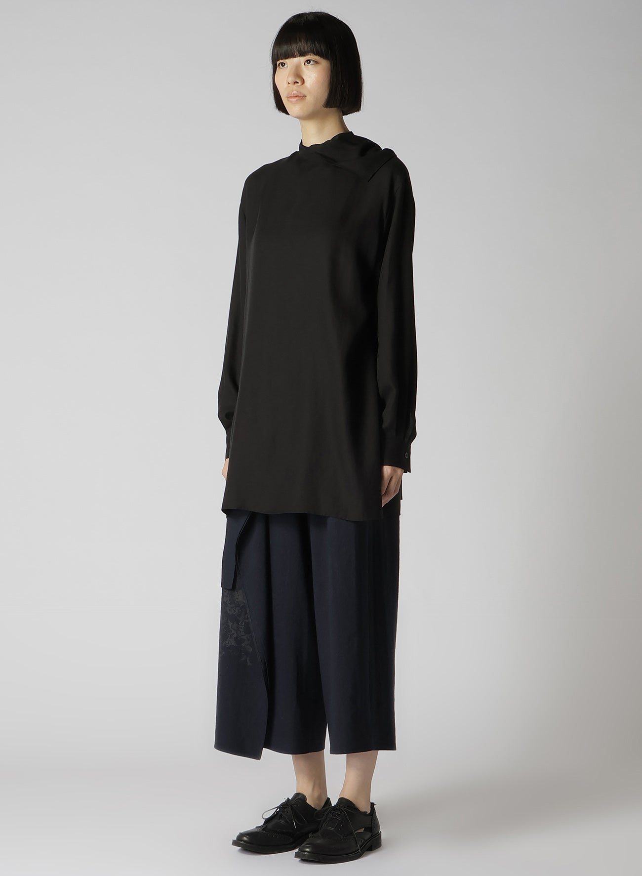 This back-tie blouse features a soft and airy feel thanks to its Viyella fabric. The design includes a tieable ribbon that emerges from the collar and back, which can be styled in various ways, including letting it drape like a scarf. Enjoy the flexible styling options this piece offers.