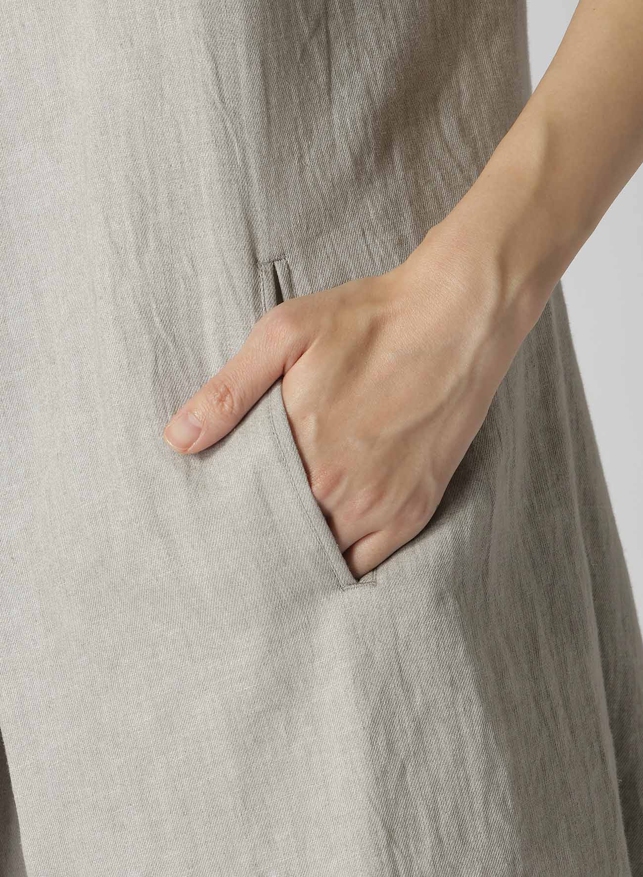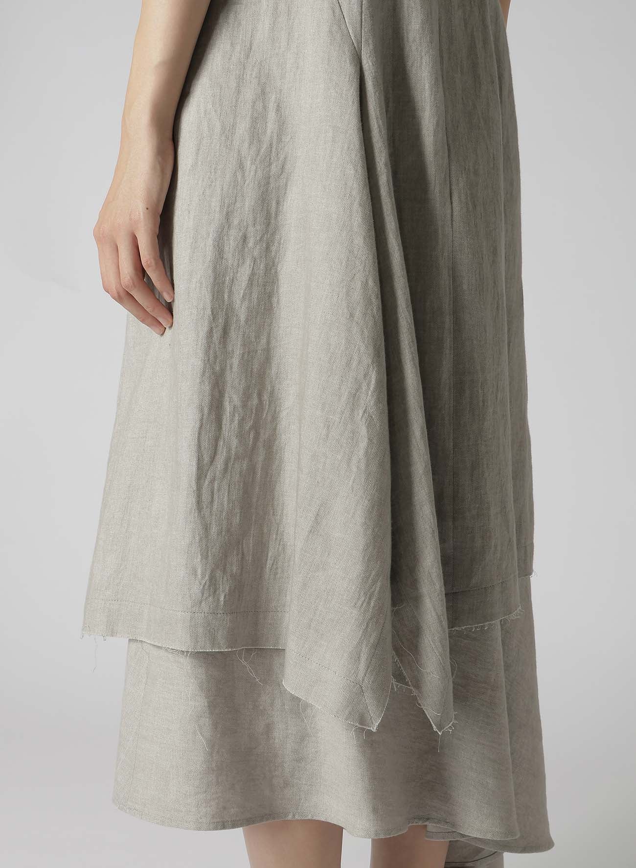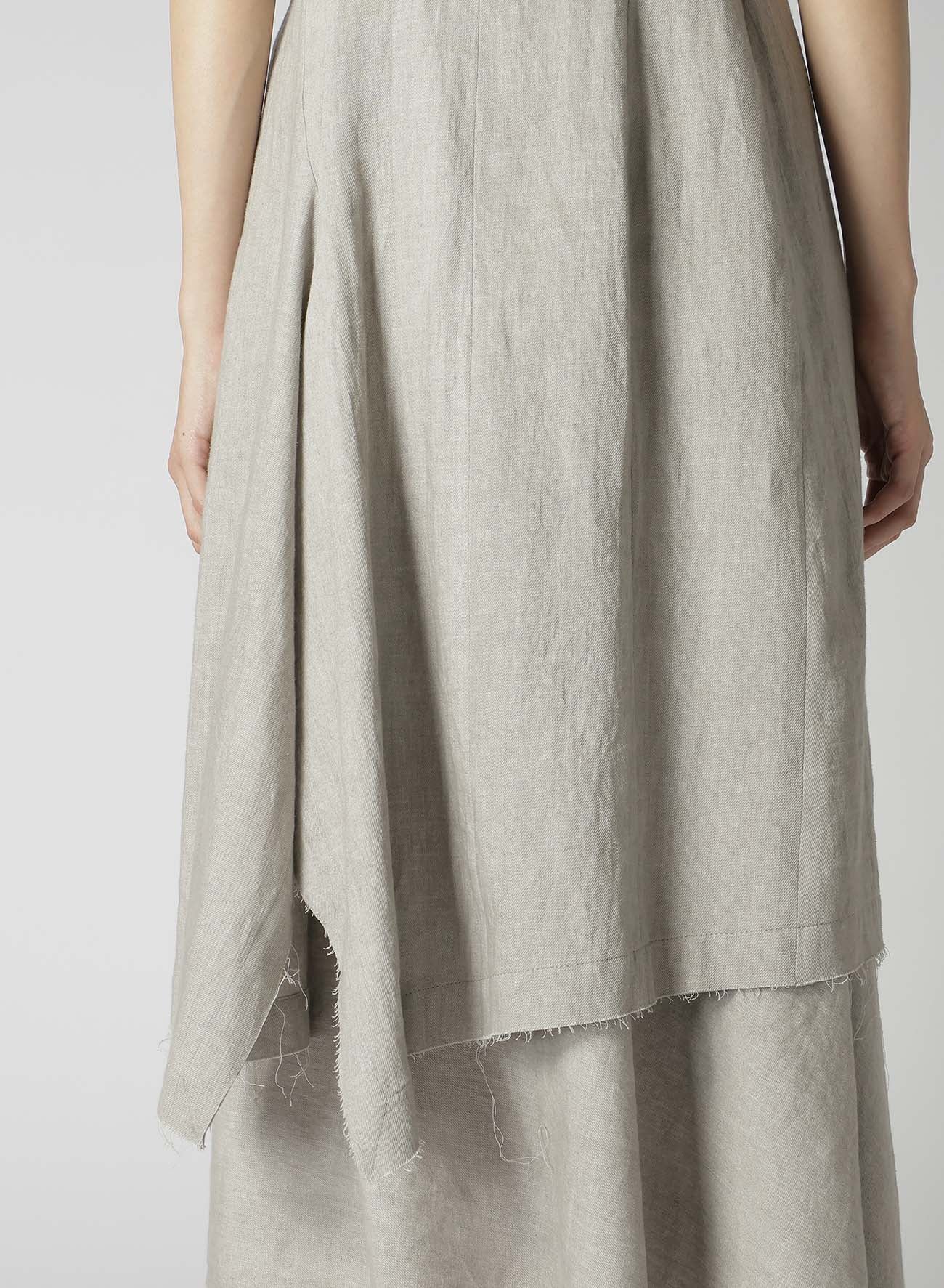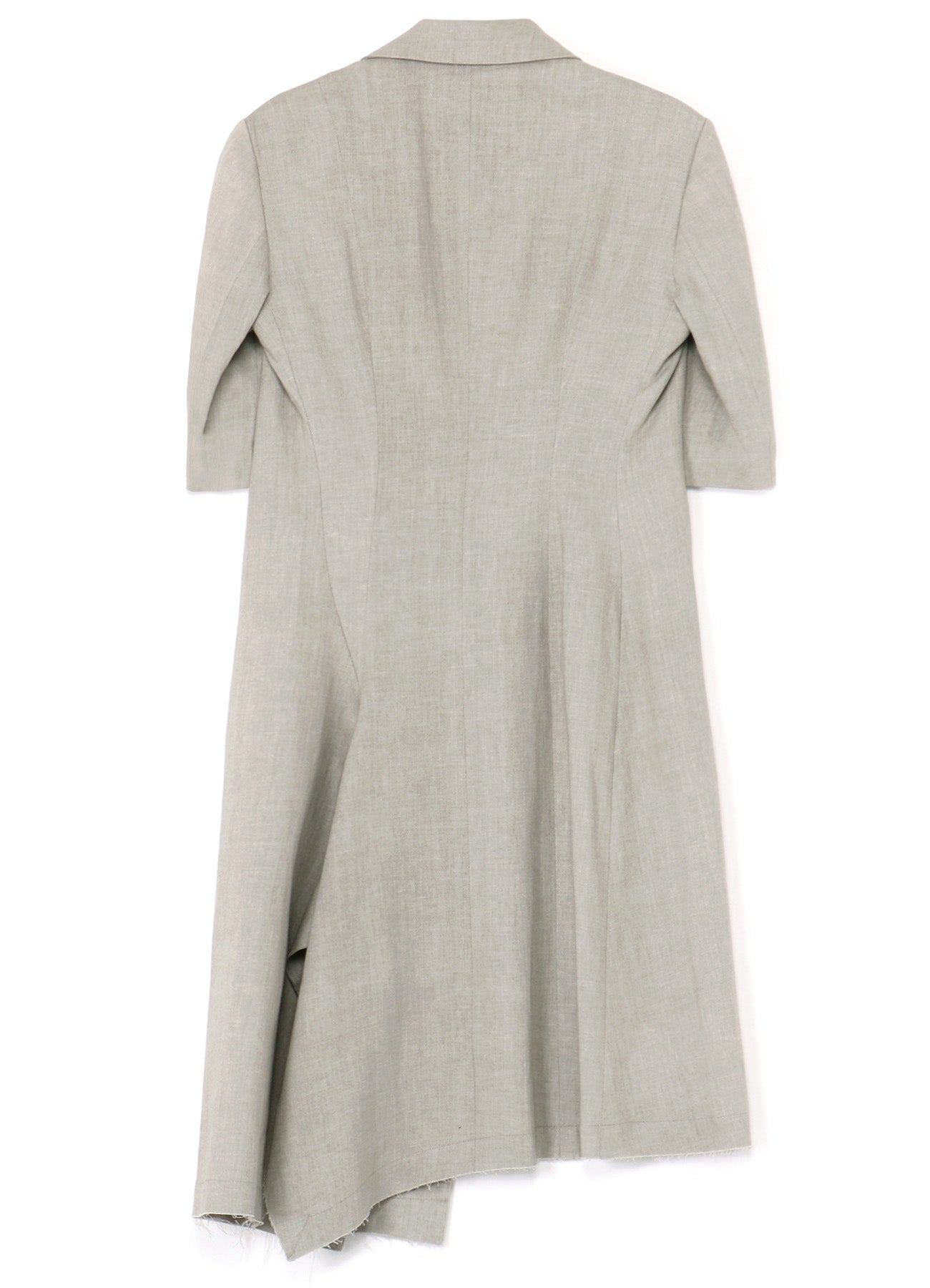 This short-sleeved denim jacket is crafted from a blend of cotton and linen, ideal for summer. It features an ink-dyed process and natural finish through sun-drying. Key design elements include a handkerchief hem flowing from front to back and unique drapery from the back panel. The raw-edged hem adds a distressed look.