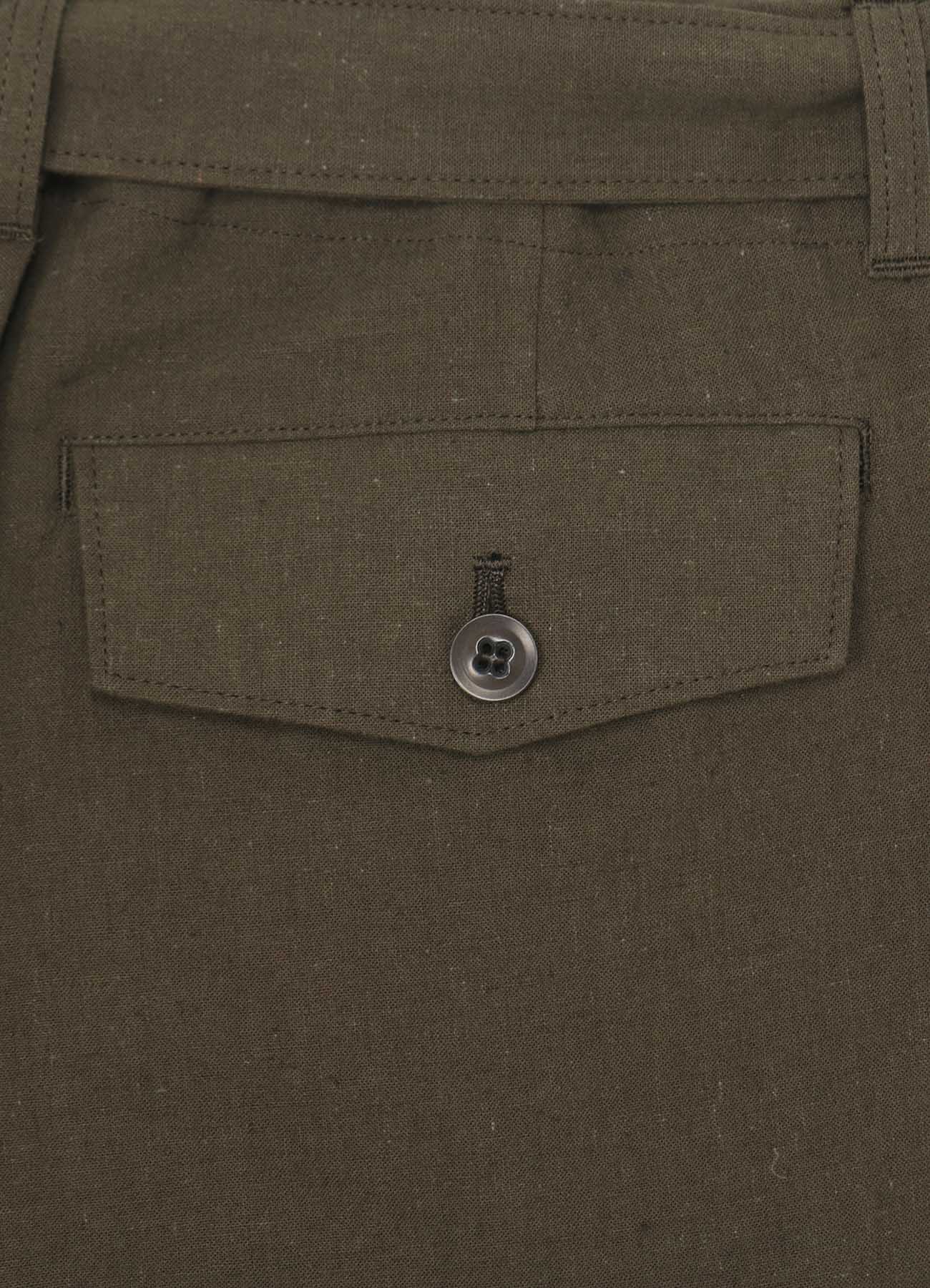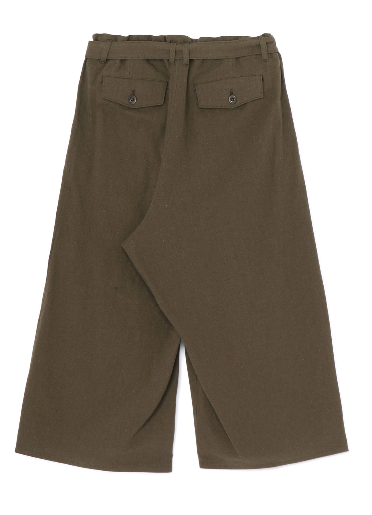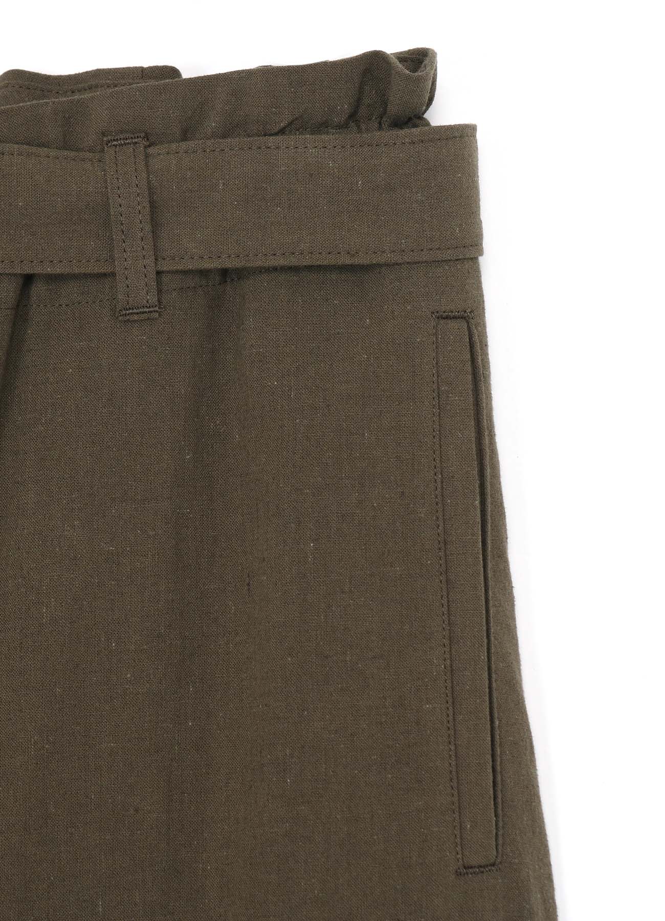 Organic cotton and linen blend pants featuring a unique asymmetric design with a decorative flap on one side. Crafted with a special soft-wash process and sun-drying, resulting in a natural and voluminous texture. The waist is adjustable with an elastic band and a belt.