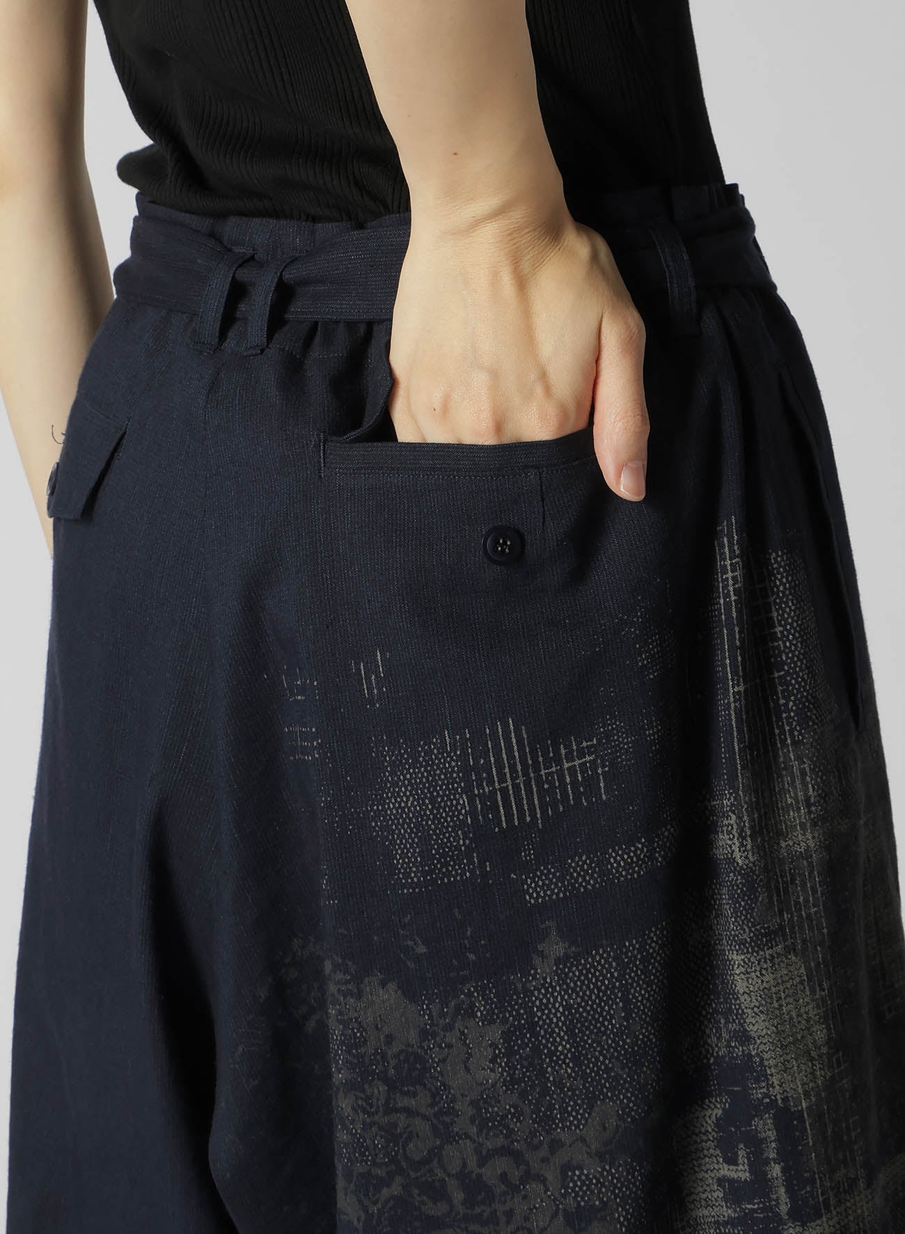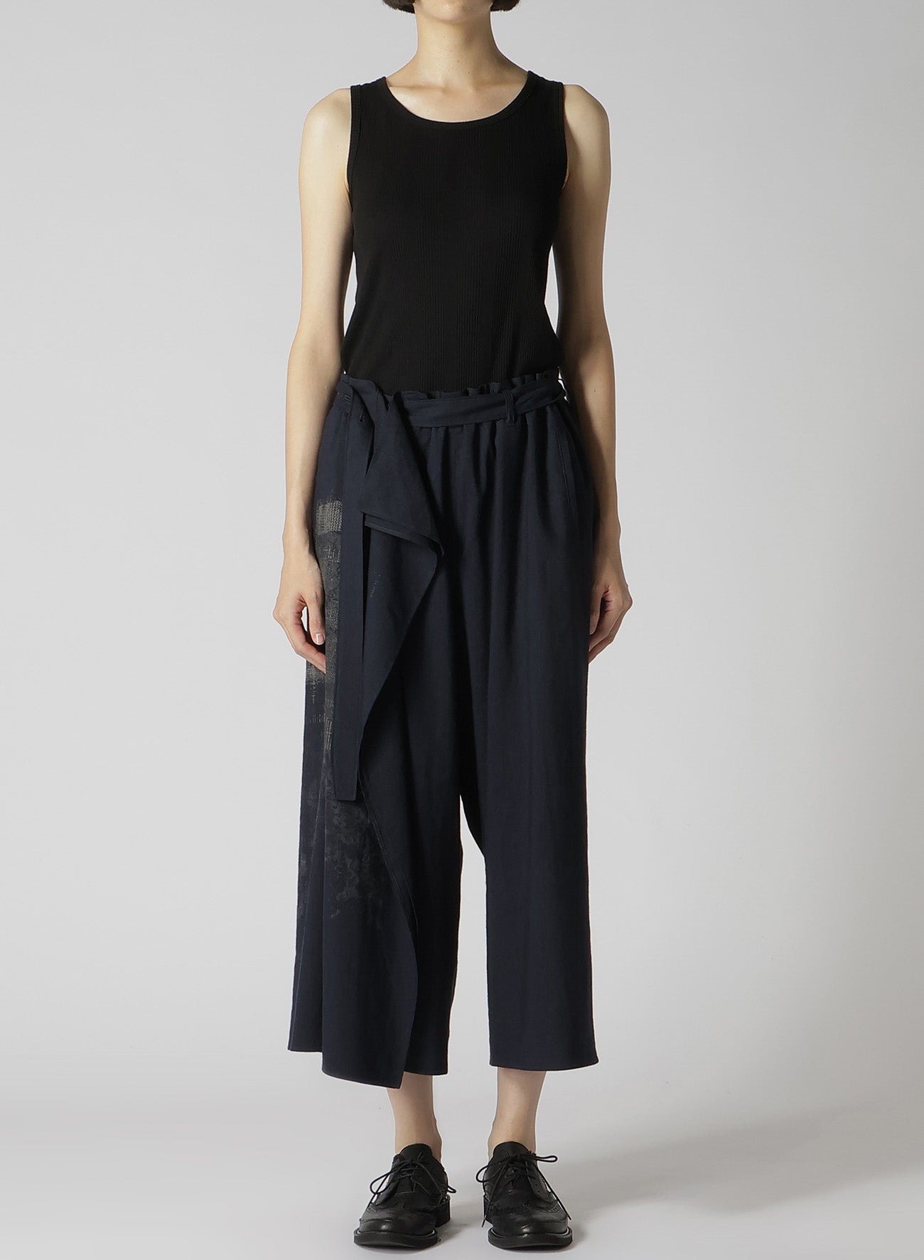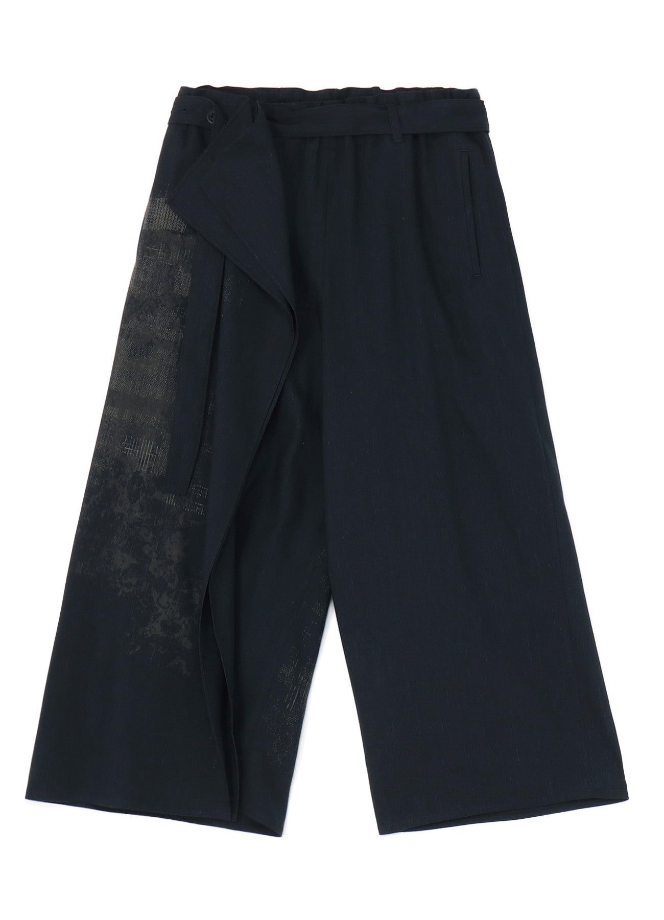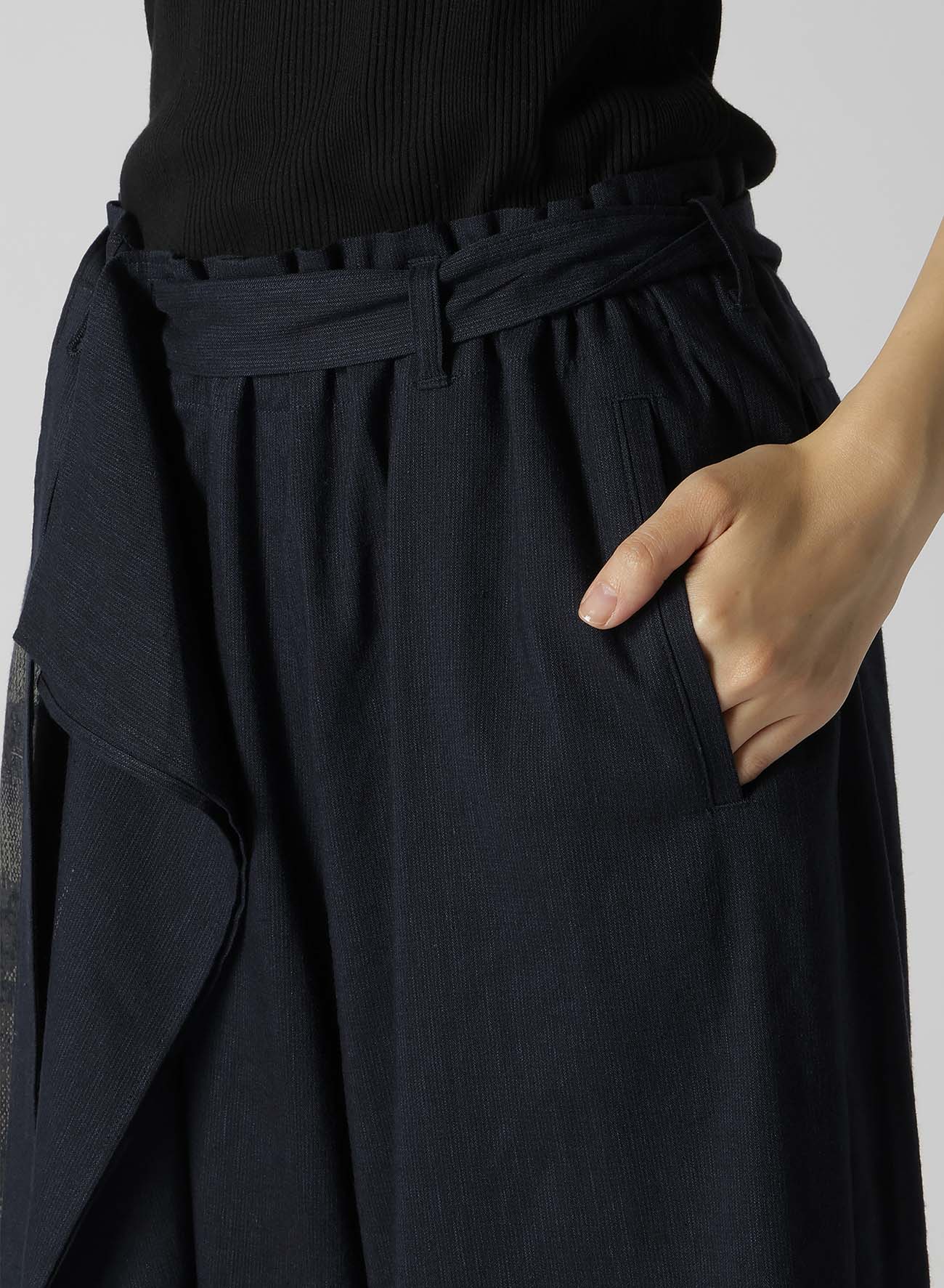 This item features pants with a bold houndstooth pattern and a belt to cinch the waist. The material offers a natural feel and a drapery effect, with a floating part on the right side that sways and reveals the leg through a slit, creating a breezy look. Enjoy the subtle yet signature design balance.