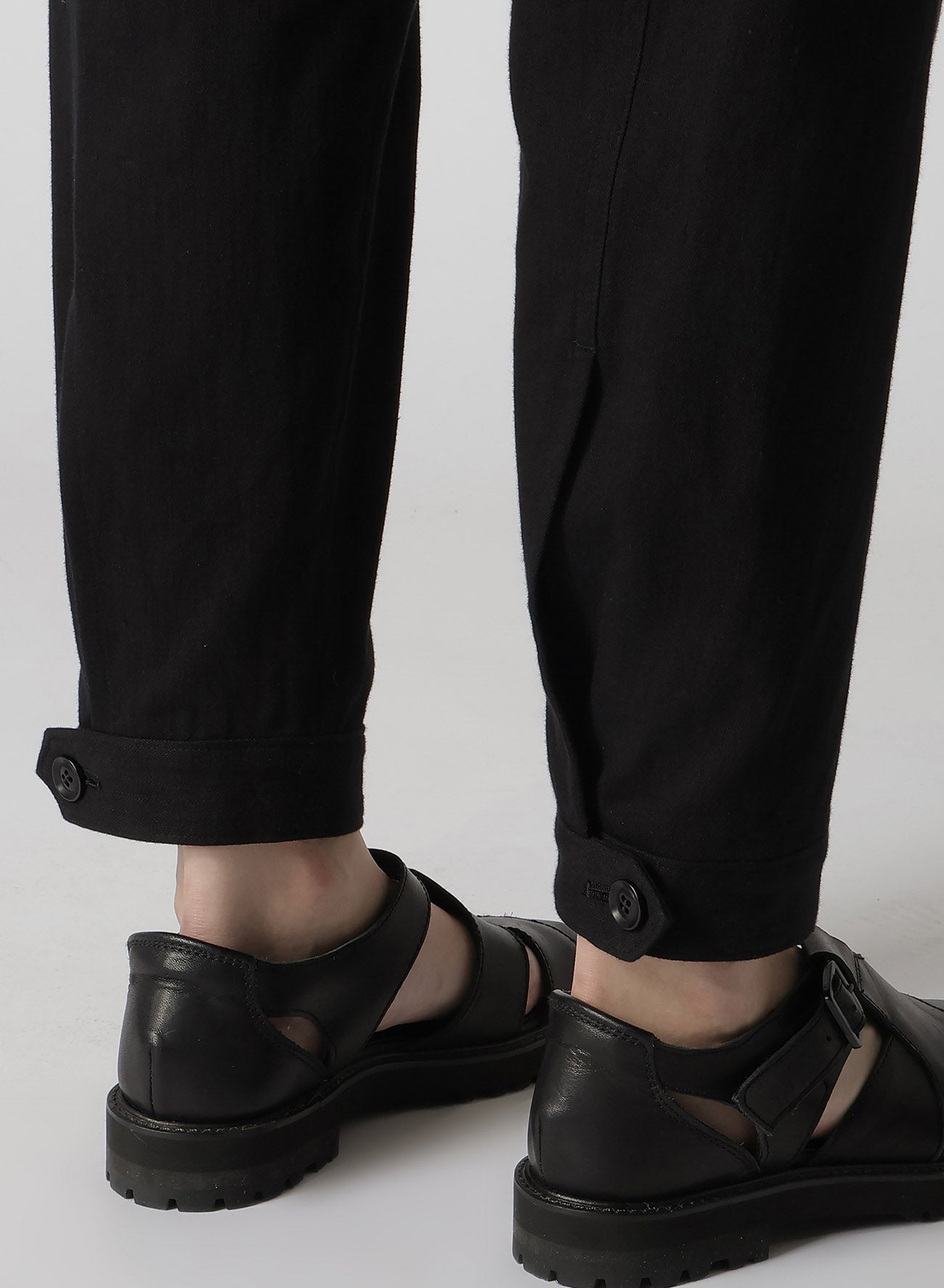 コットンツイル素材のサルエルパンツ。毛羽の少ないコーマ糸を使用しており、しなやかで柔らかい表情に仕上がっています。股下にたっぷりとしたシルエットを表現しつつ、全体は細身ですっきりとした印象に。裾にはカフスが施されており、そのサイズ調整が可能です。