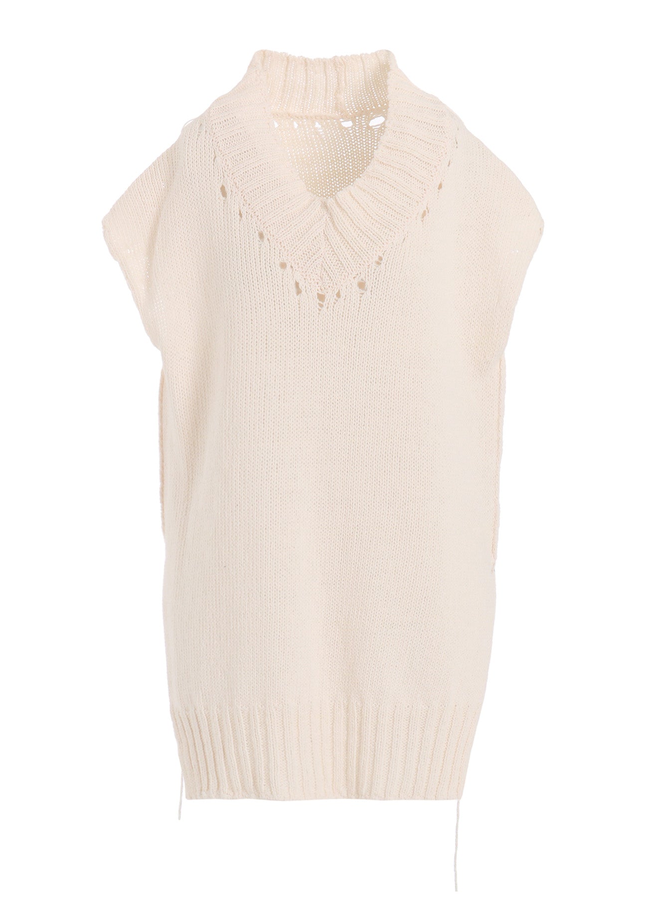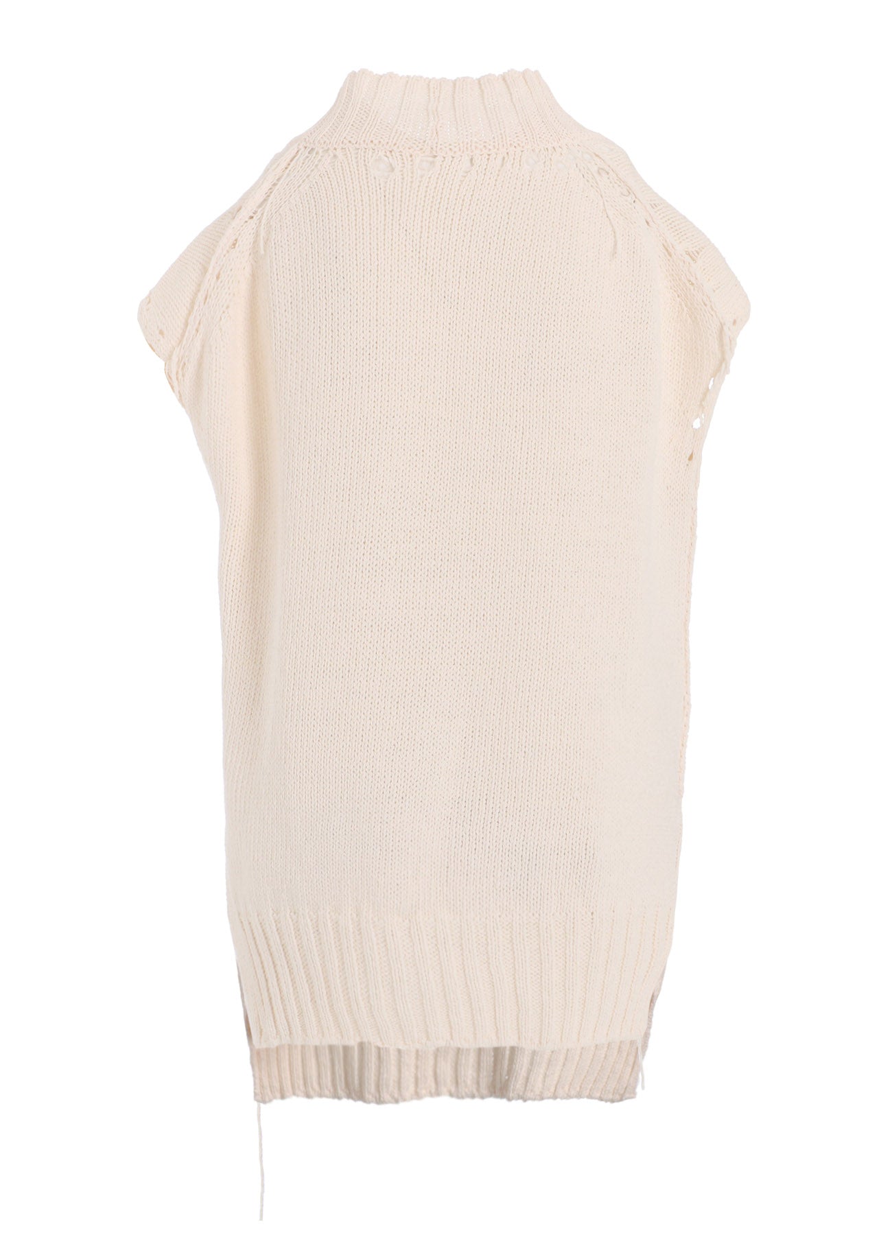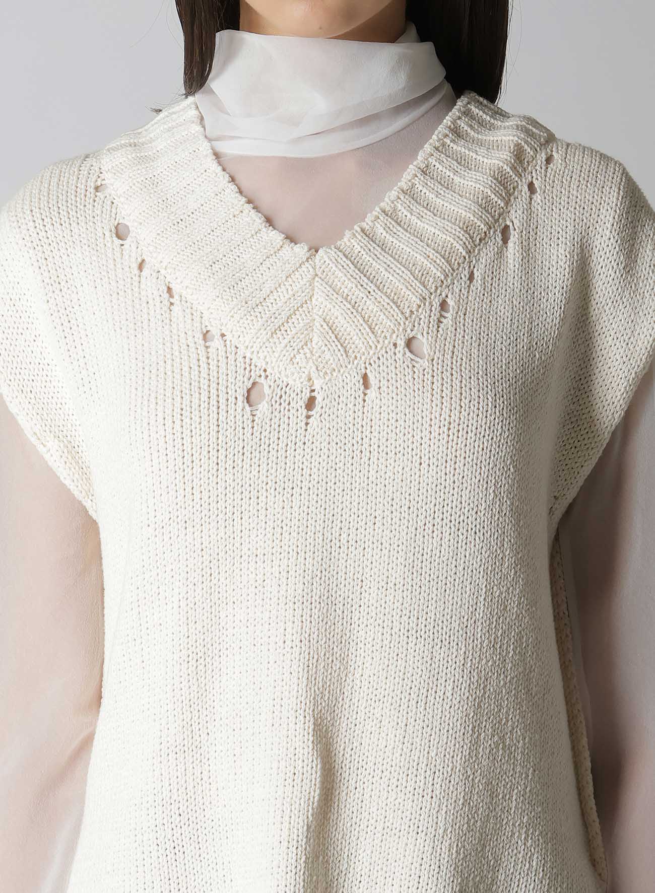 This cotton knit vest is designed with exposed seams and intentionally left thread ends for a unique accent. It's perfect for layering over a blouse or top for a stylish outfit.