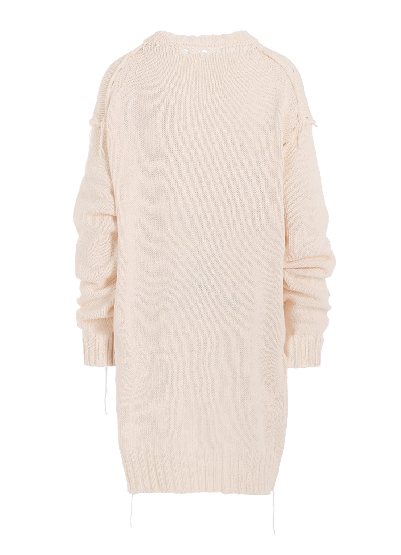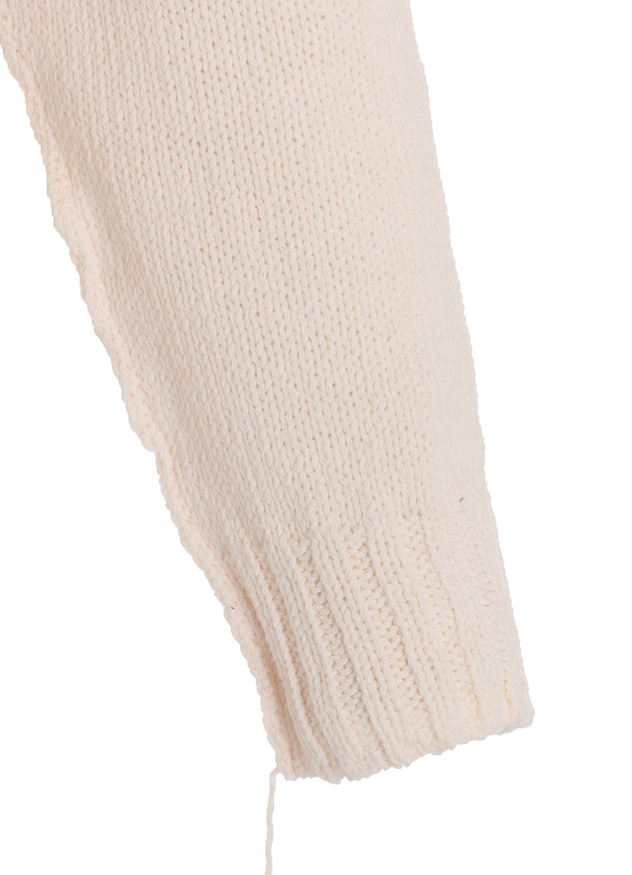 An oversized cotton knit pullover featuring exposed seams and deliberately left yarn ends as accents. Suitable for all genders, the relaxed fit offers comfort and a unique style.