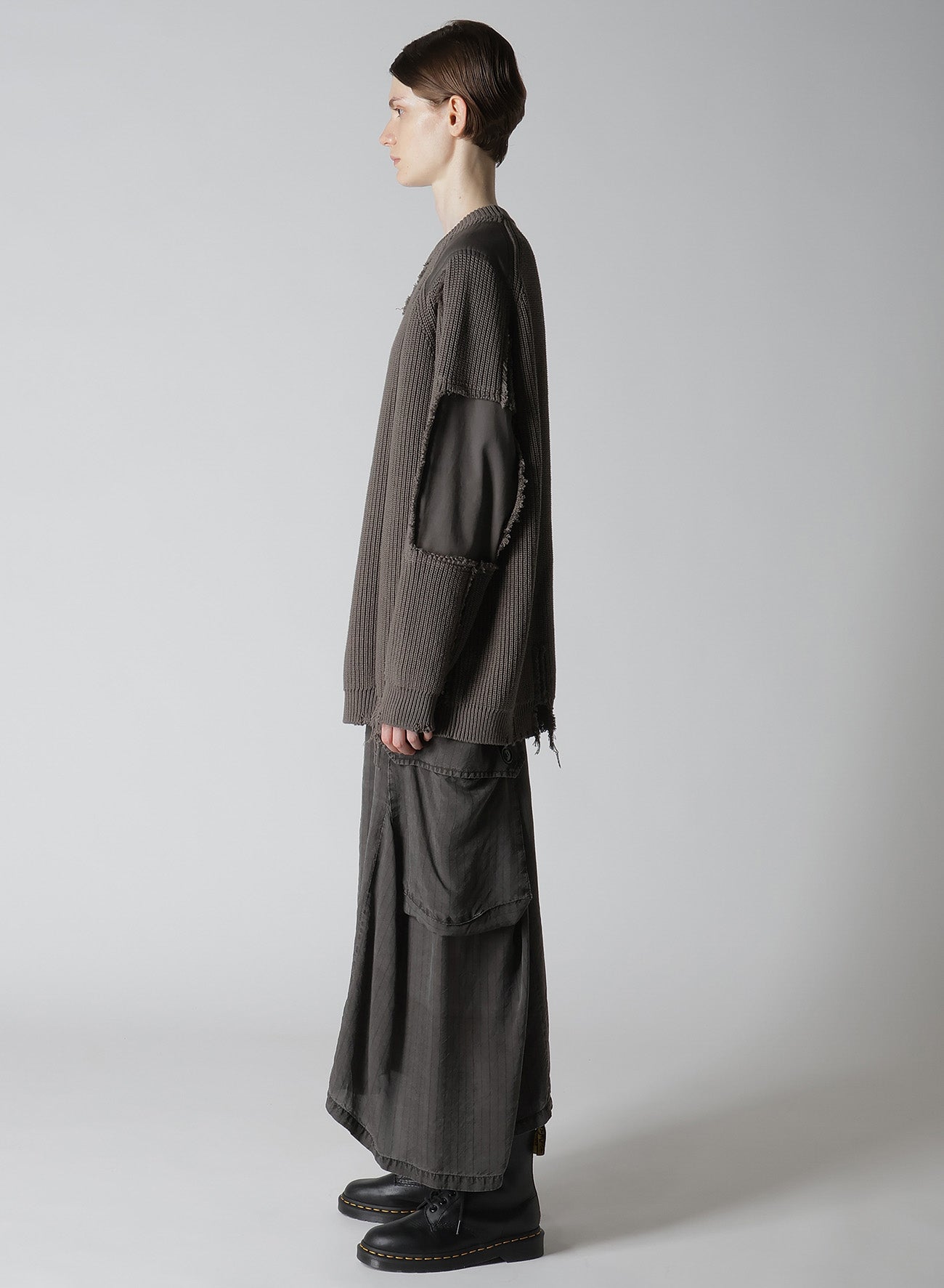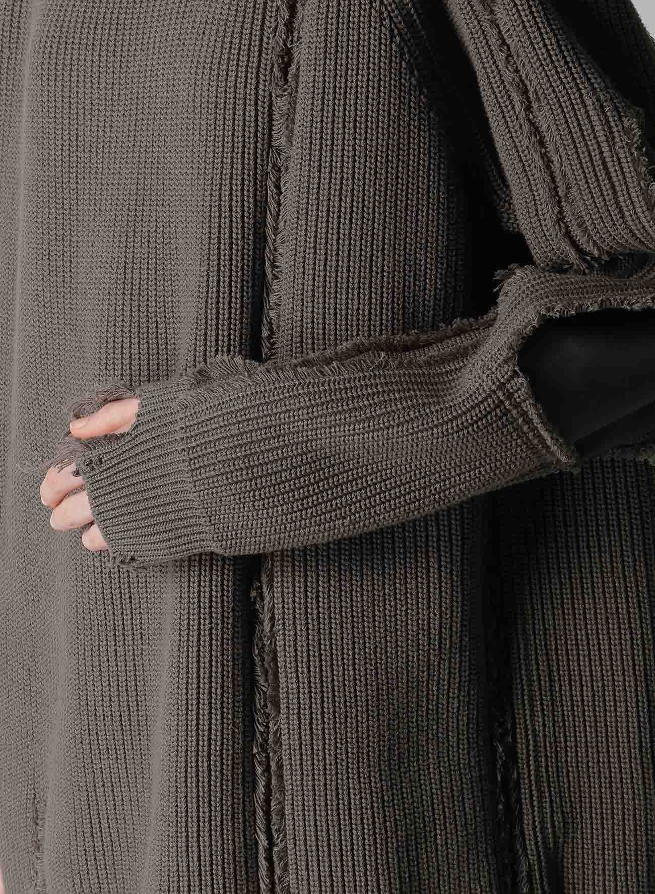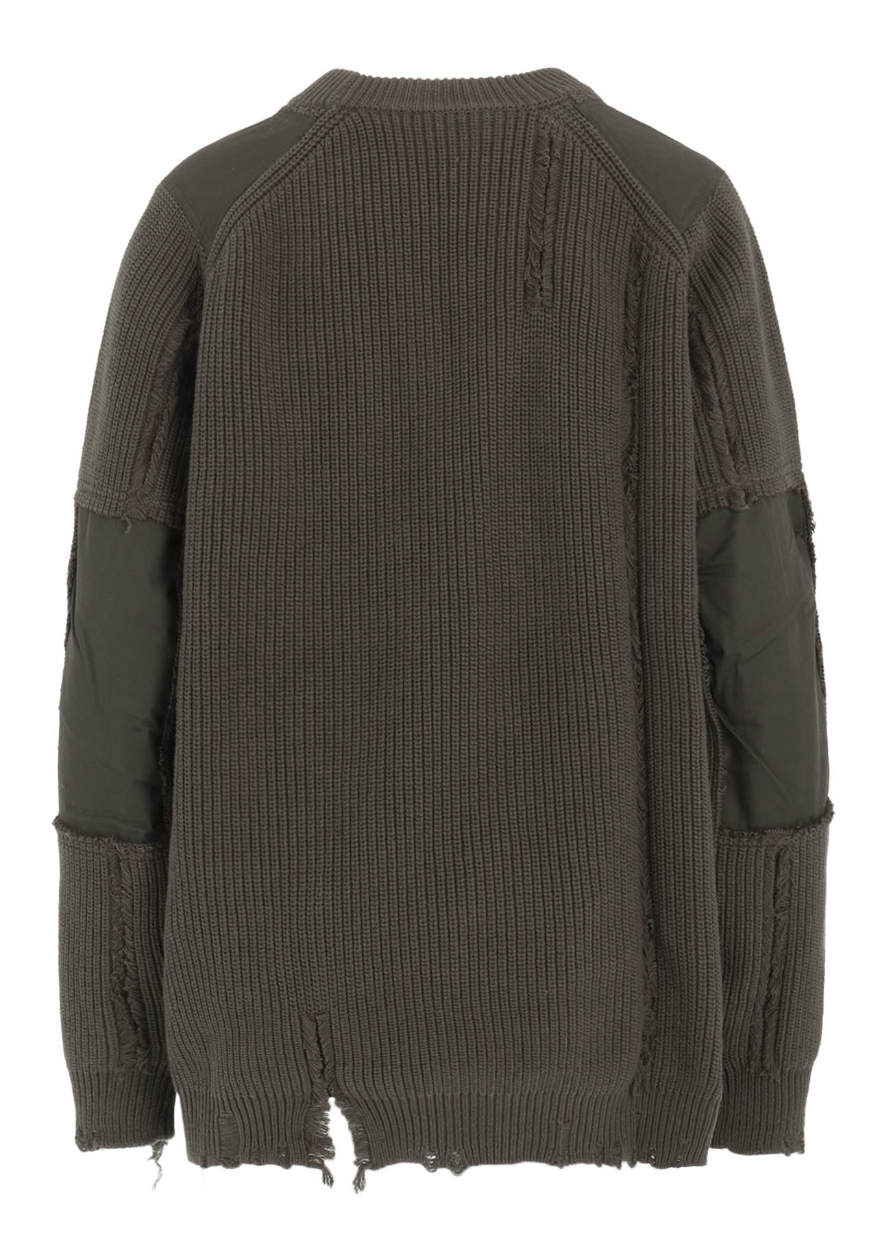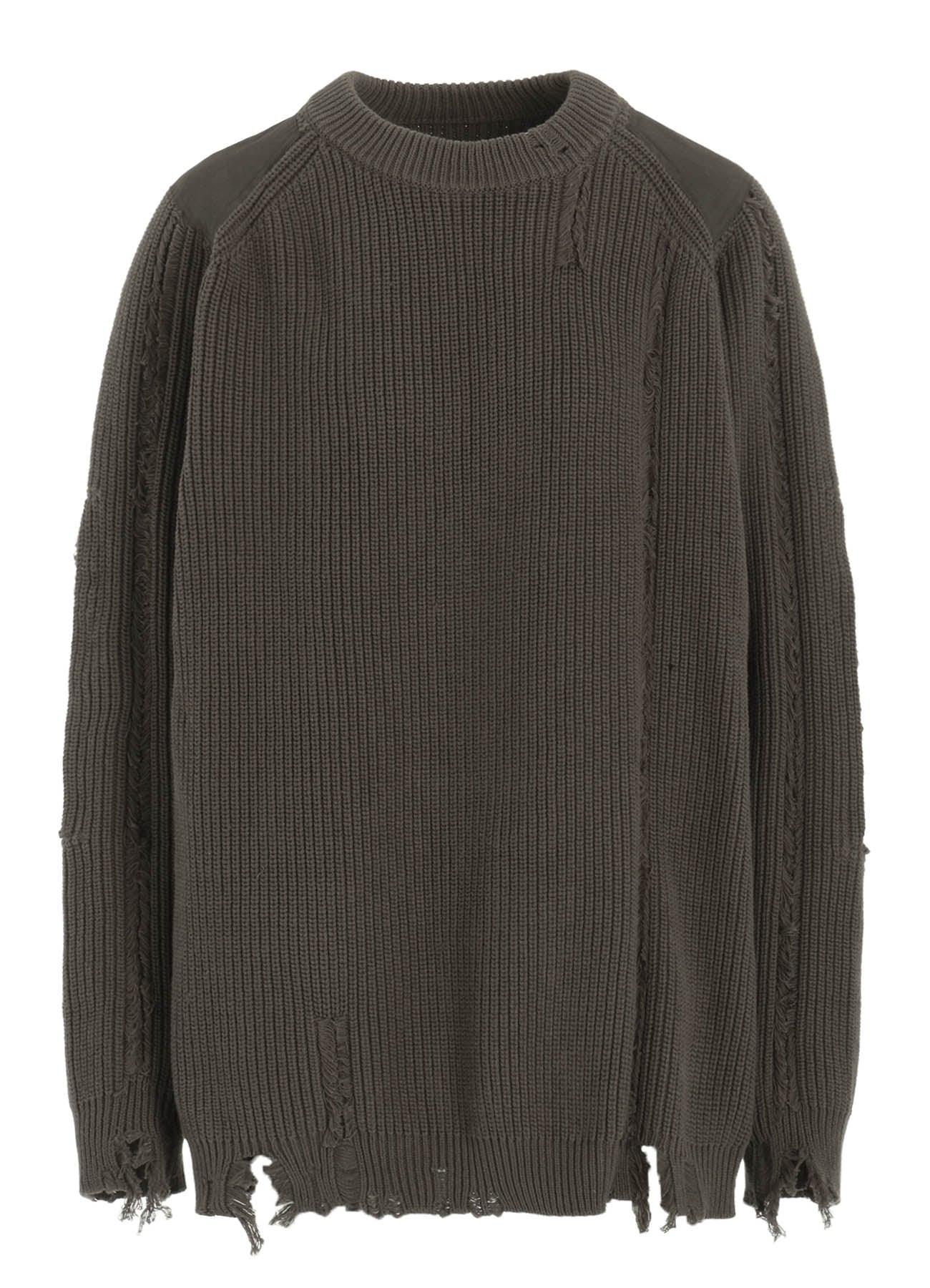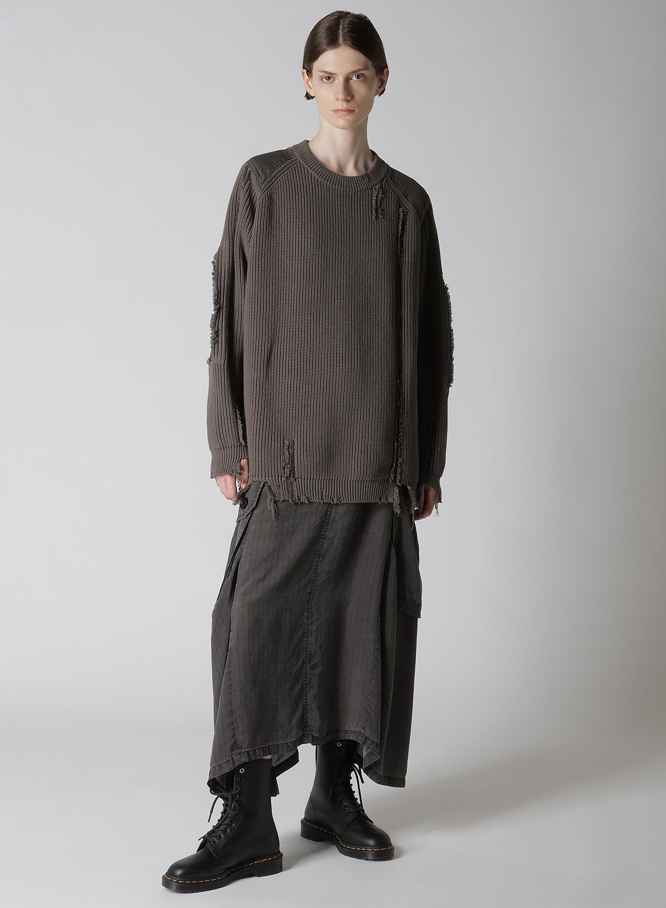 This cotton knit pullover is designed with a vintage-like feel, featuring densely woven fabric accented with fringe and holes to resemble cuts. Its oversized silhouette makes it suitable for all genders. Enjoy a comfortable fit in this versatile and stylish piece.
