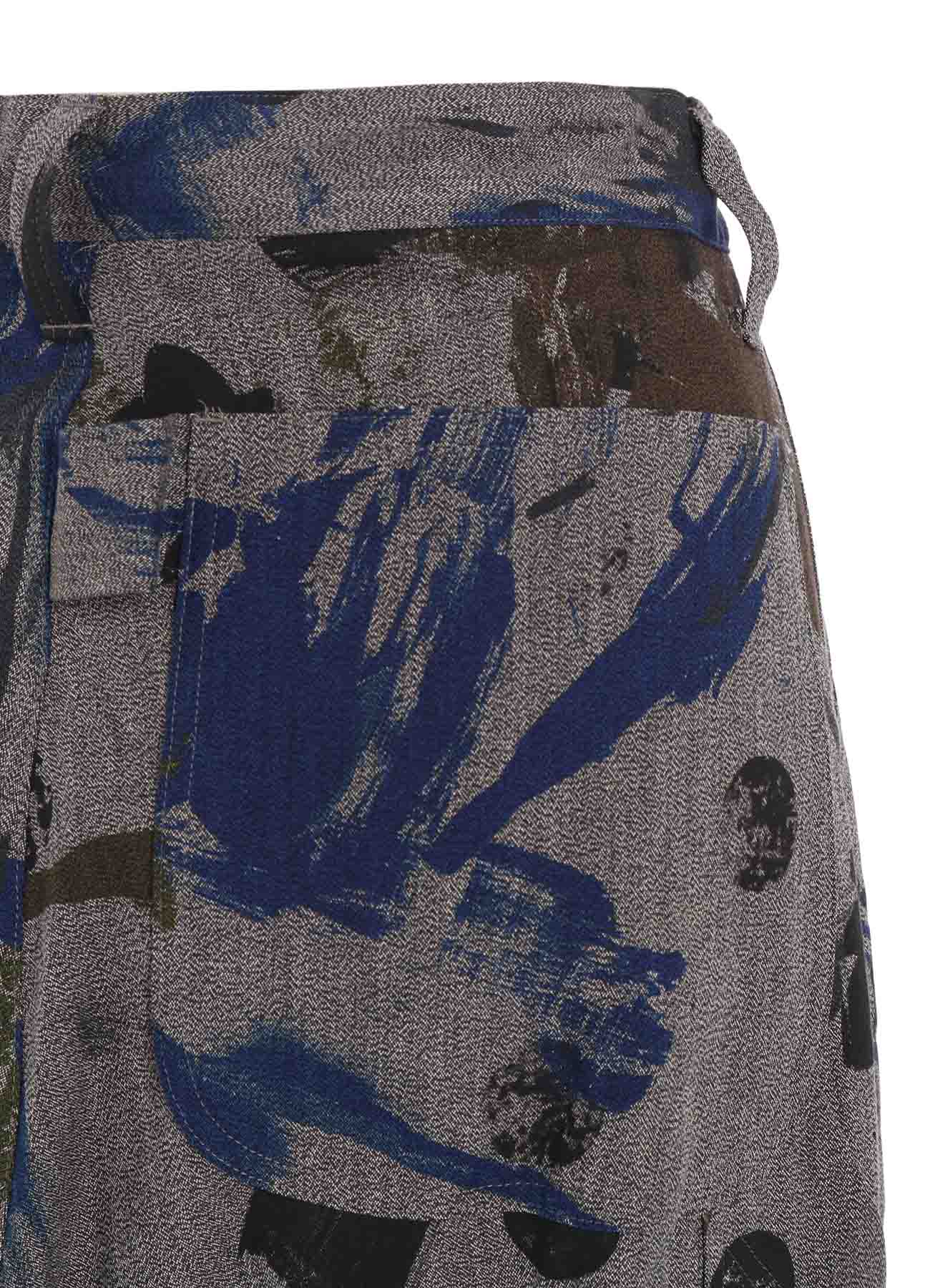 Dot-painted work pants utilize heather yarn in the warp for a deep tone. The contrast between the neatly arranged dot pattern and dynamic paint is a highlight. Features derive from workwear, such as the hammer loop and scale pocket, adding functional details to the design.