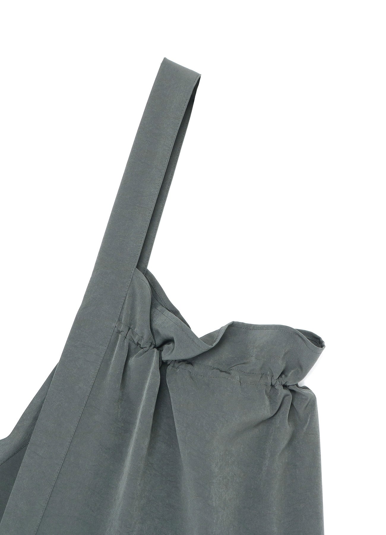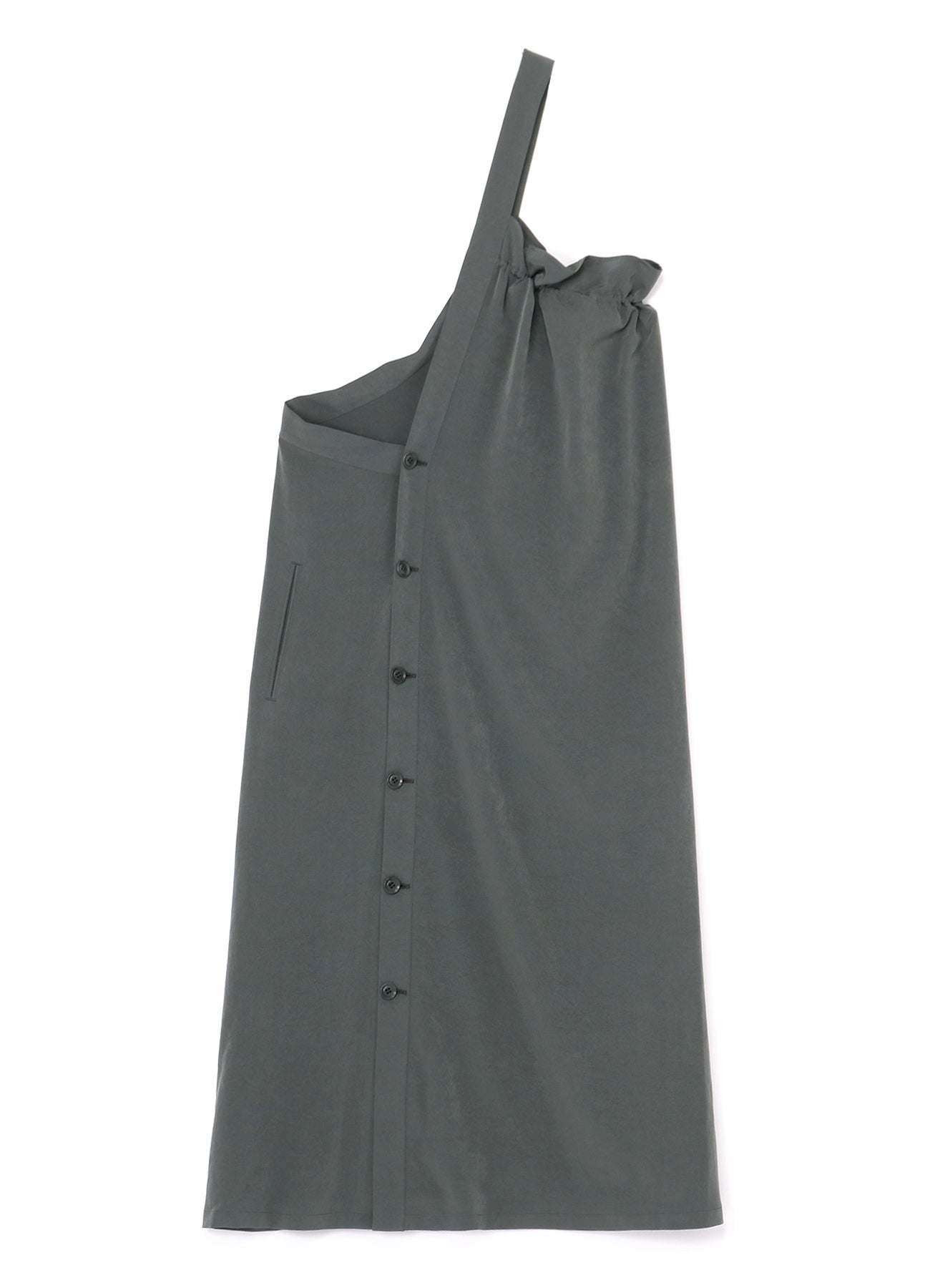A classic, popular one-shoulder dress made with triacetate/polyester crepe de Chine. It has a luxurious sheen, is wrinkle-resistant and offers a light, airy feel suitable for all seasons. The left side is voluminous while the right is sleek, giving a balanced look. Easy front button closure and practical pockets.
