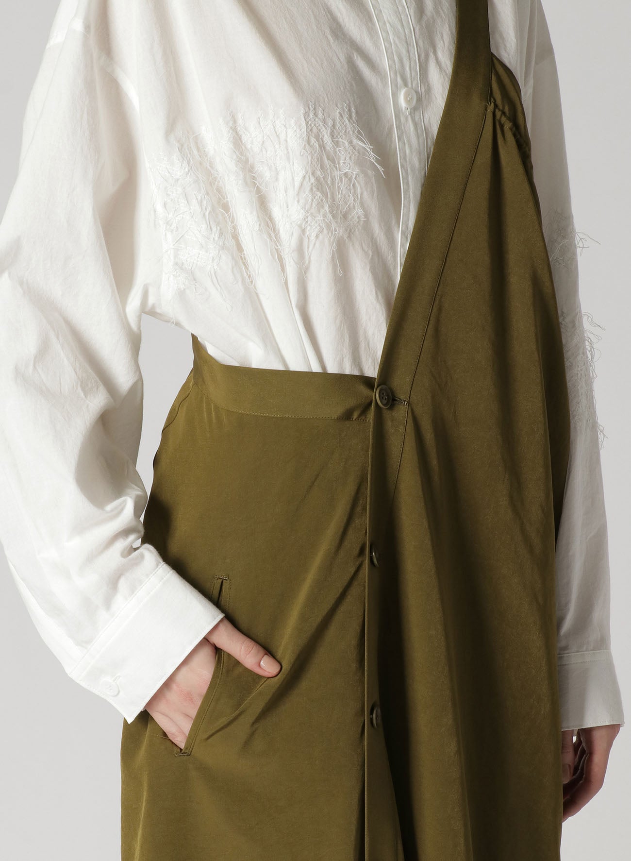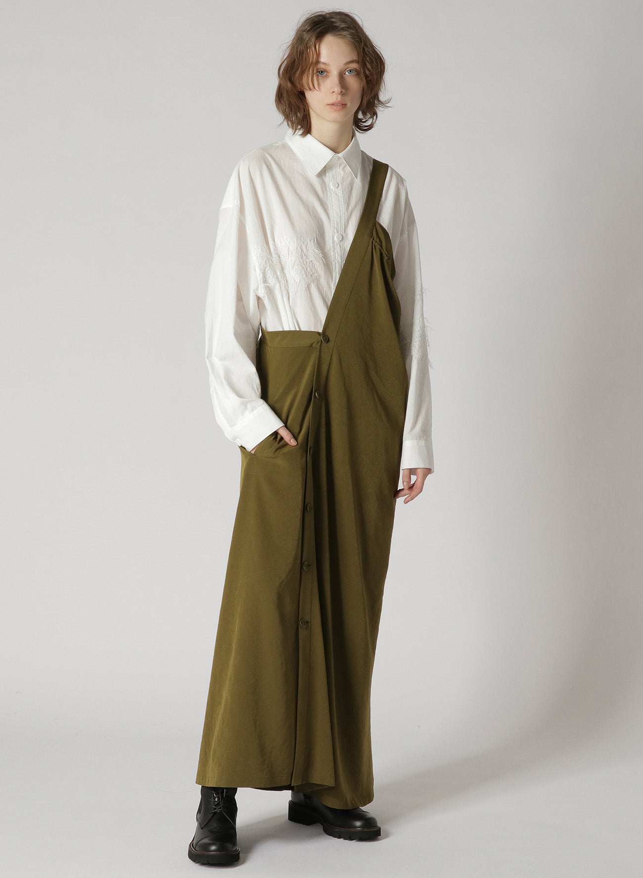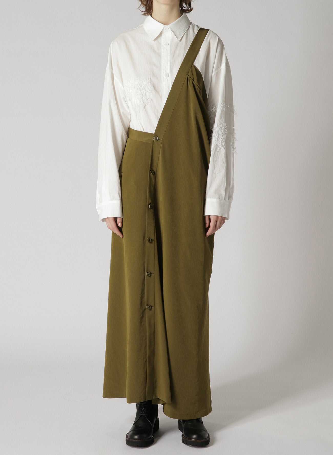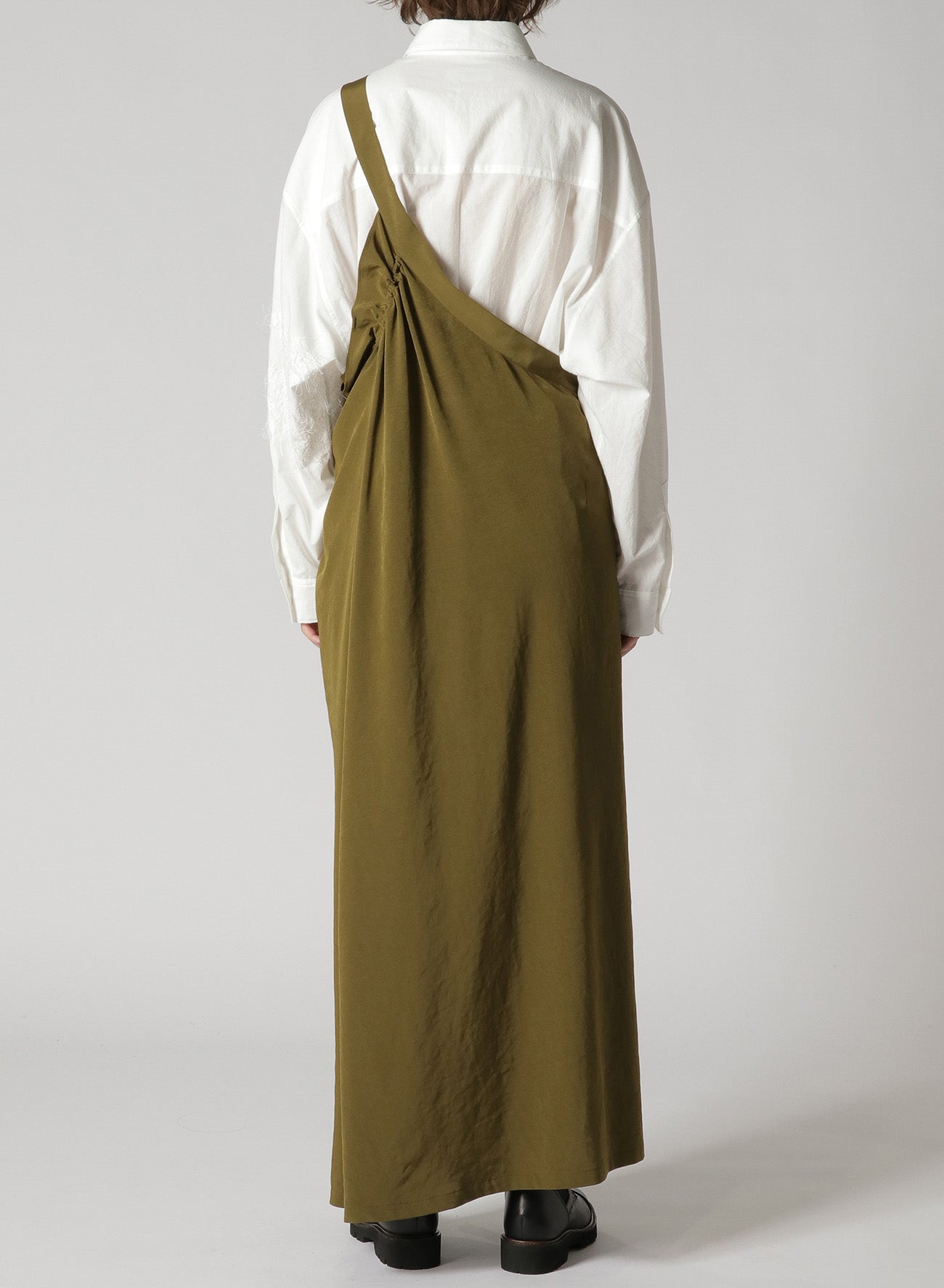 A classic, popular one-shoulder dress made with triacetate/polyester crepe de Chine. It has a luxurious sheen, is wrinkle-resistant and offers a light, airy feel suitable for all seasons. The left side is voluminous while the right is sleek, giving a balanced look. Easy front button closure and practical pockets.