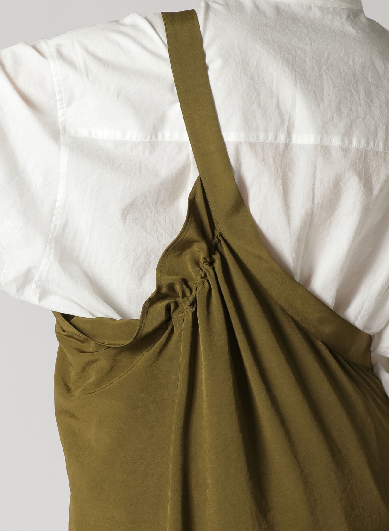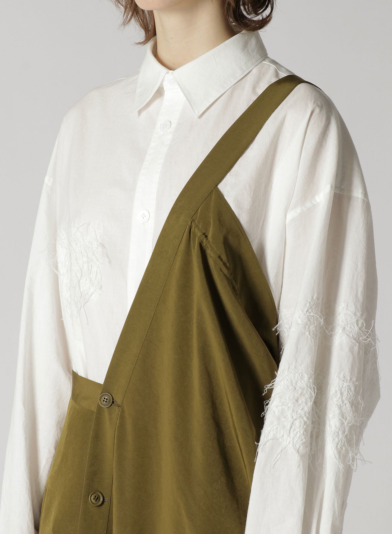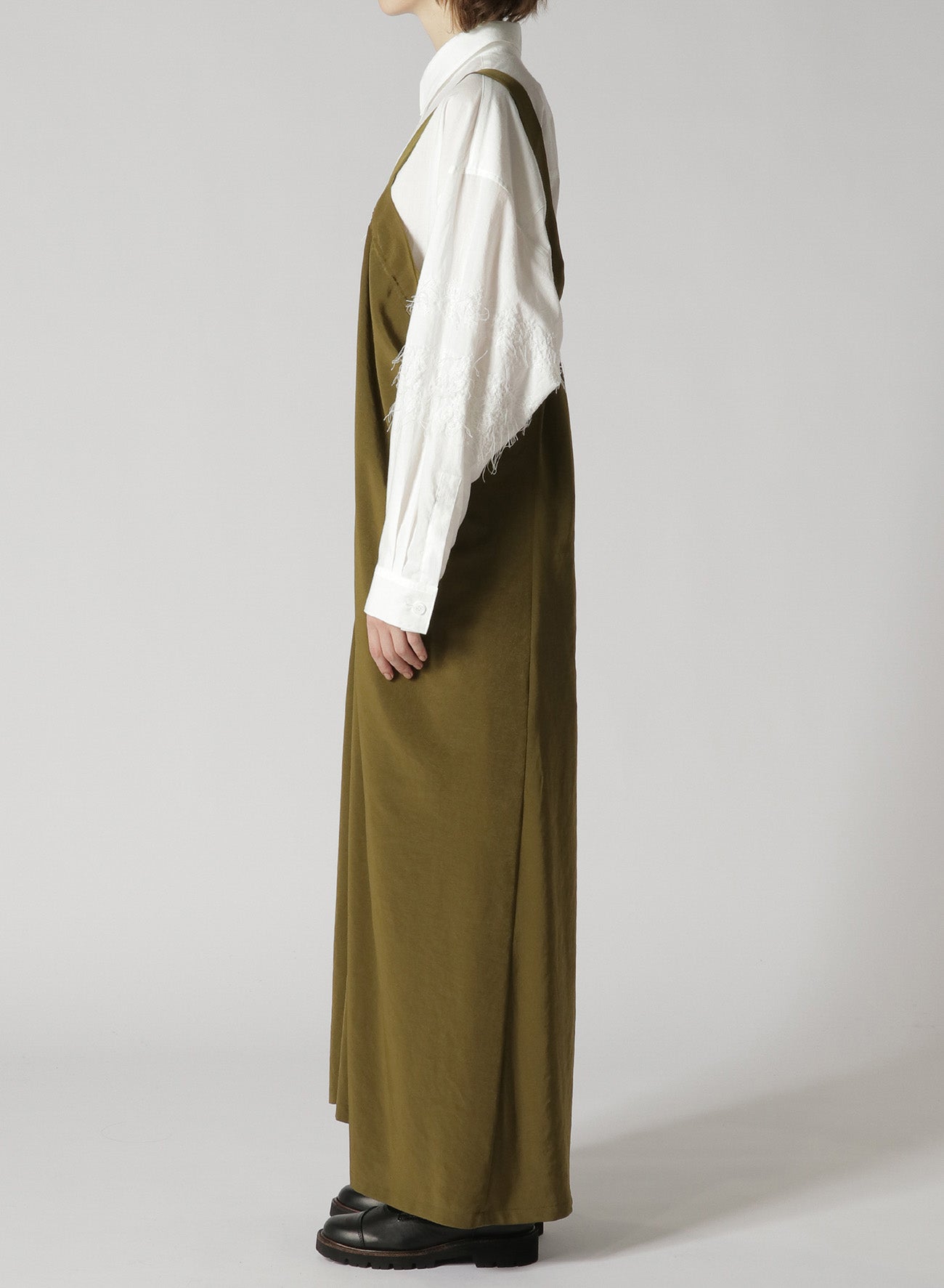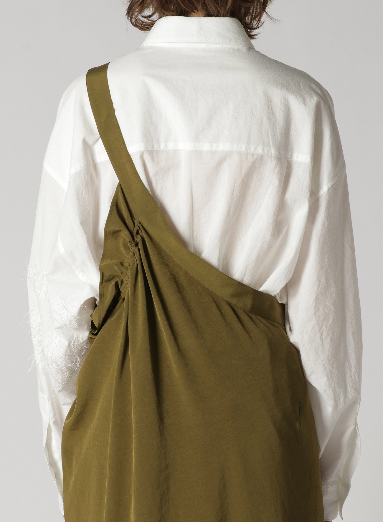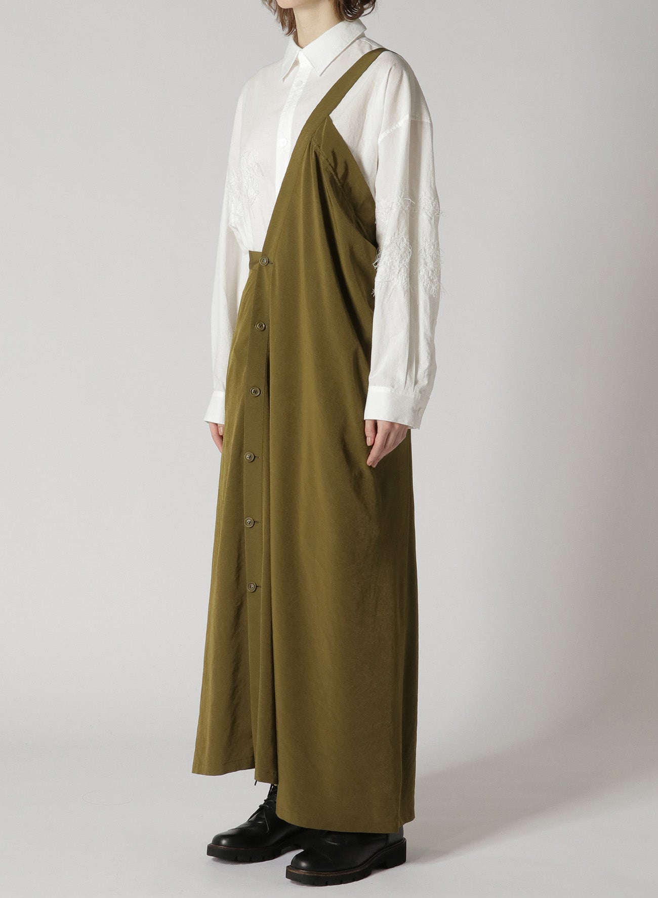 A classic, popular one-shoulder dress made with triacetate/polyester crepe de Chine. It has a luxurious sheen, is wrinkle-resistant and offers a light, airy feel suitable for all seasons. The left side is voluminous while the right is sleek, giving a balanced look. Easy front button closure and practical pockets.