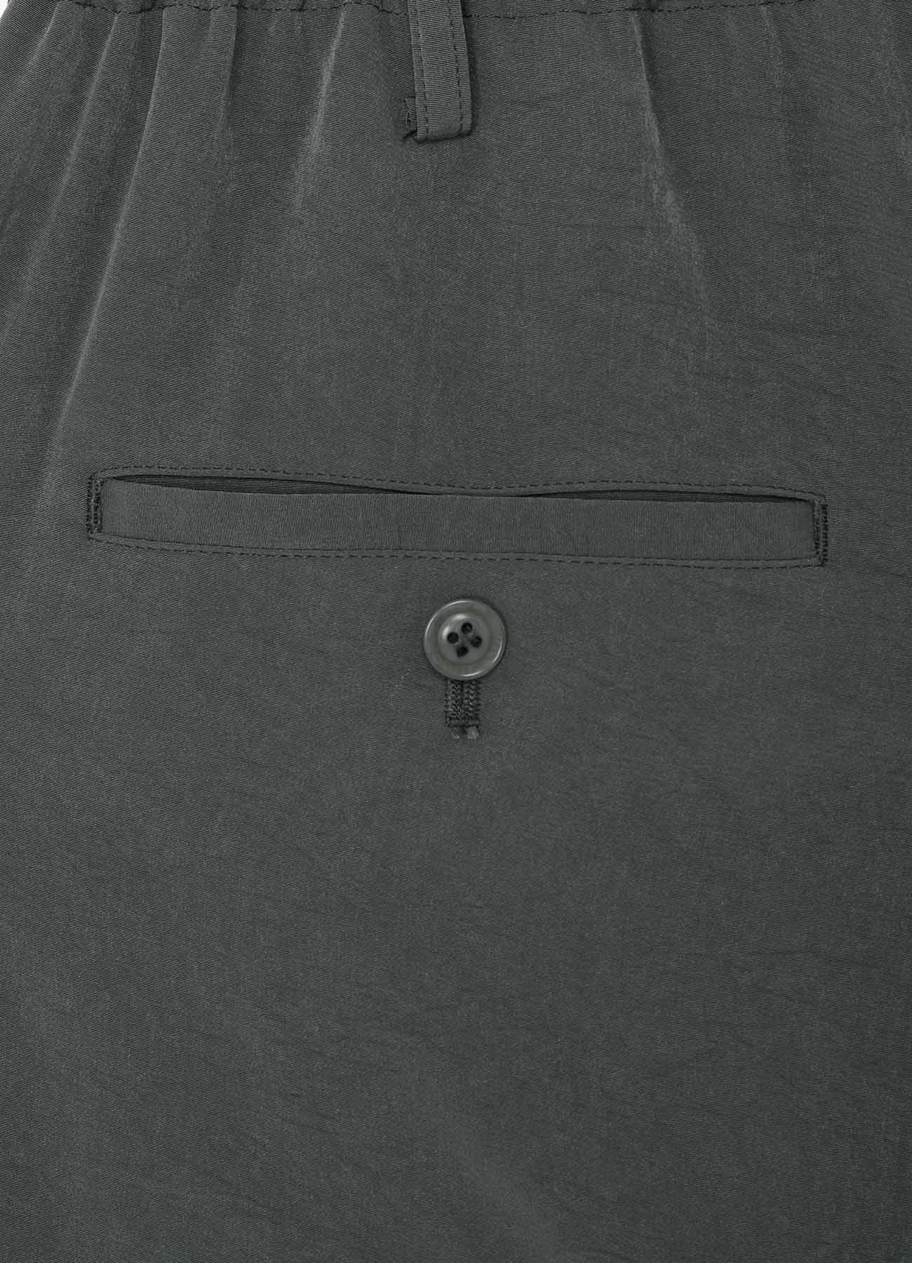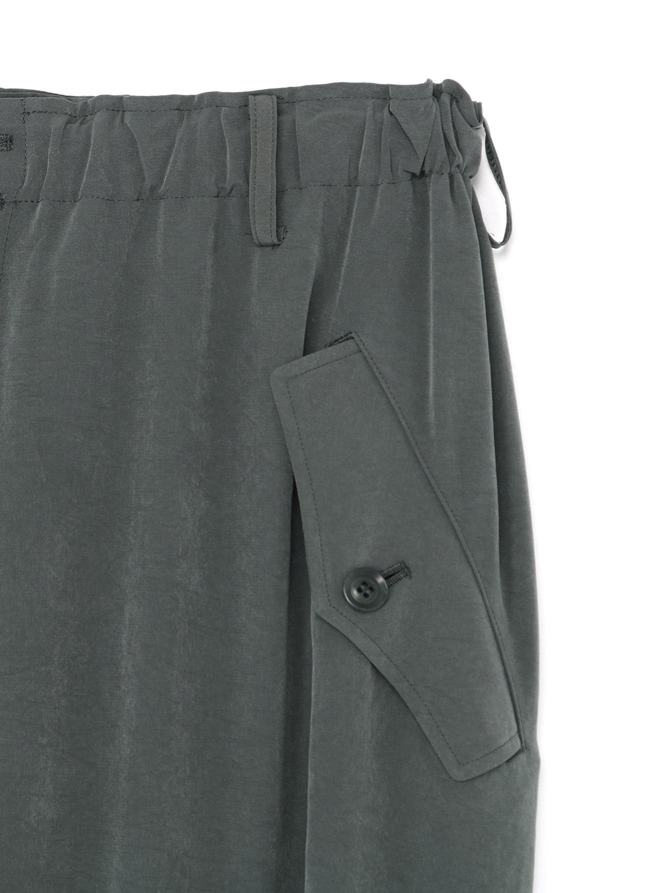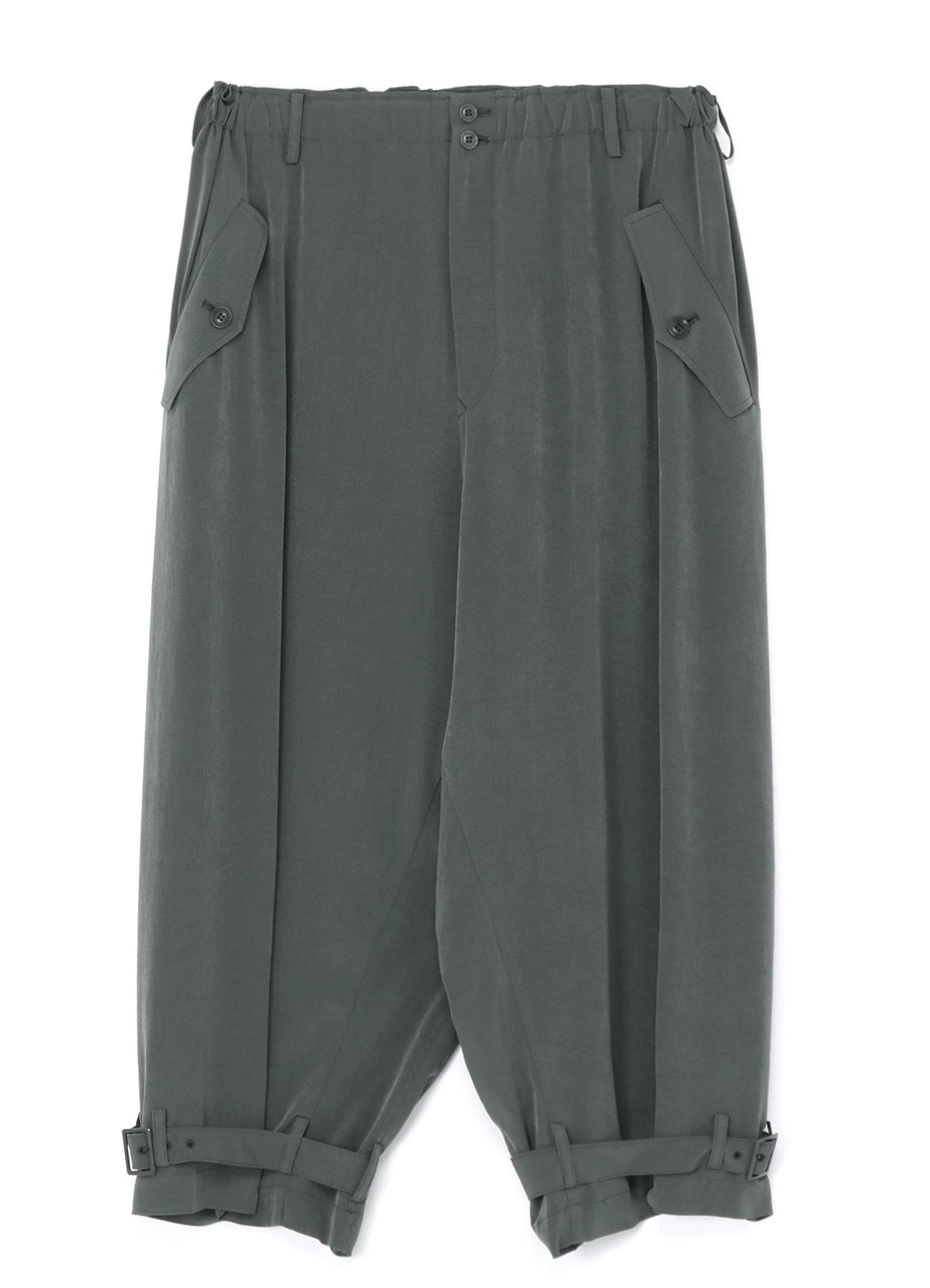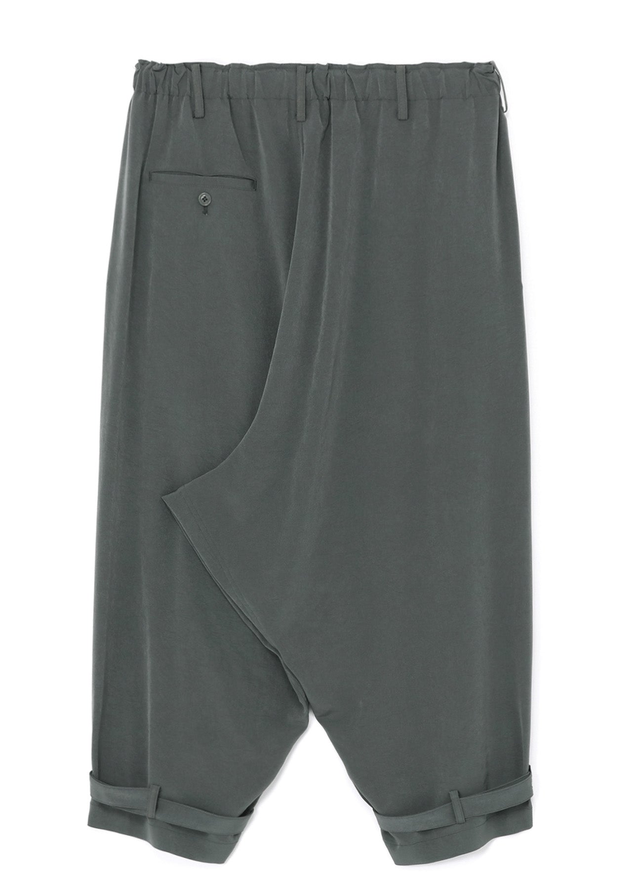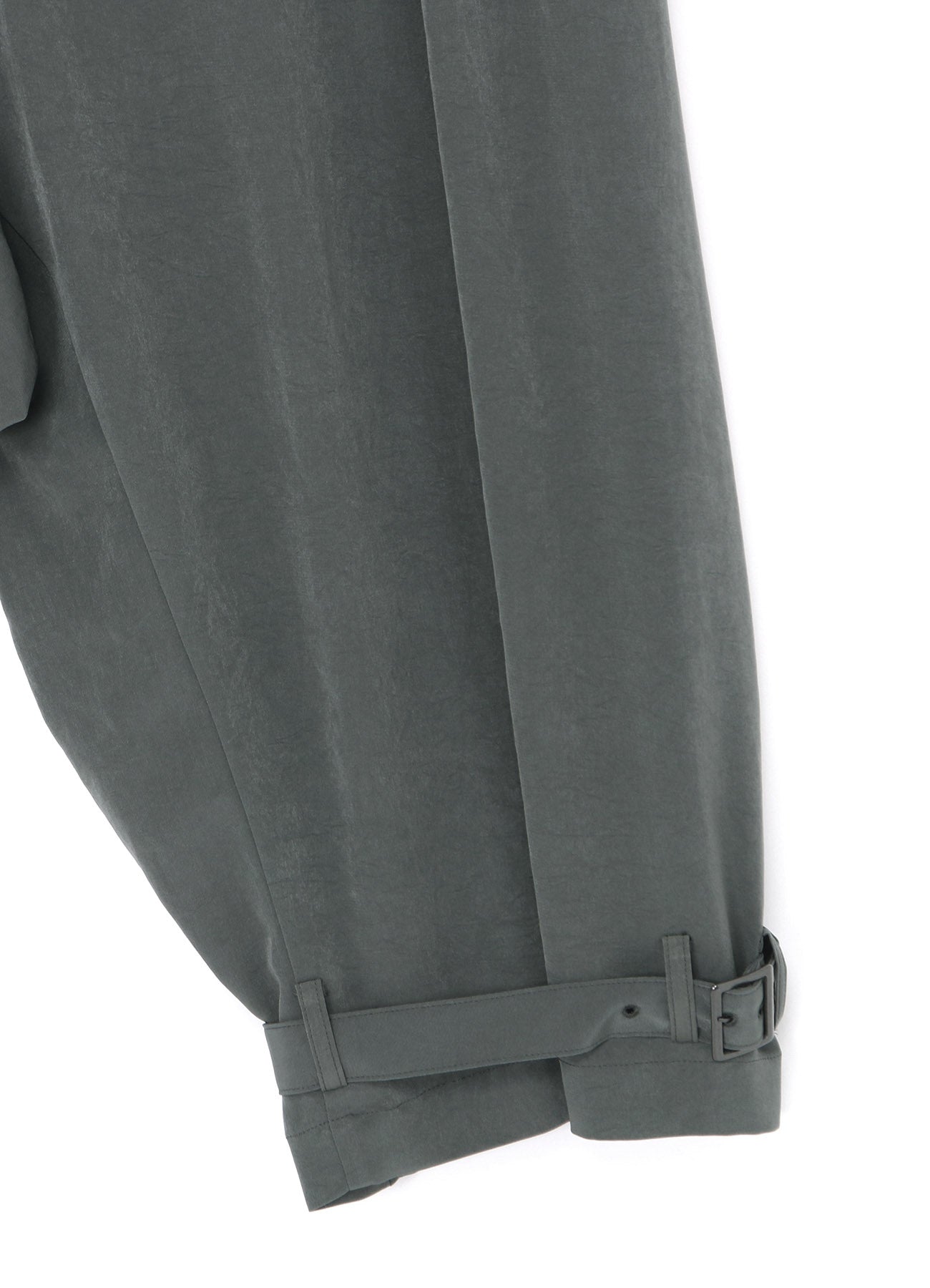 These pants feature triacetate/polyester crepe de Chine, offering a luxurious shine and soft drape, perfect for year-round wear. Though roomy in the thigh and rise, the attached belt cinches the cuffs, creating a clean look with elegant drapery.