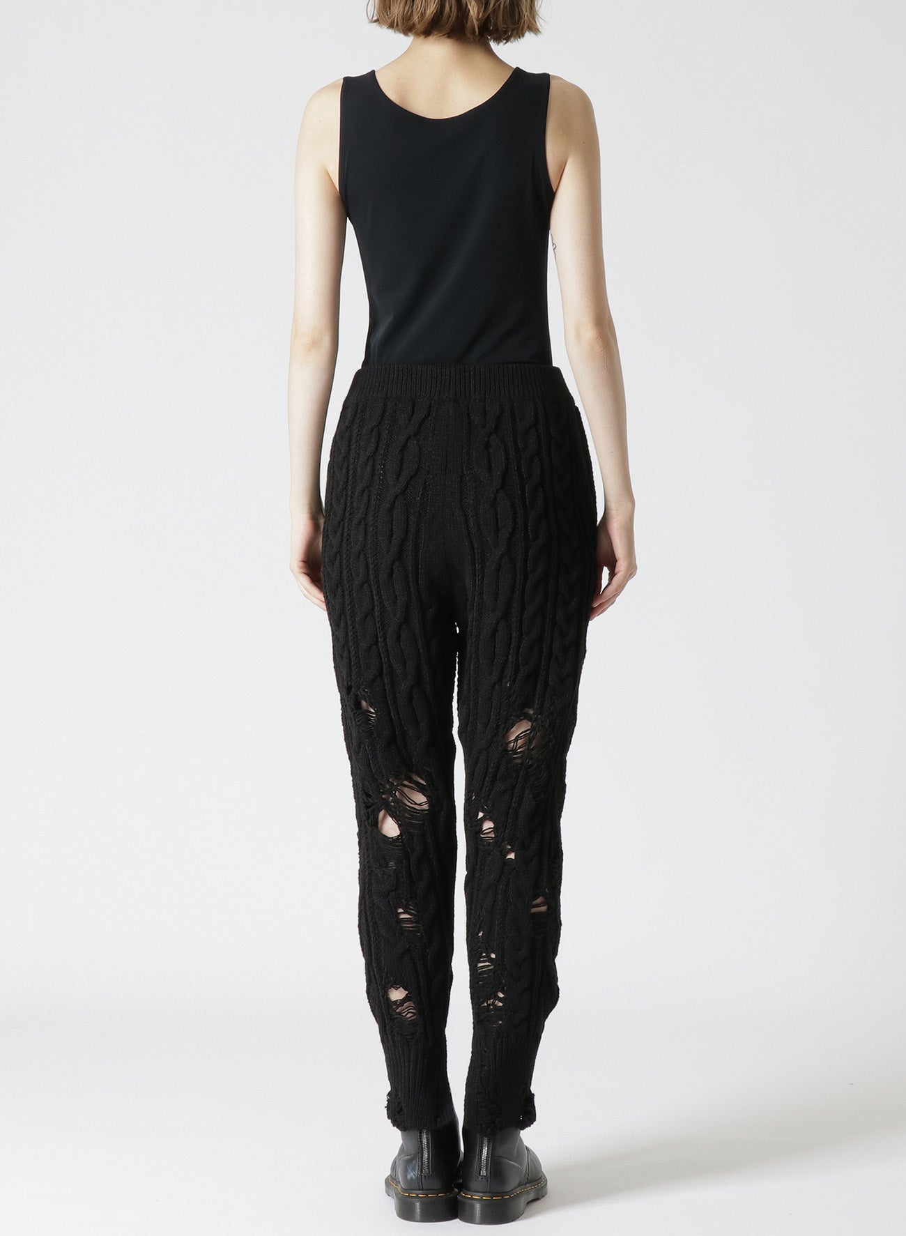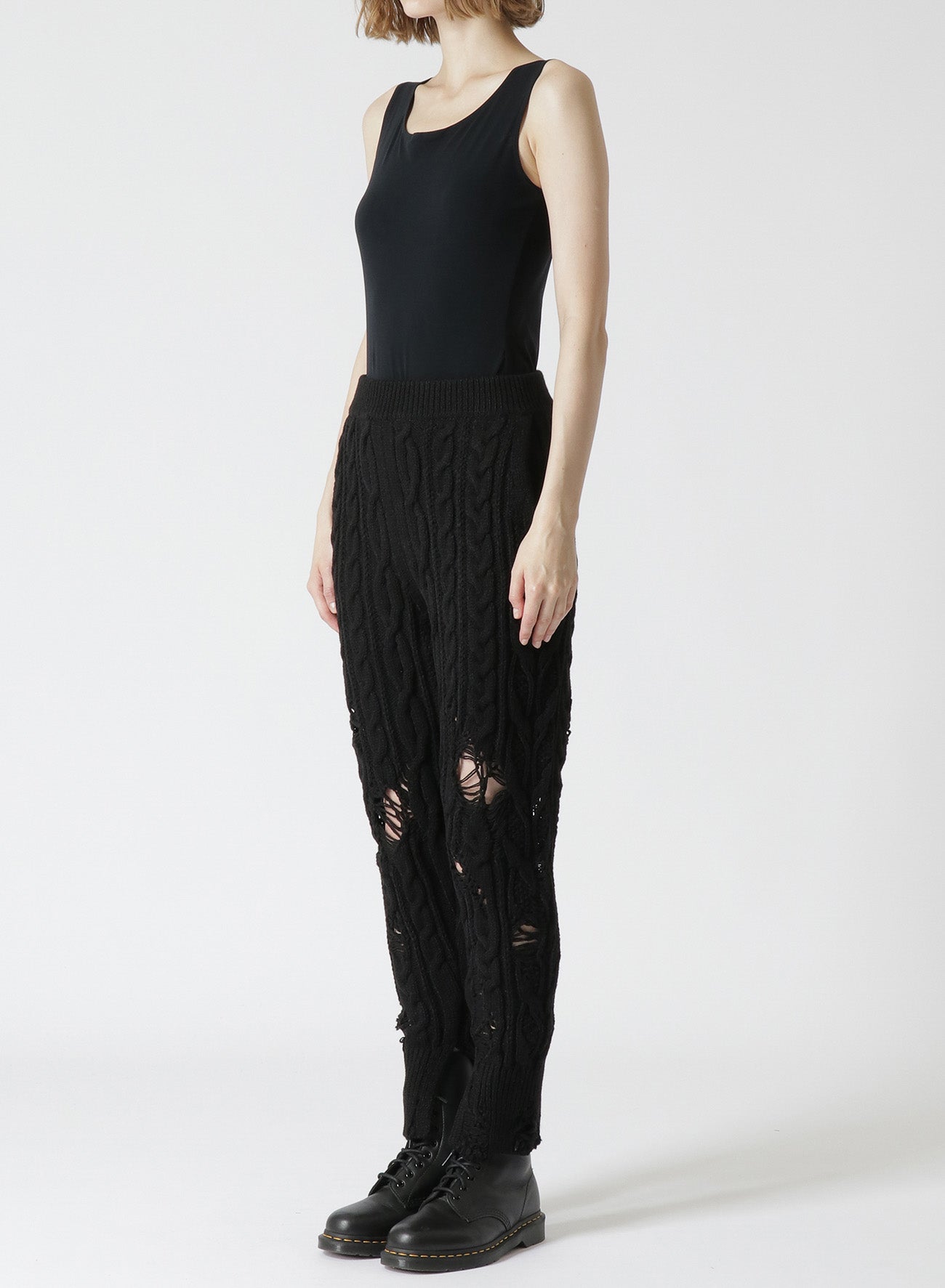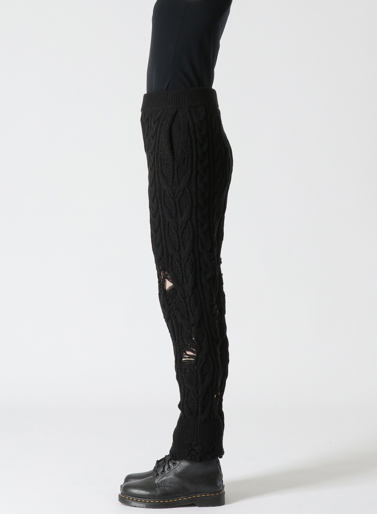 This knit ribbed pants feature a distressed look with intentional fraying, adding a unique accent when layered with longer tops. The slender silhouette, achieved with Aran knitting, and slits at the hem create a streamlined look suitable for boots and high-cut shoes. Pairing with tights offers a distinctive layered style.