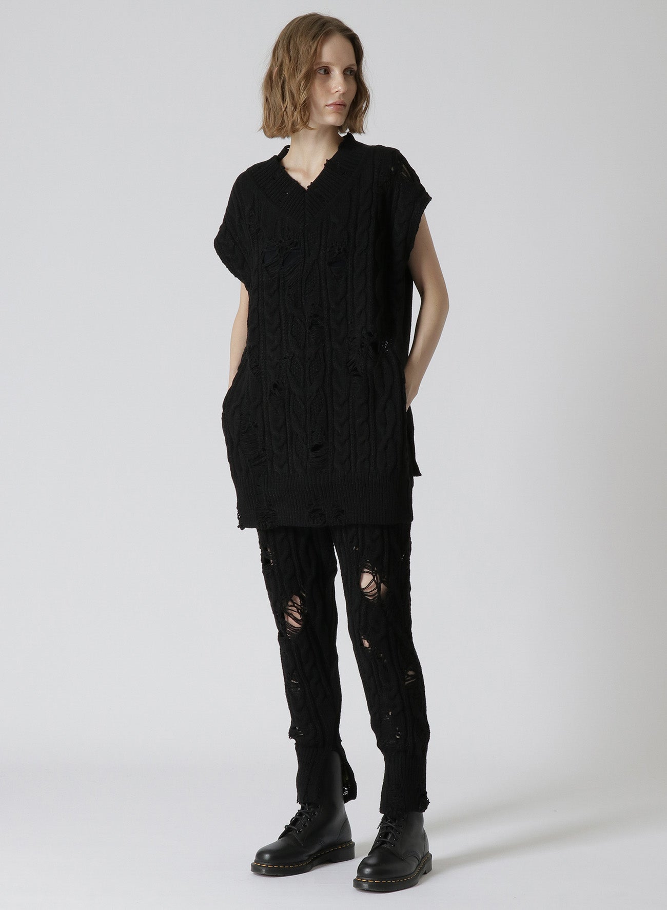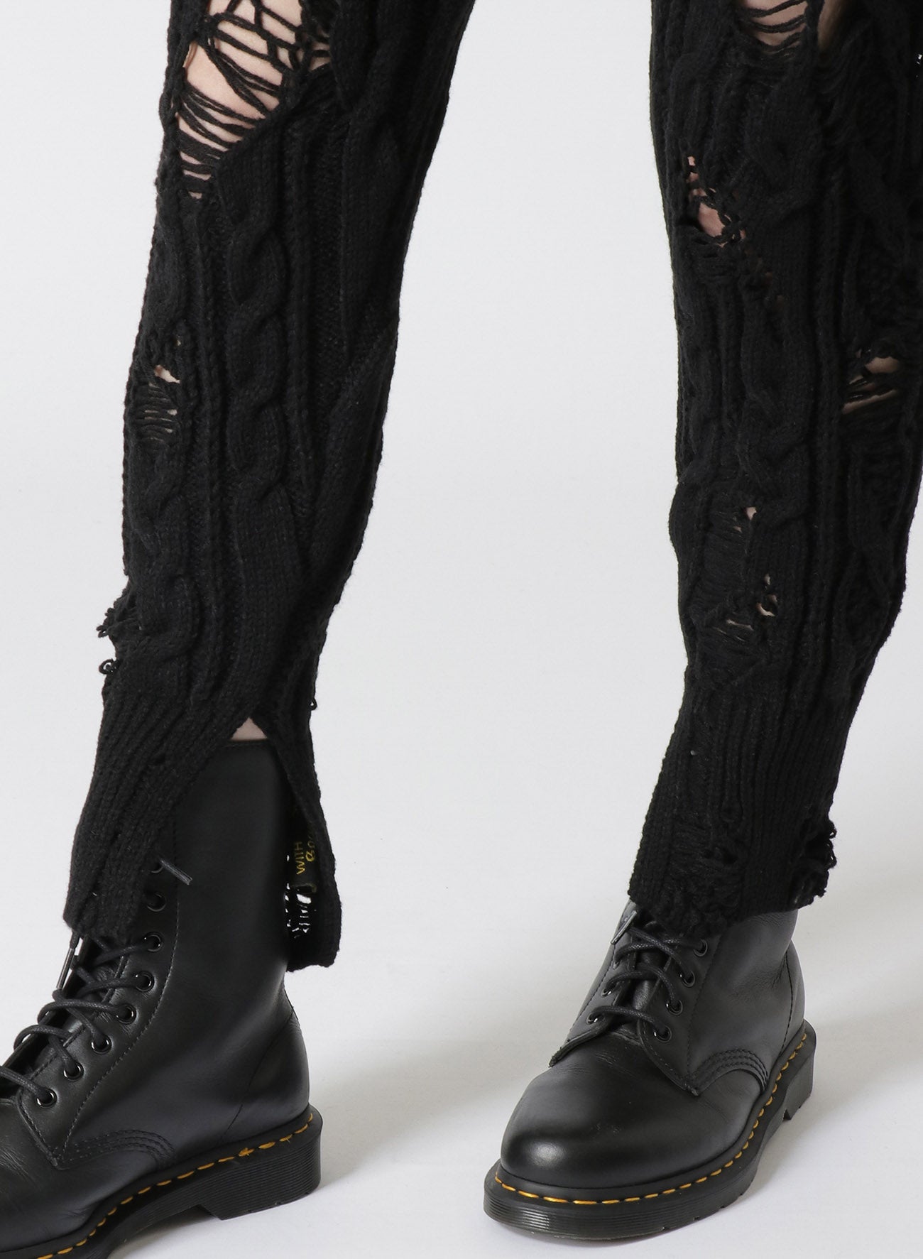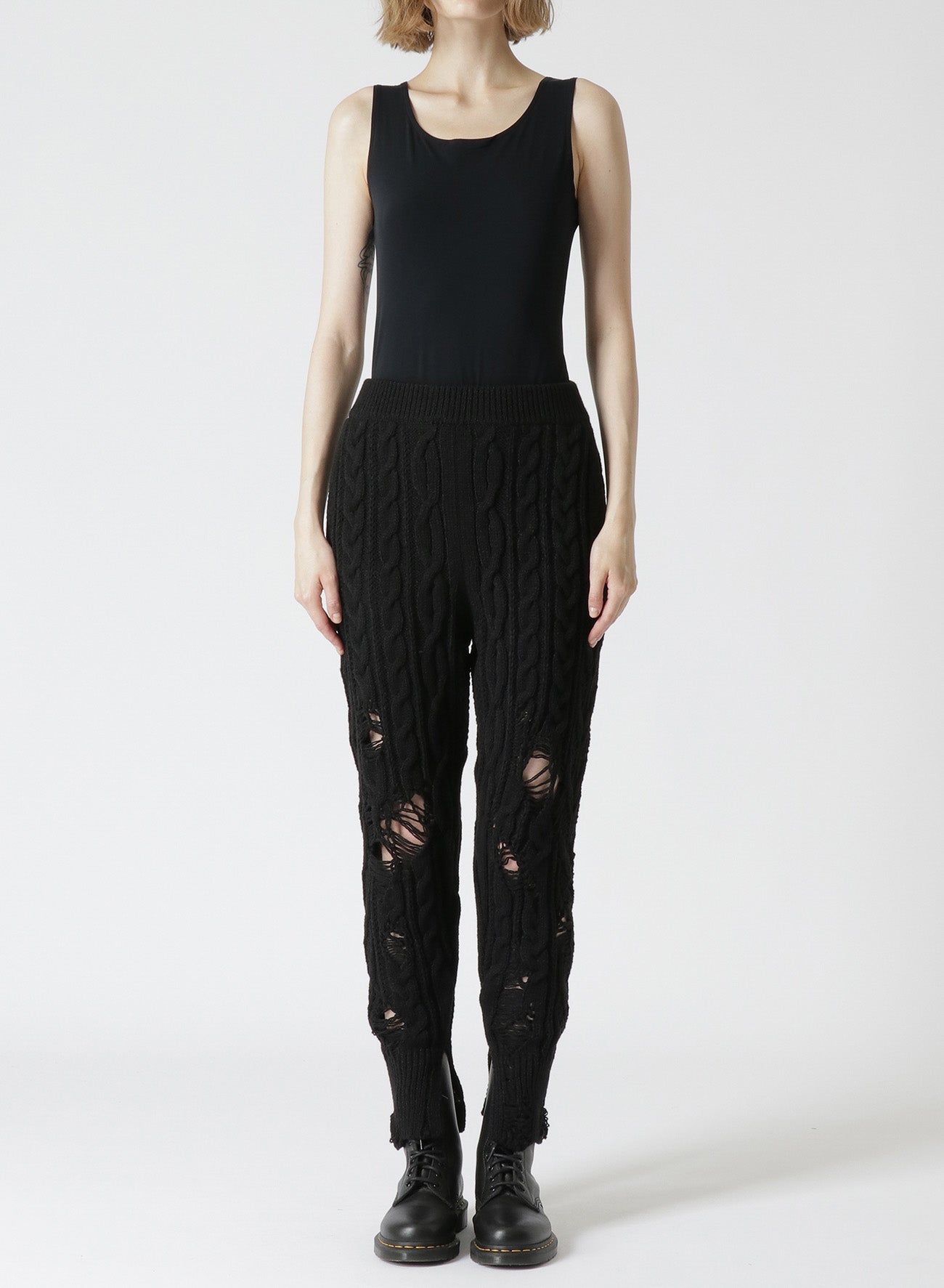 This knit ribbed pants feature a distressed look with intentional fraying, adding a unique accent when layered with longer tops. The slender silhouette, achieved with Aran knitting, and slits at the hem create a streamlined look suitable for boots and high-cut shoes. Pairing with tights offers a distinctive layered style.