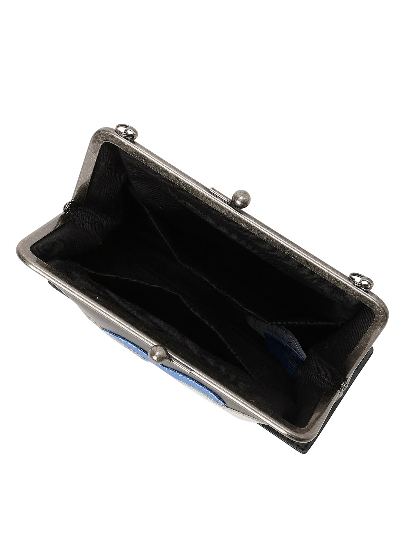 Y's × CPD HOOME features a clasp bag made from leather, showcasing CPD HOOME's iconic love patch. The clasp has a unique scratched-like finish, adding a rugged feel. CPD HOOME is a lifestyle brand by masked modern artist COIN PARKING DELIVERY, emphasizing art within living spaces, bold graphics, and a unique urban sensibility.
