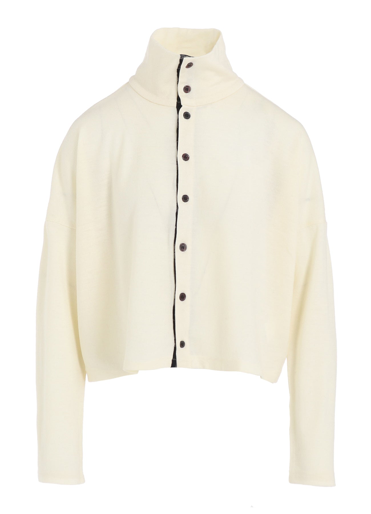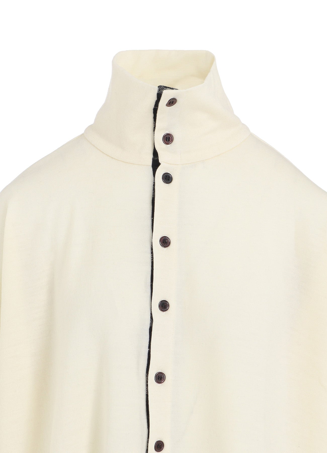 This cardigan from Y's features a stylish plaid pattern in boiled wool, offering versatility for wear as both a top and outer layer. Its adaptable design allows for numerous outfit choices, making it a handy addition to any wardrobe.
