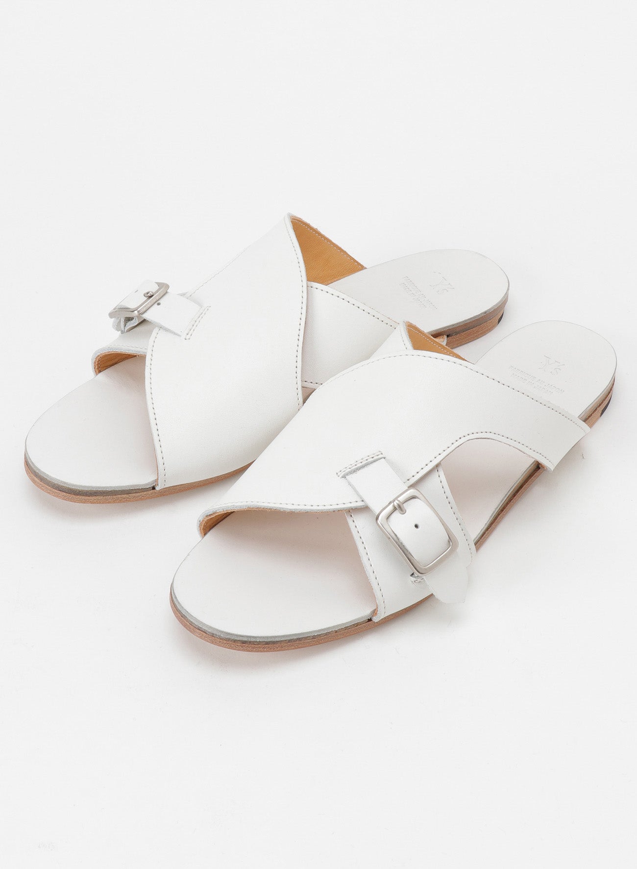 Lightly glossy vegetable tanned leather creates a refreshing look in these flat sandals. The side cutouts offer a breezy feel. The insole design ensures ease of walking despite the flat base. These luxurious yet casual sandals suit various outfits.