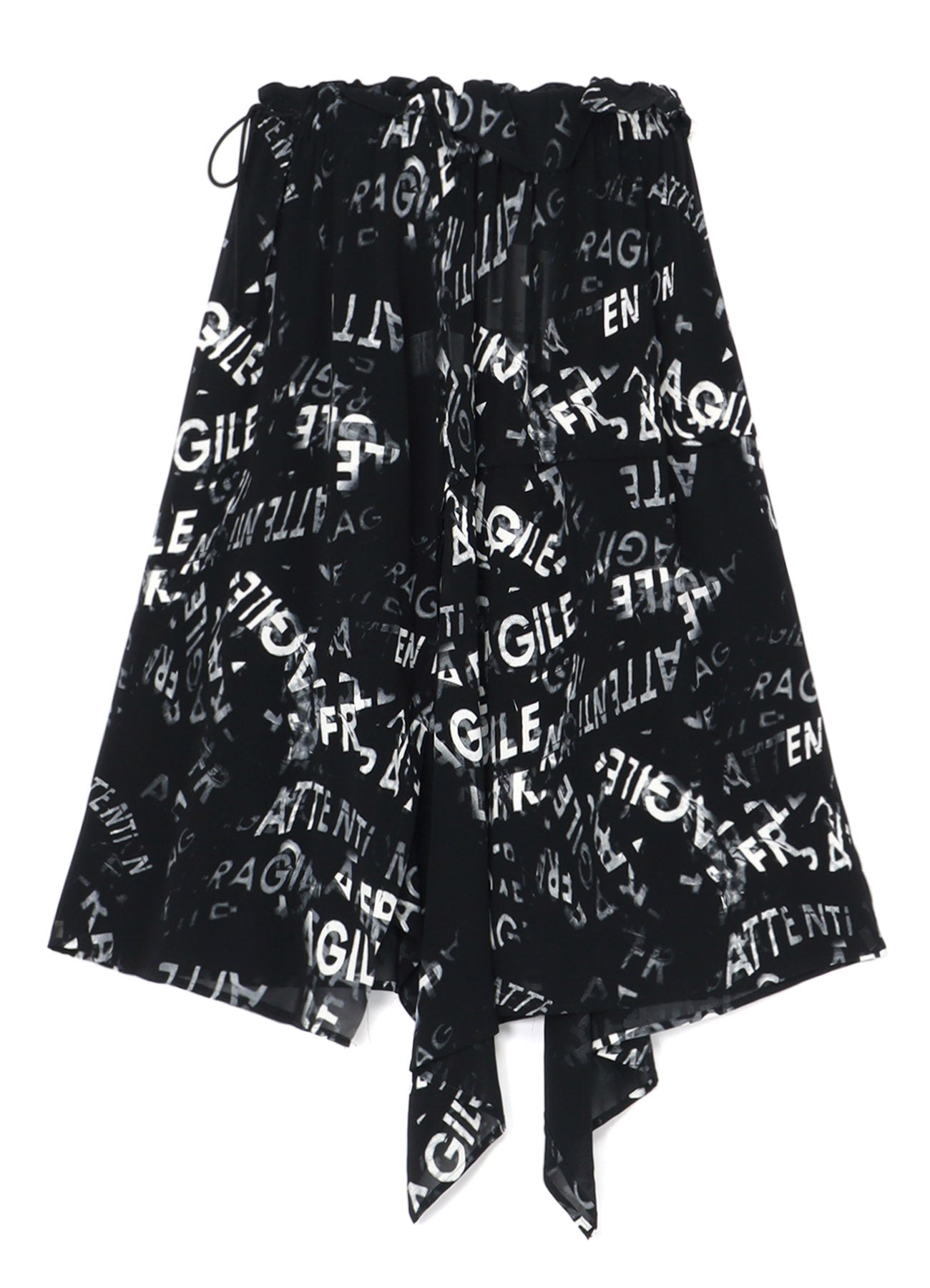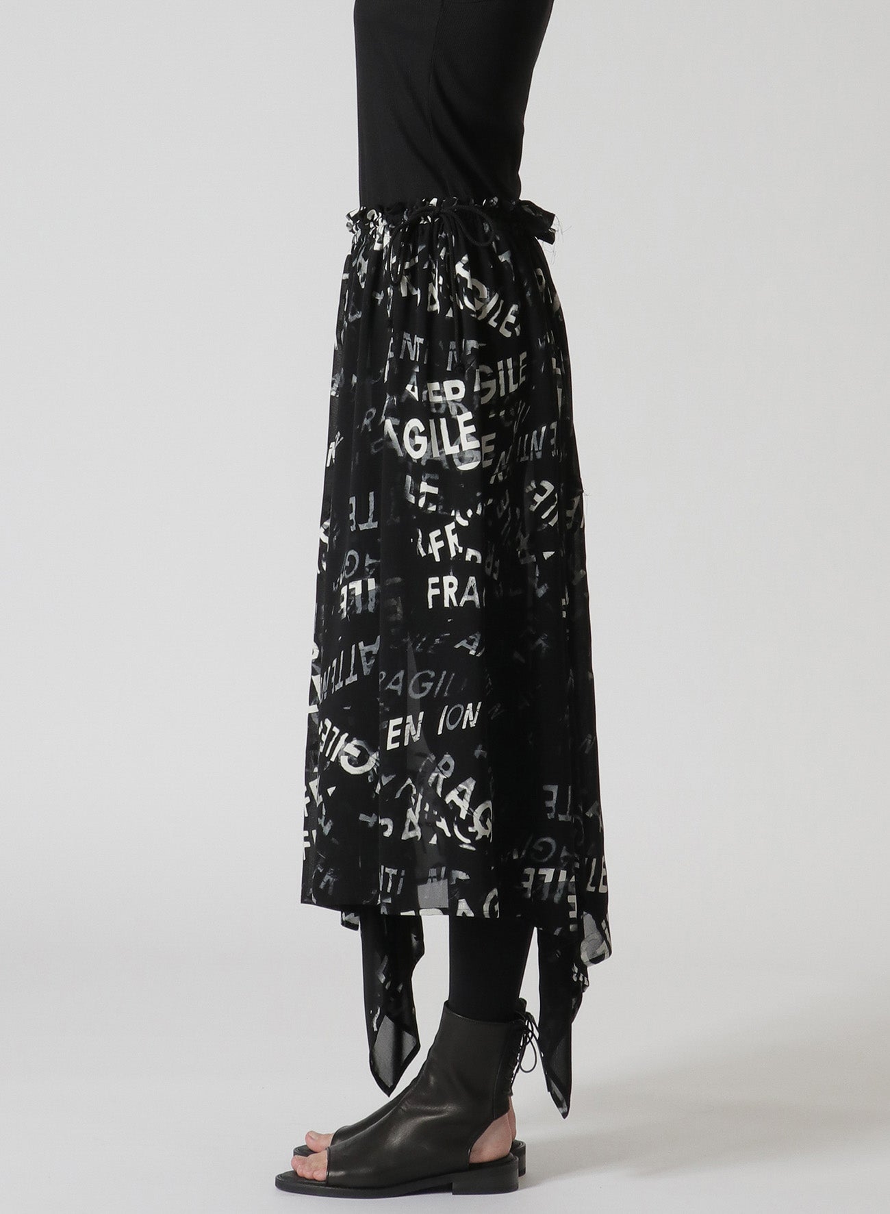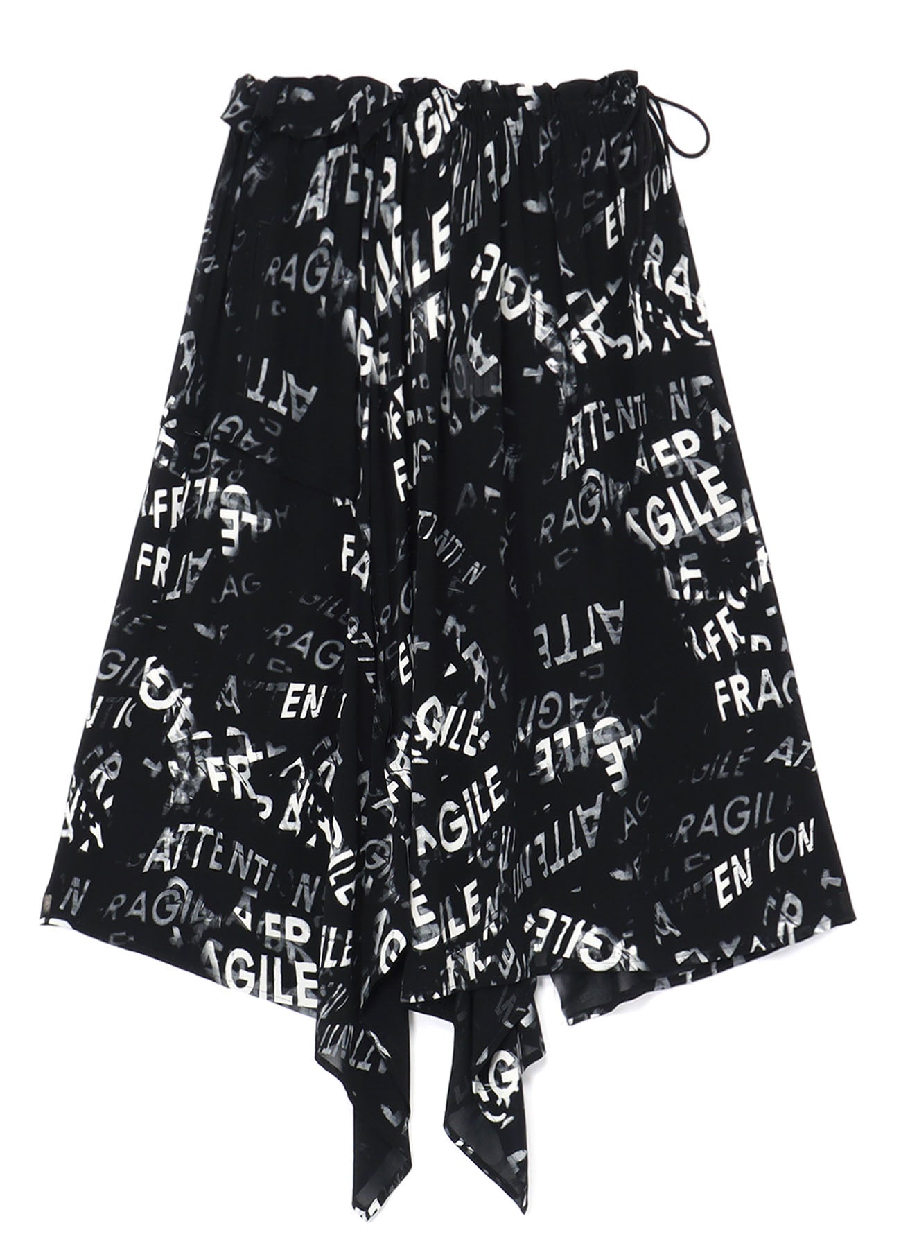 This drop asymmetry skirt features soft, rayon material that provides subtle texture. The georgette fabric creates an expressive drape that changes with movement. With an adjustable elastic waist and impactful "ATTENTION FRAGILE" print, it pairs well with simple tops.