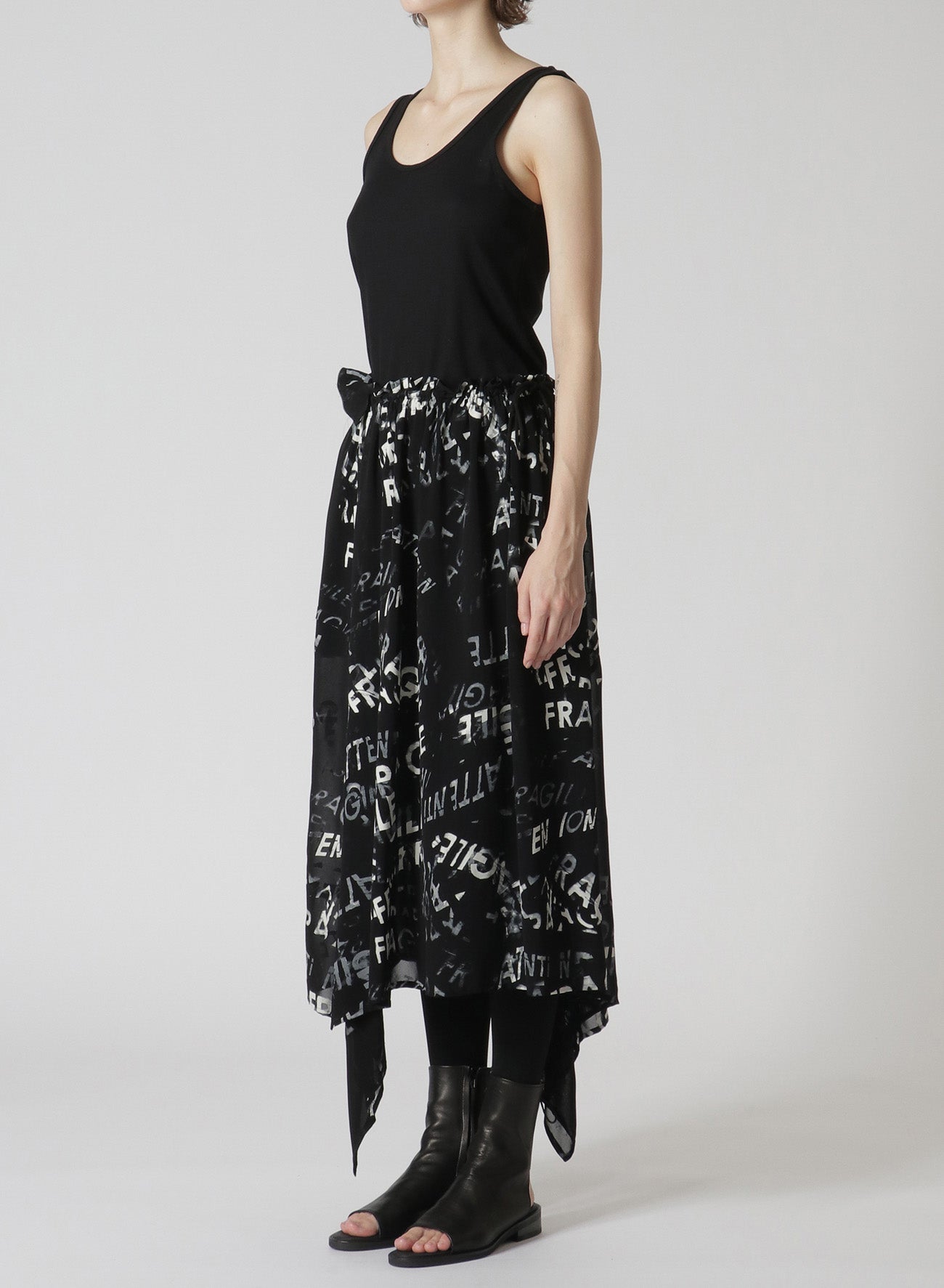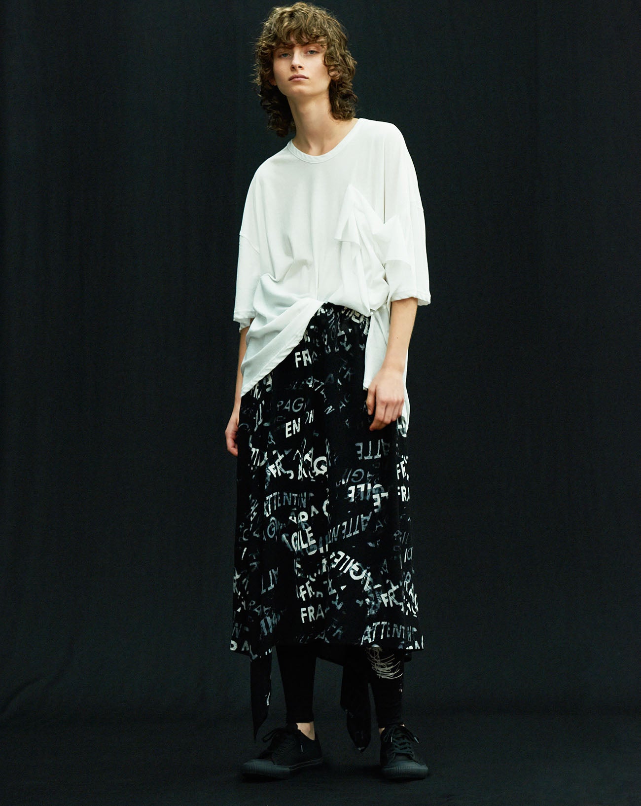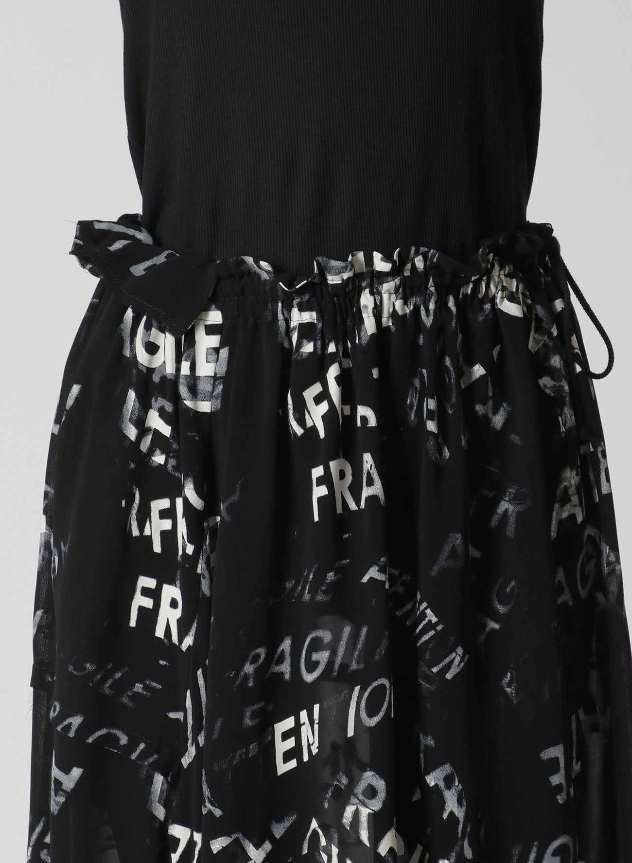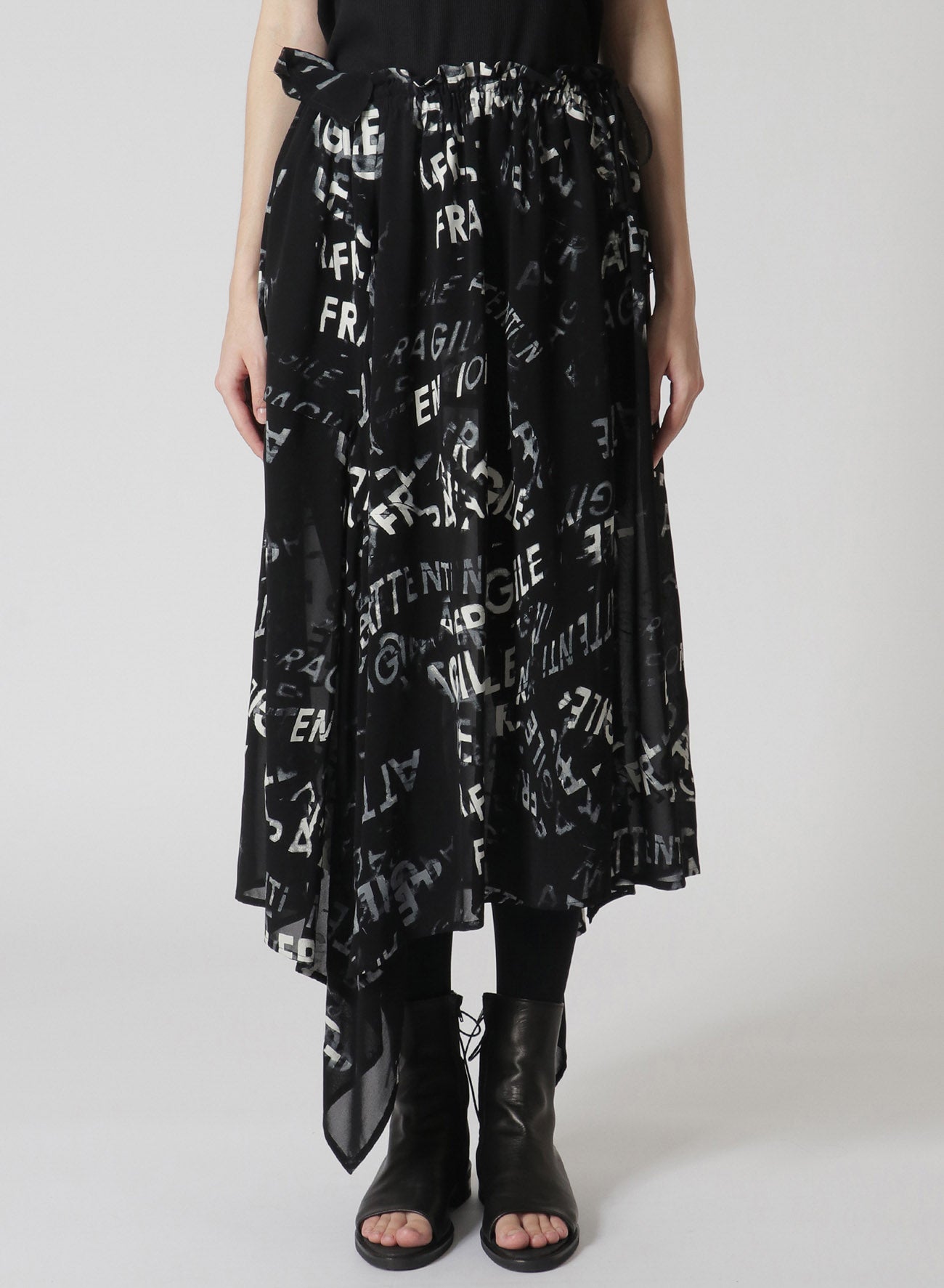 This drop asymmetry skirt features soft, rayon material that provides subtle texture. The georgette fabric creates an expressive drape that changes with movement. With an adjustable elastic waist and impactful "ATTENTION FRAGILE" print, it pairs well with simple tops.