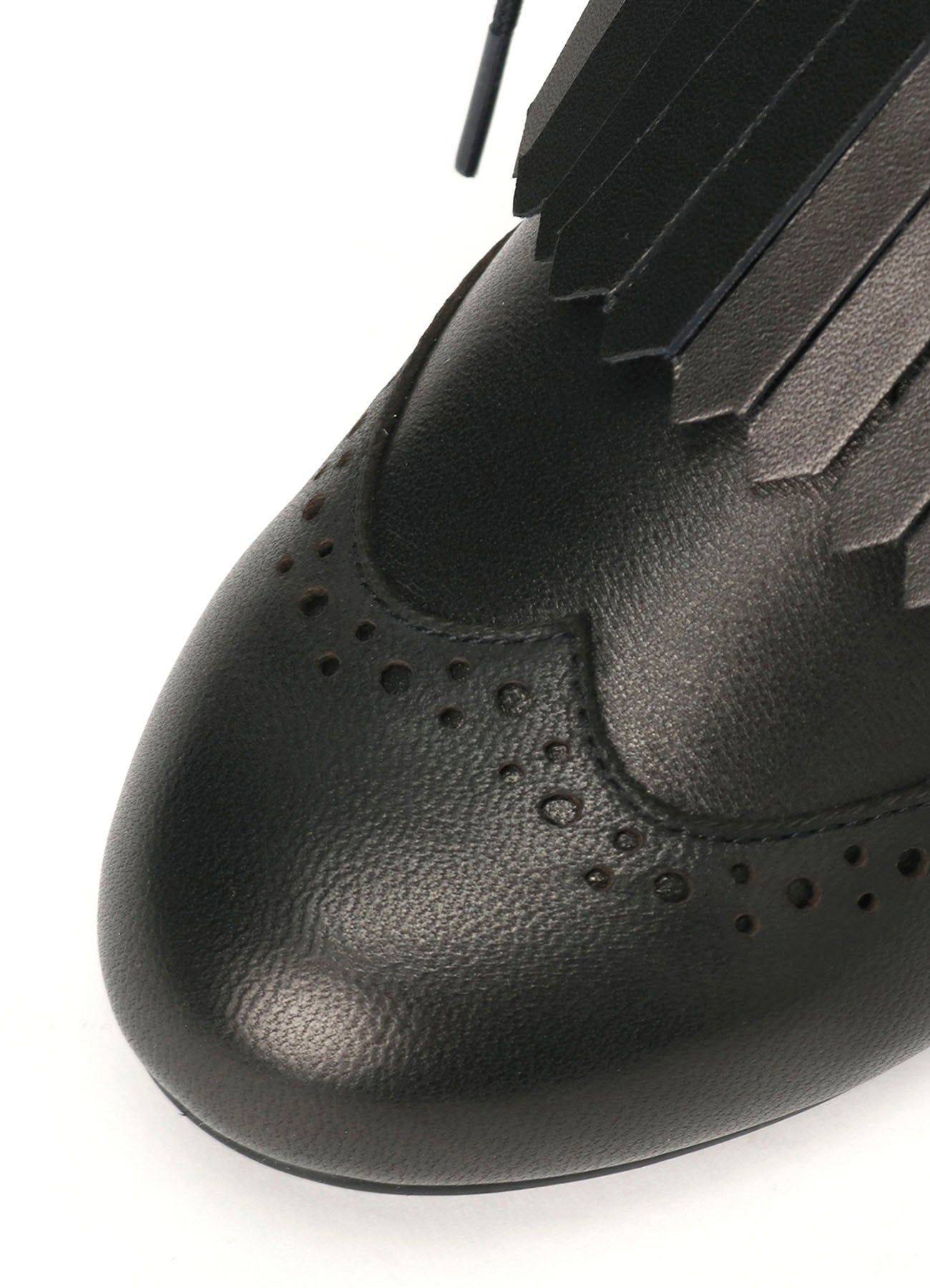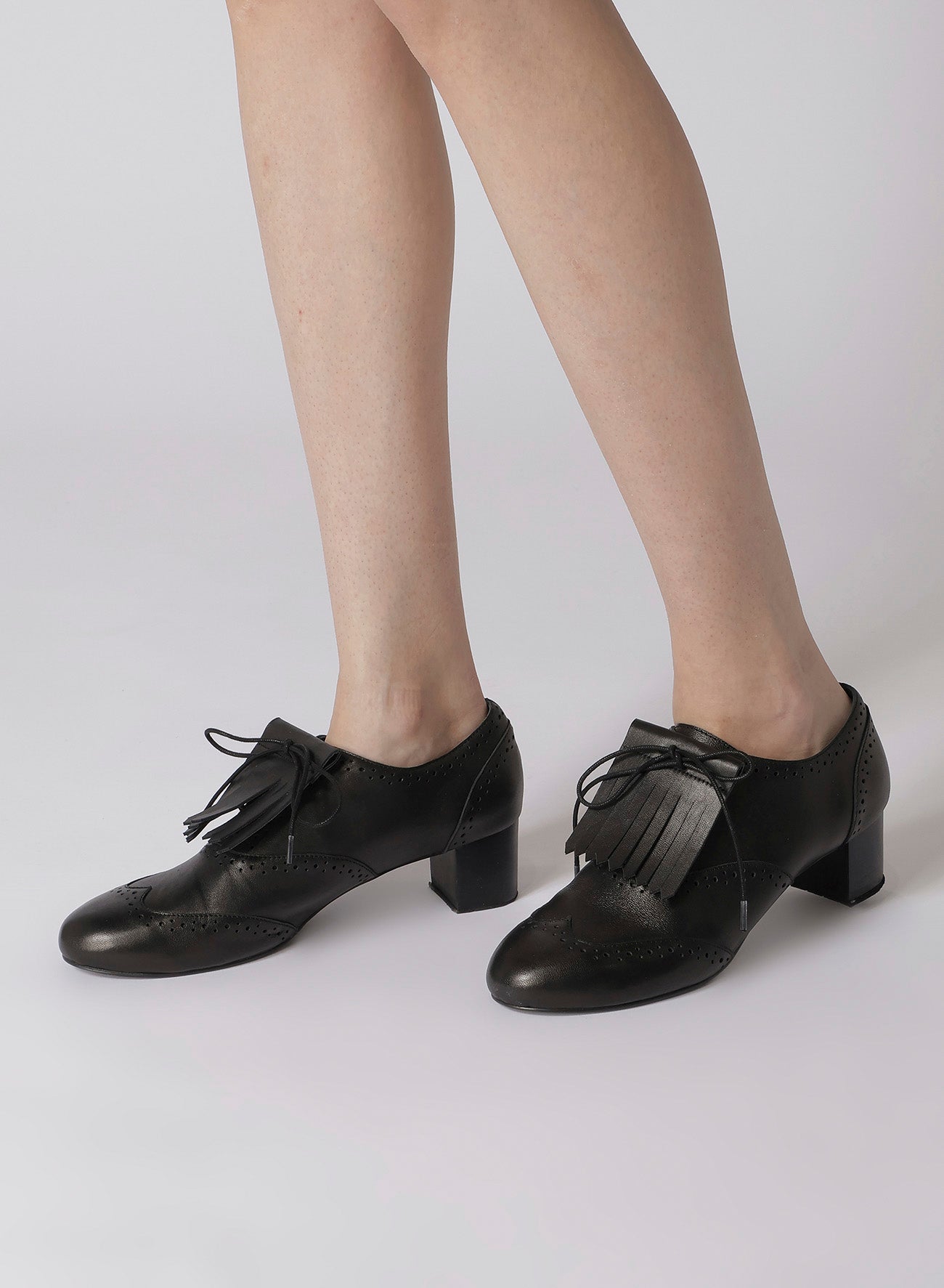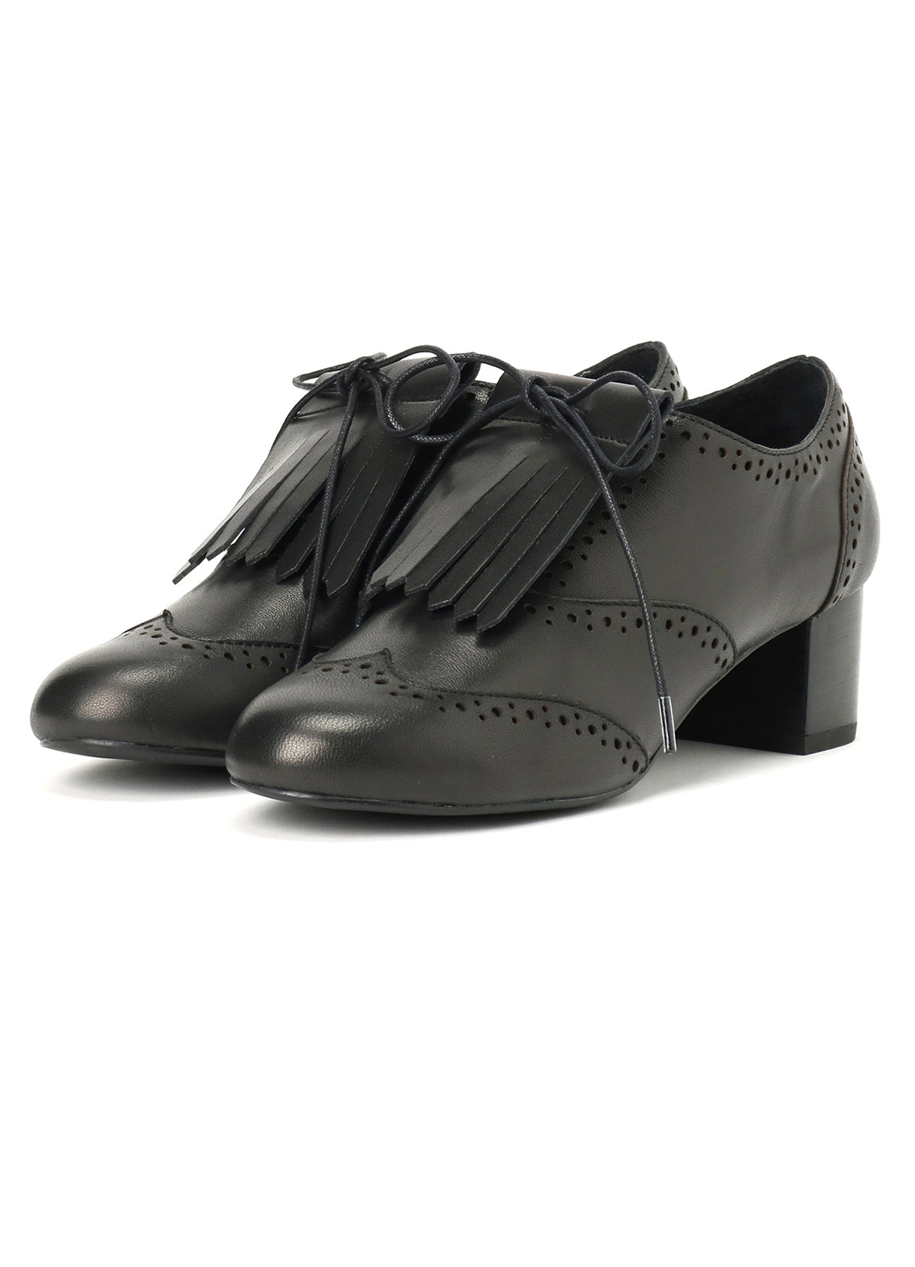 A slightly chunky-heeled Wingtip Medallion shoe featuring mudguards and stack heels. These shoes graced the Paris Collection runway. They provide a stylish, yet practical choice for any elegant ensemble.