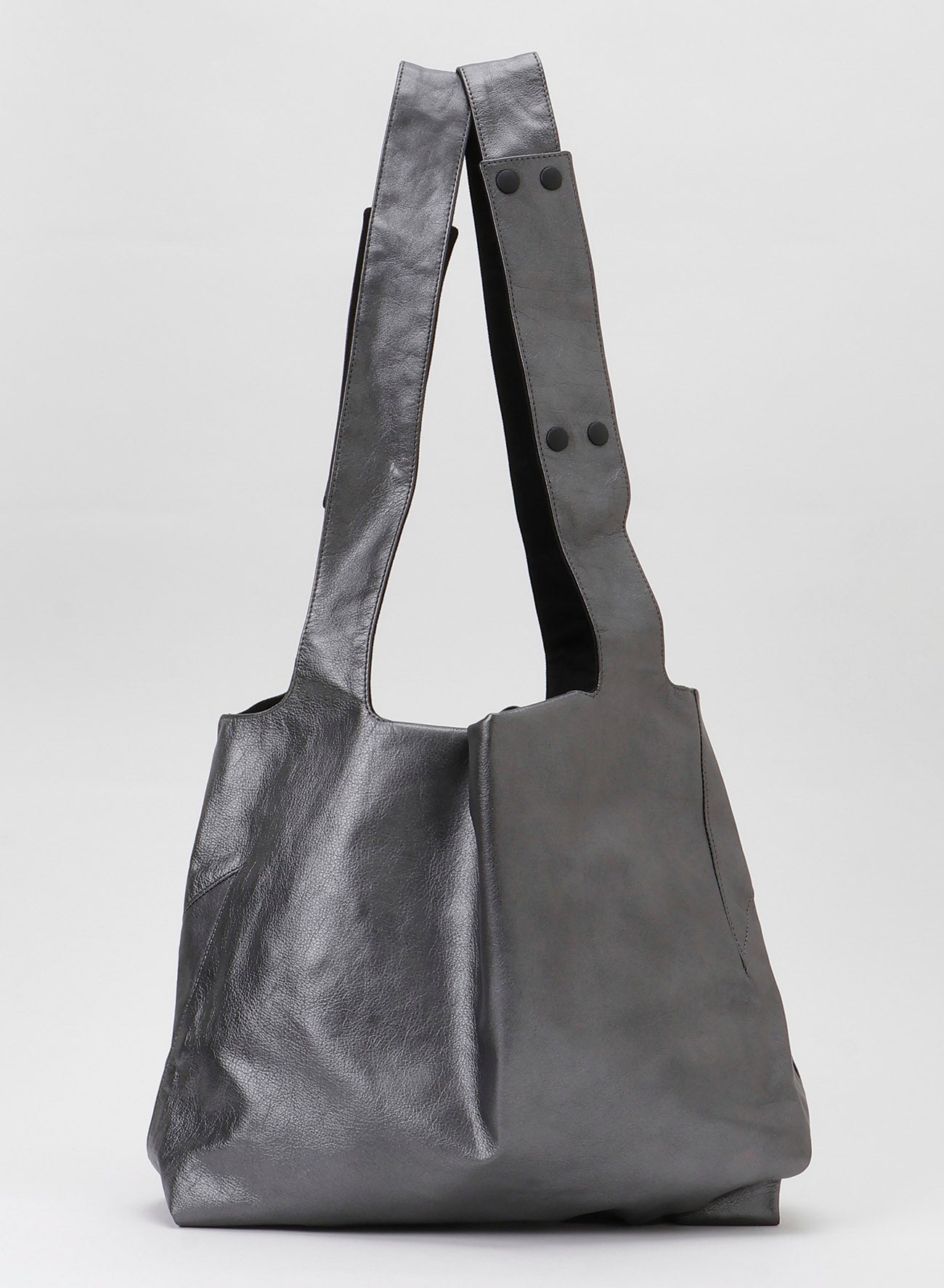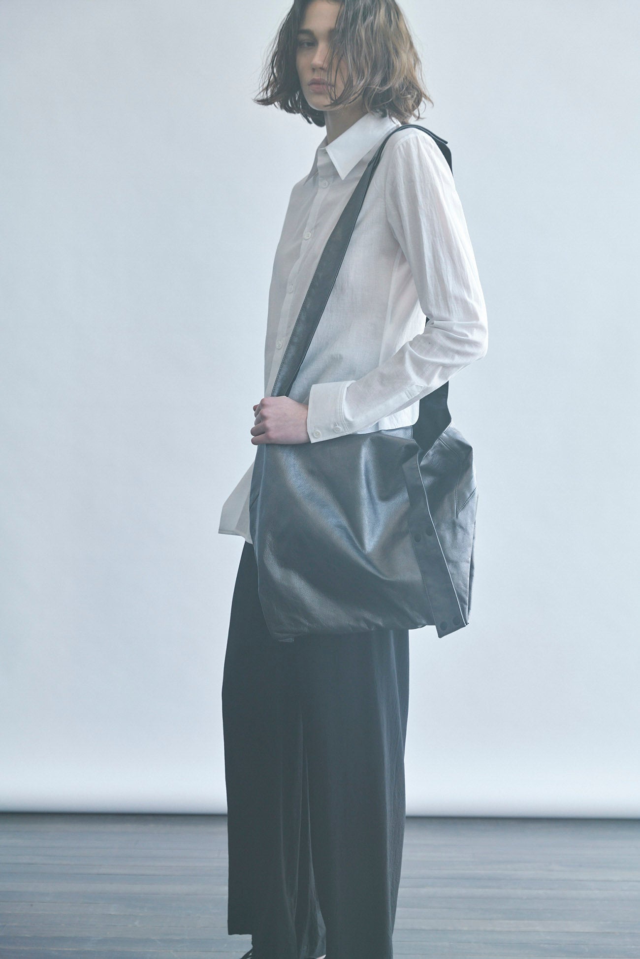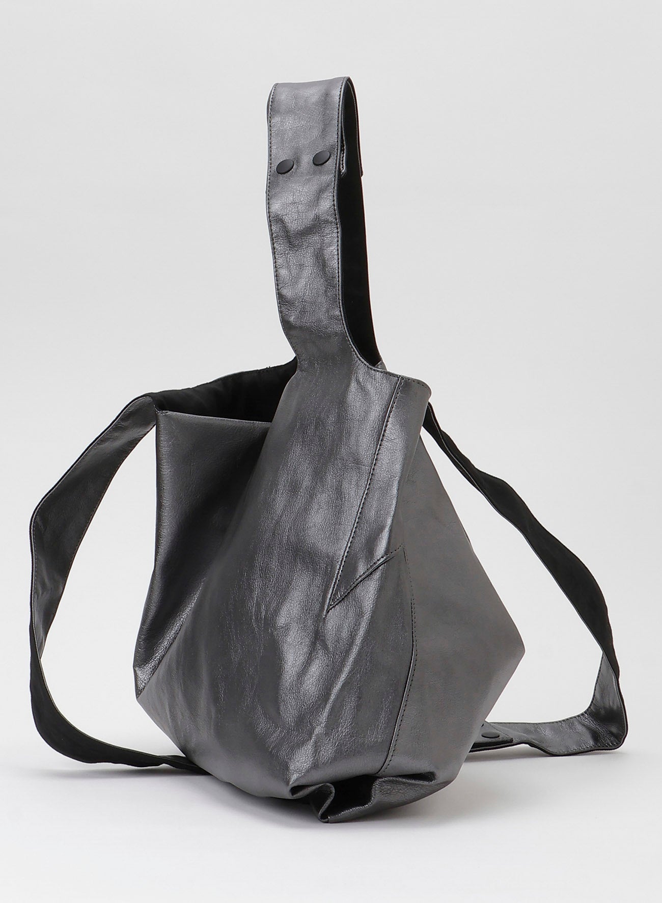 The new color variant of the signature "INFINITE" design, available in size S, features clip buttons allowing for versatile 8-way usage. This reversible piece combines shiny garment leather with cotton twill. The unique Y-shaped side seams add a playful touch. Note, natural leather may exhibit slight imperfections or color variations.