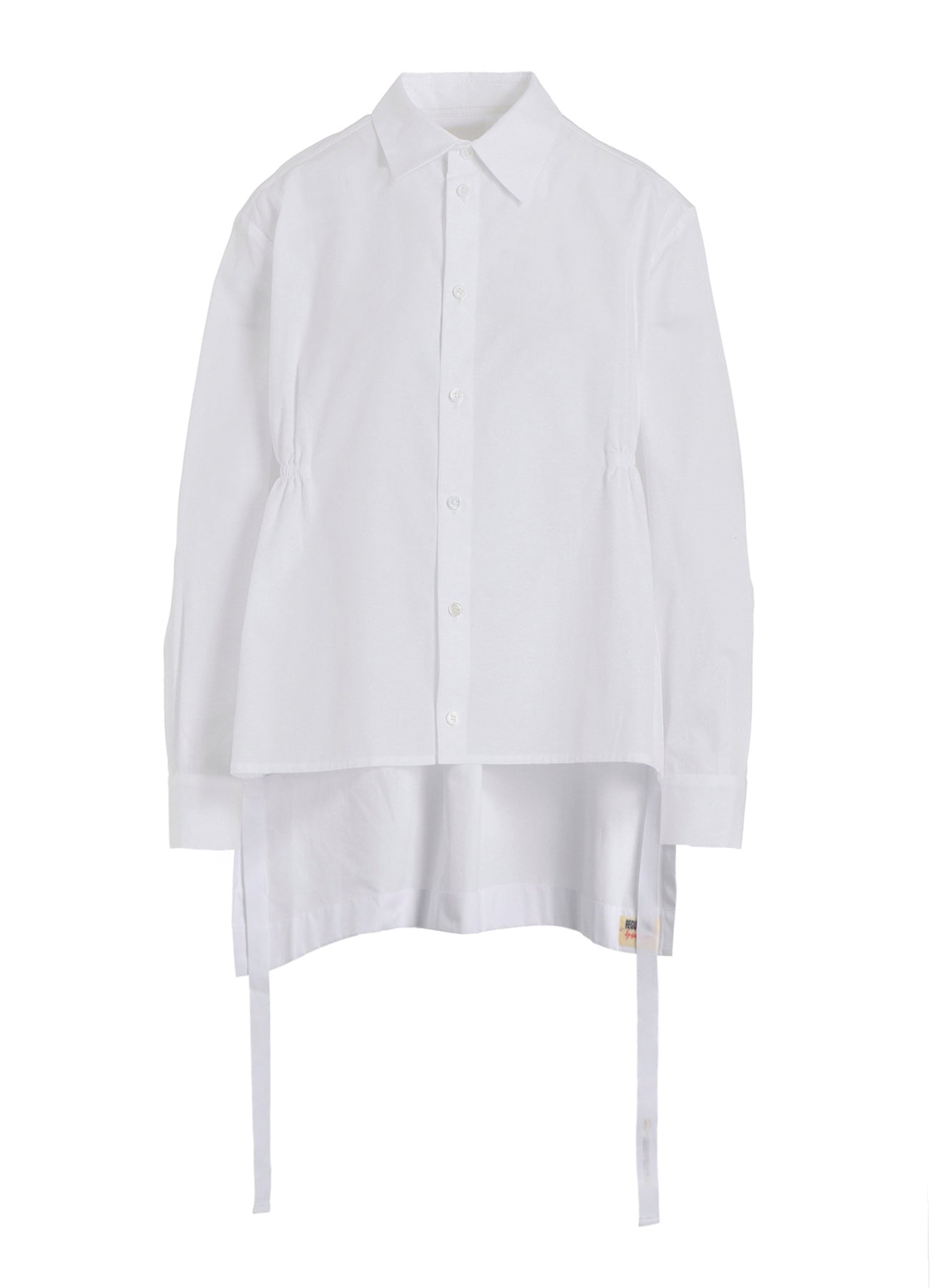 A waist-gathered shirt crafted from Yohji Yamamoto's signature broadcloth, offering adjustable silhouettes through drawstring technique. The fabric's structure enhances its 3D silhouette. Note: Model images use sample items; actual products may vary in size and texture.