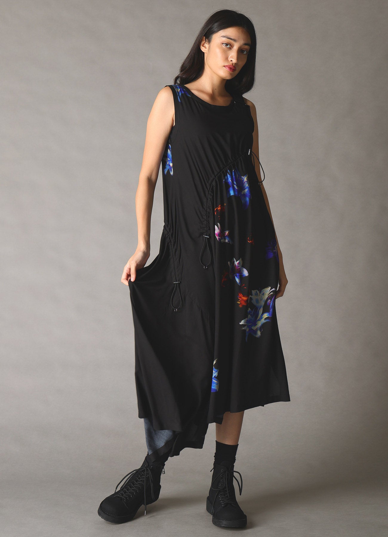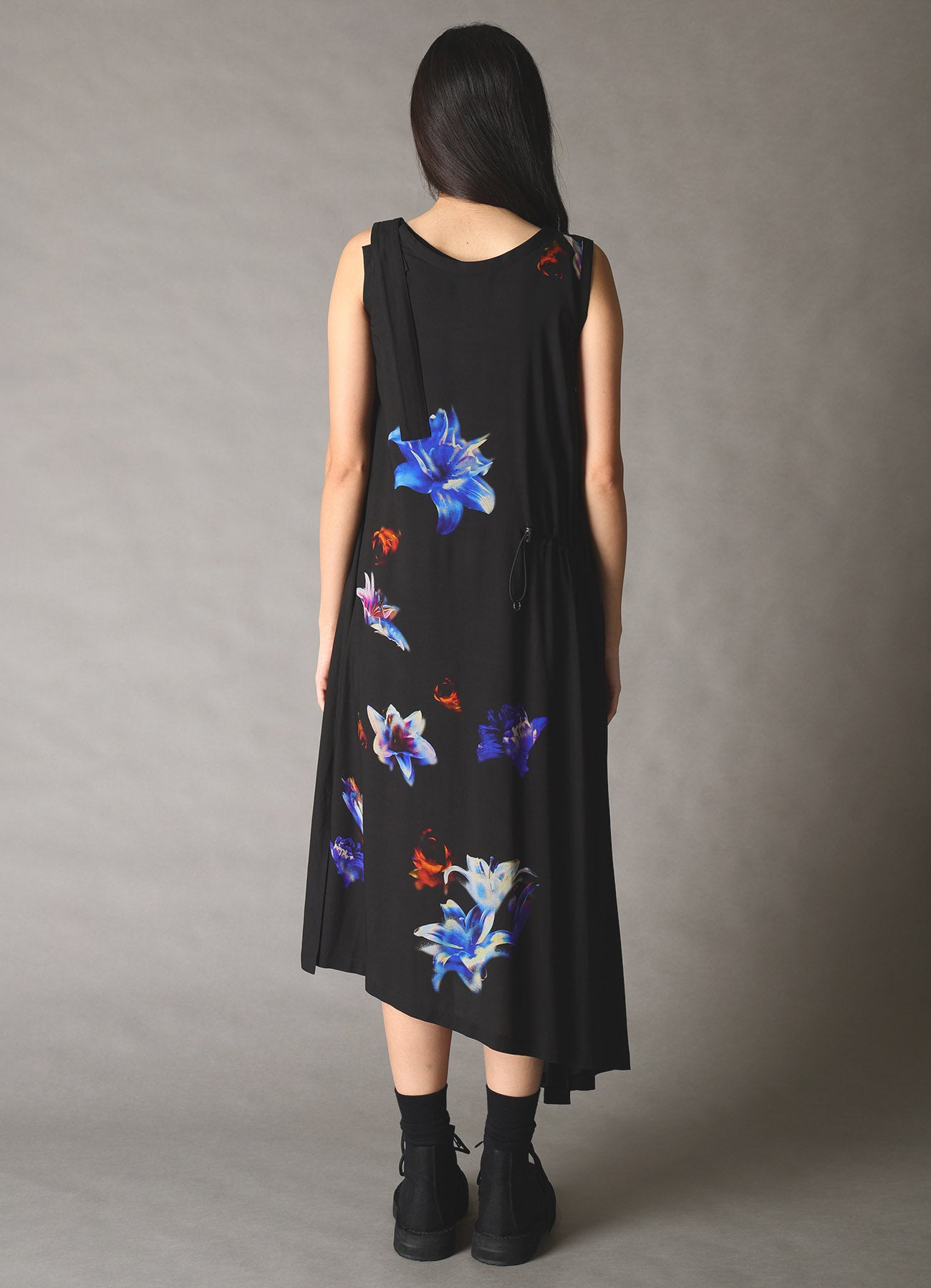 This asymmetric dress features a lily pattern and is crafted from vividly inkjet-printed rayon fabric with a refined sheen, excellent drapery, and color vibrancy. The dress includes an adjustable drawstring for silhouette customization, an adjustable shoulder belt on the left, a double piping pocket on the left waist, and a slit on the left hem.