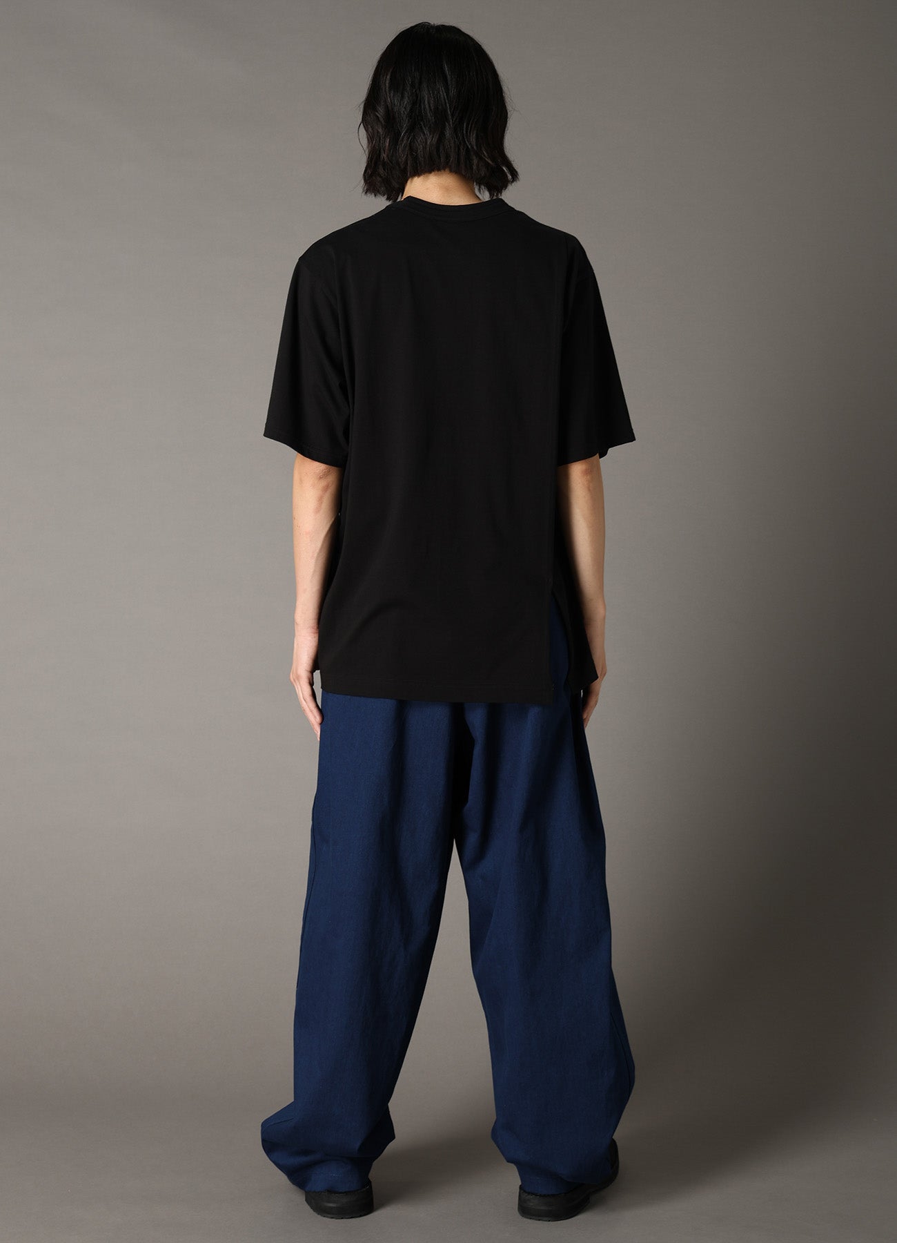 The top from Ground Y's 2026 Spring/Summer Collection features a smooth, silk-like texture and sheen, made from 100% cotton silket plain stitch fabric. It’s adorned with a vibrant blue floral pattern via inkjet print. The two-tiered neckline created by vertical combination stitches adds a subtle accent.