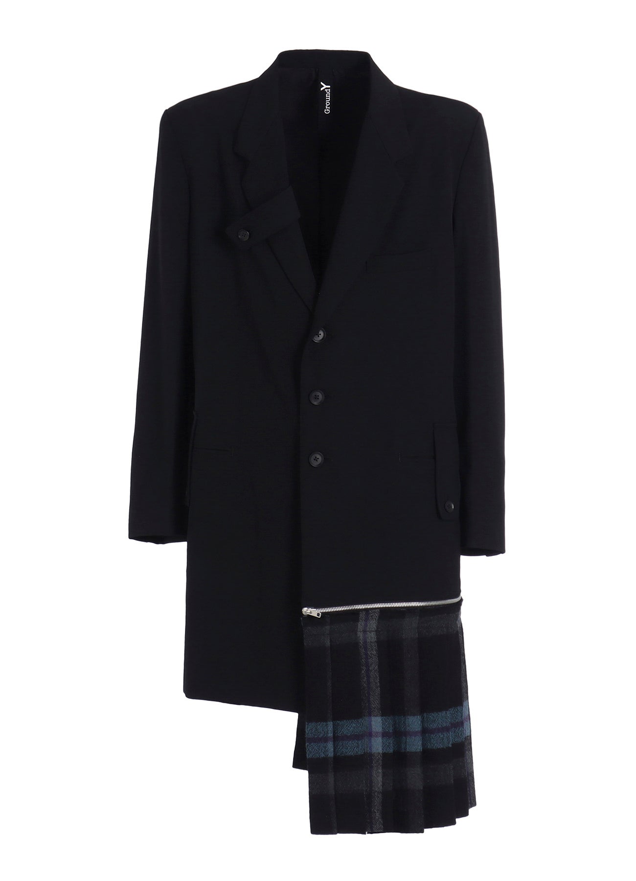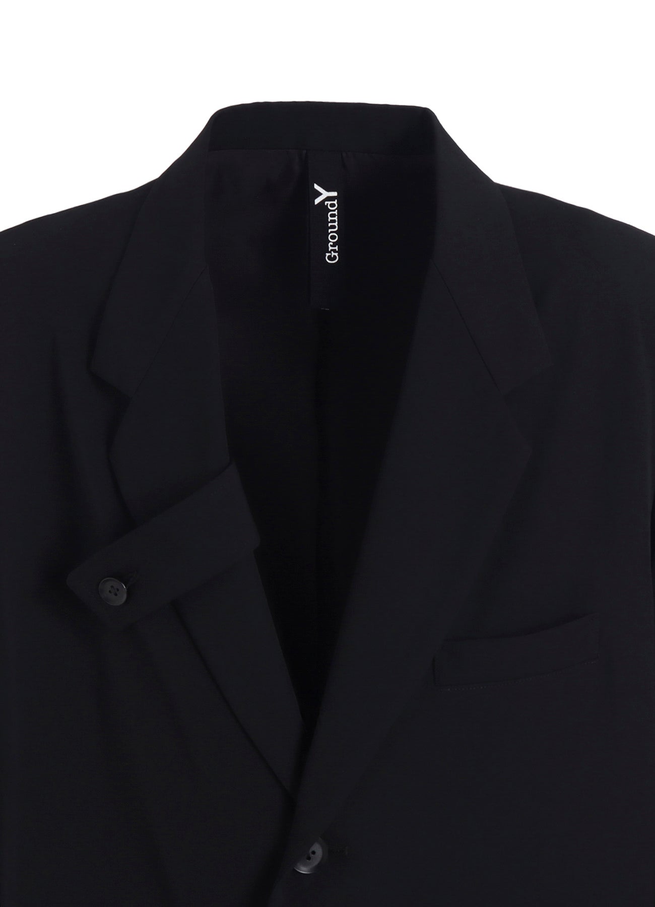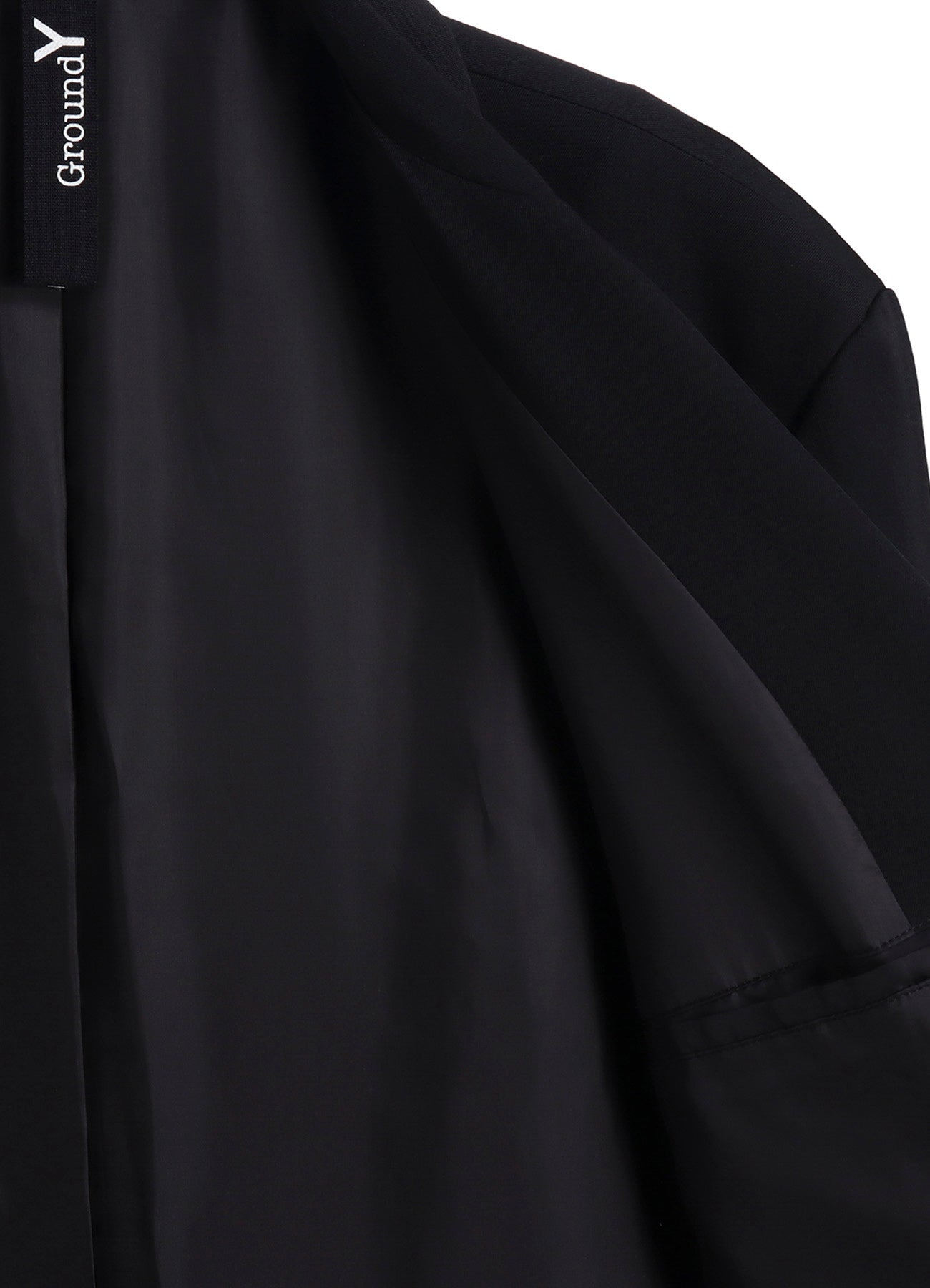 Ground Y 2025-26 秋冬系列展示了一款不对称夹克,右侧驳头和腰部口袋有装饰条,左侧下摆有可拆卸褶皱面料。夹克采用标志性华达呢羊毛材质,质地紧密精致,褶皱具有温暖视觉和柔软质感。
