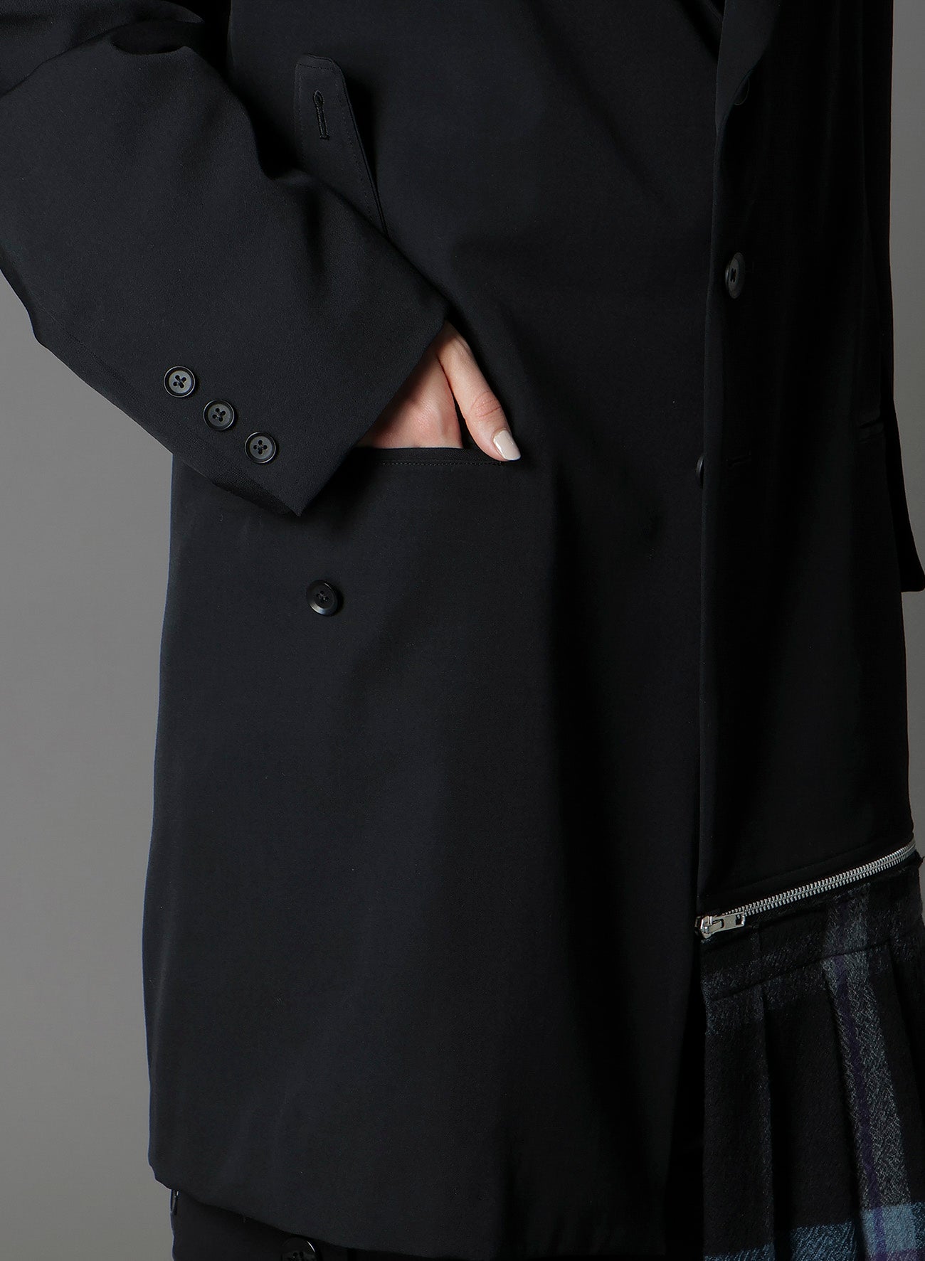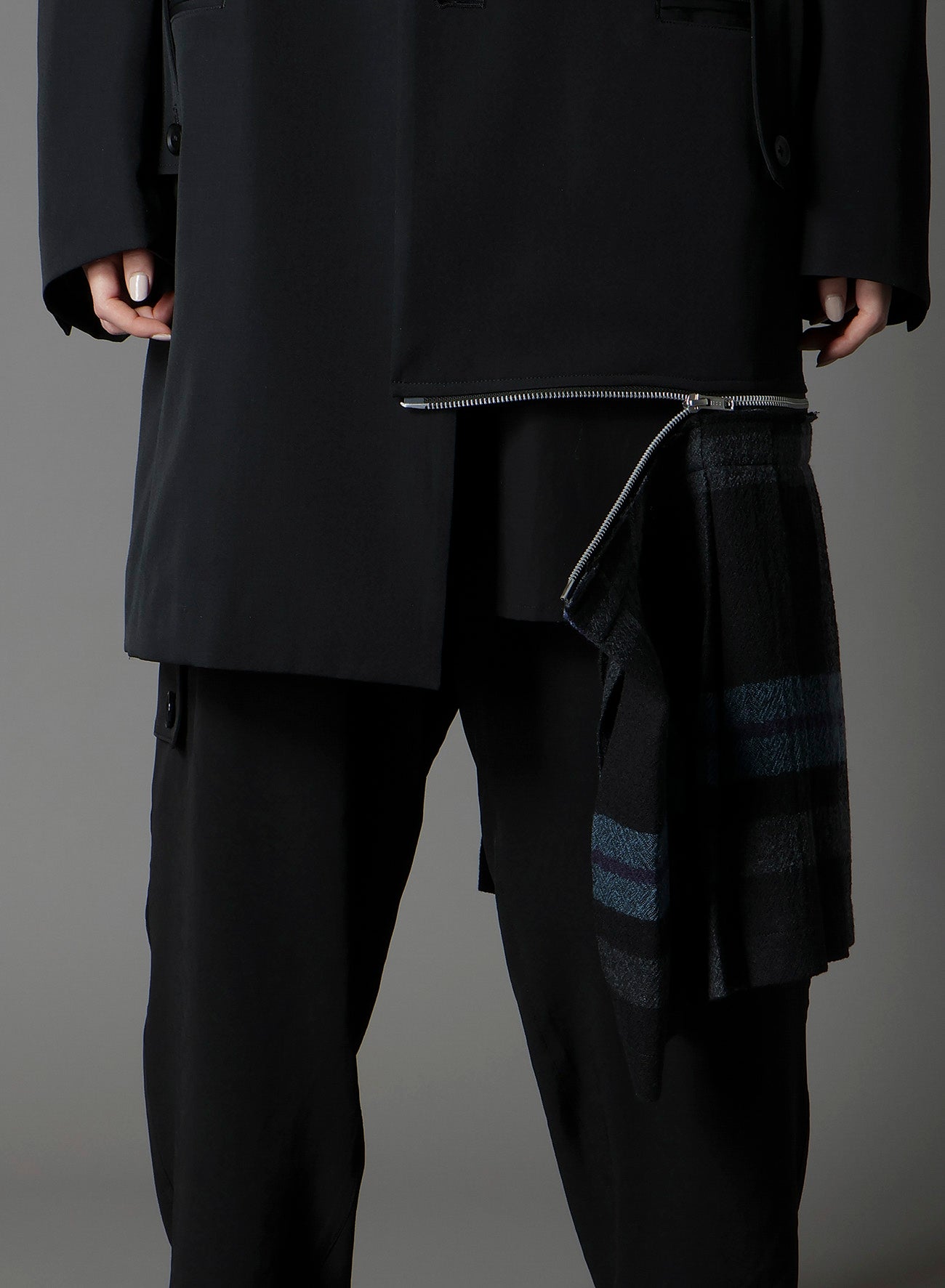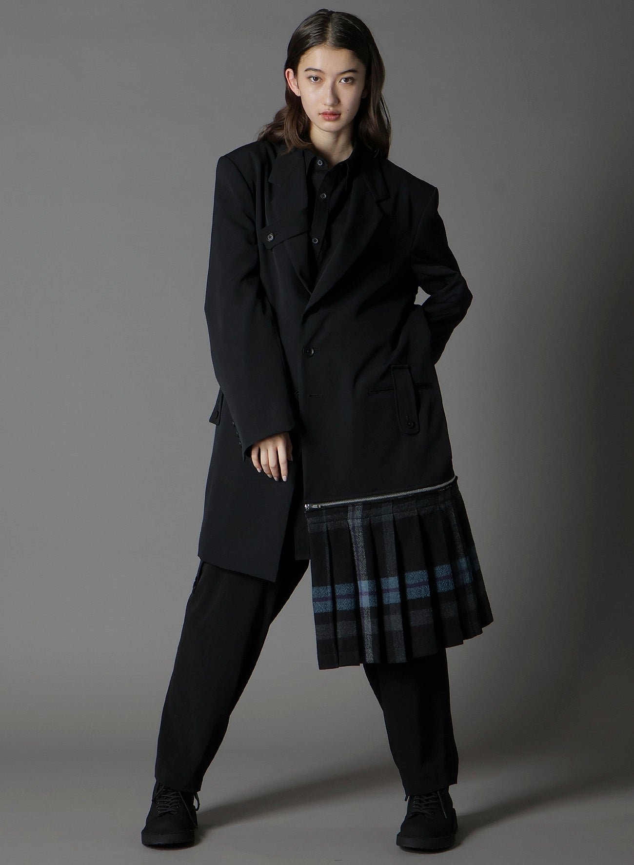 Ground Y 2025-26 秋冬系列展示了一款不对称夹克,右侧驳头和腰部口袋有装饰条,左侧下摆有可拆卸褶皱面料。夹克采用标志性华达呢羊毛材质,质地紧密精致,褶皱具有温暖视觉和柔软质感。