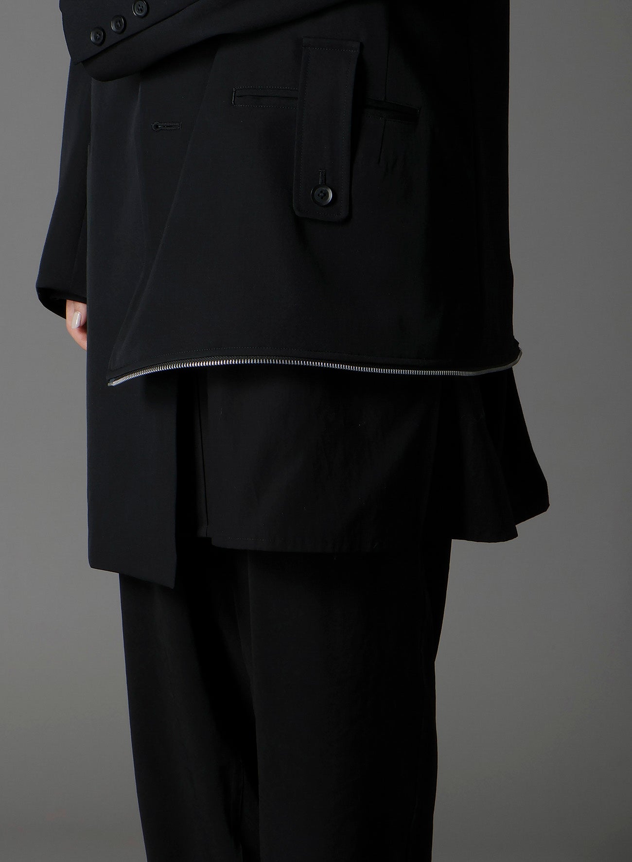 - 左侧下摆可拆卸褶皱面料,便于多样化造型。