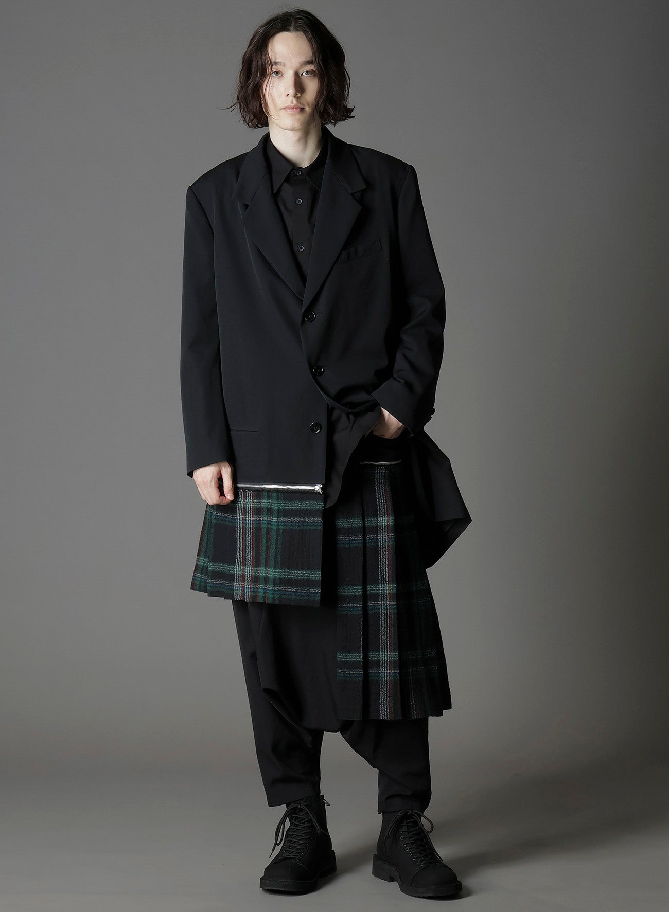 Ground Y 2025-26秋冬系列推出多功能“褶皱×拉链”系列,以不对称剪裁和可拆卸褶皱实现多样风格。沙漏裤左侧配可拆卸褶皱布料和多个拉链口袋。使用标志性羊毛华达呢面料,提供高密度、精致触感,具有独特水洗质感。