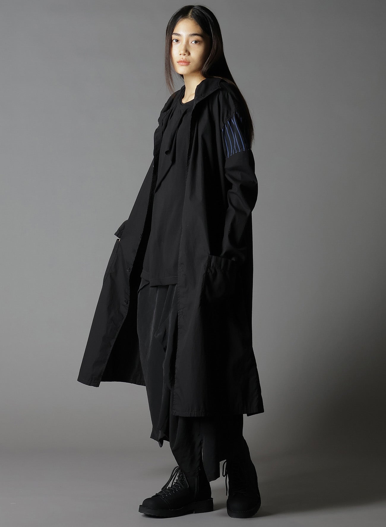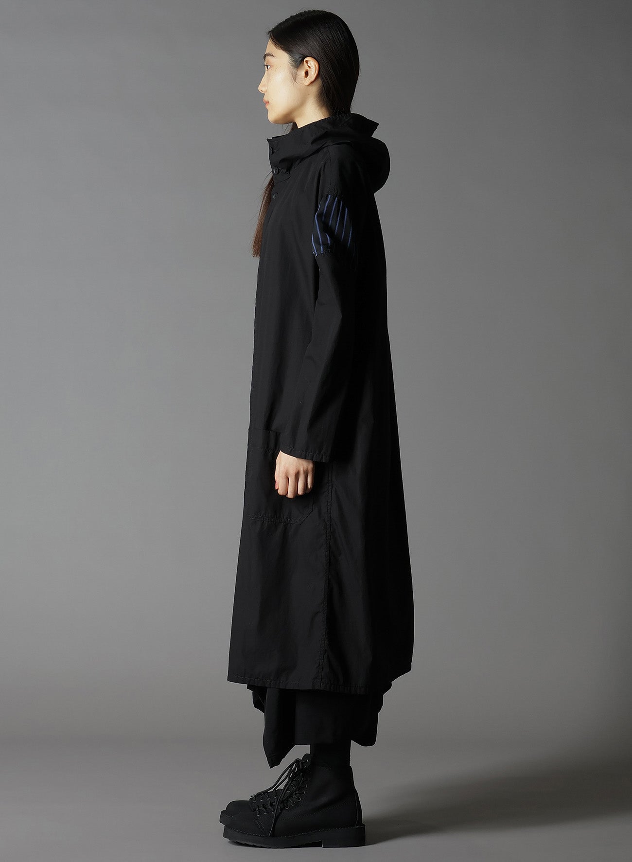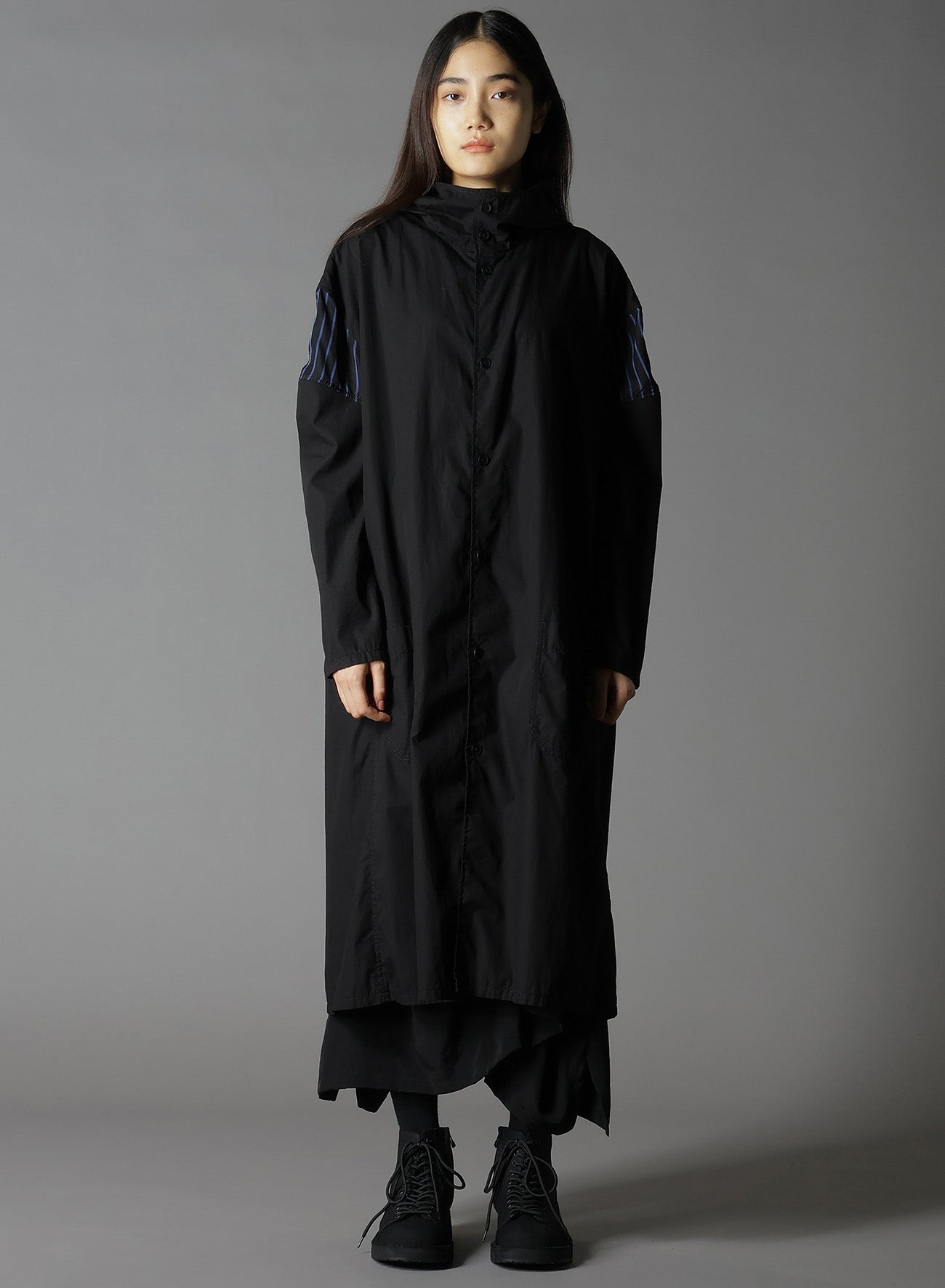 这款来自Ground Y 2025春夏系列的衬衣巧妙结合府绸与条纹面料。优雅设计细节包括连帽DRESS的袖口楔形条纹装饰。主面料府绸采用柔软棉制,适合春夏季节;条纹面料则由铜氨纤维制成。