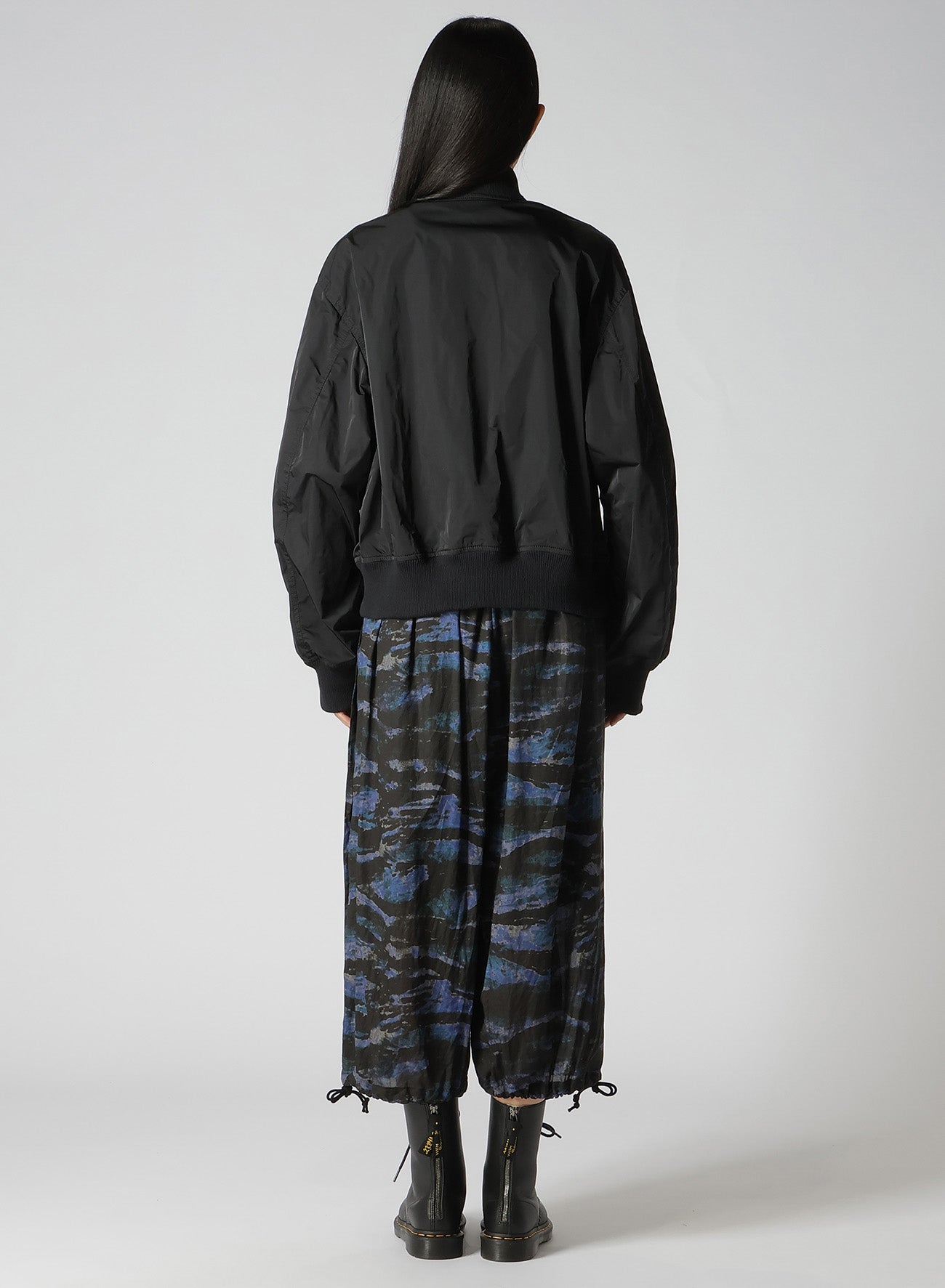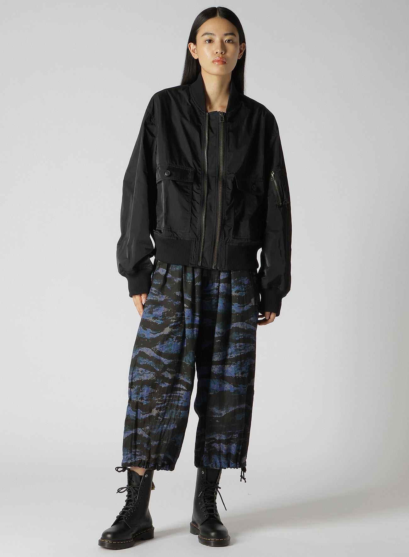 本季的季节主题是 MA-1。整体身段采用双缝线的褶皱设计,别具风味。由于配有两条前开拉链,您可以选择关闭内侧拉链以展现不对称设计,或关闭外侧拉链以收紧身幅。前身部分设有带翻盖的外袋,左袖上有拉链和扩展的小烟斗物品口袋。