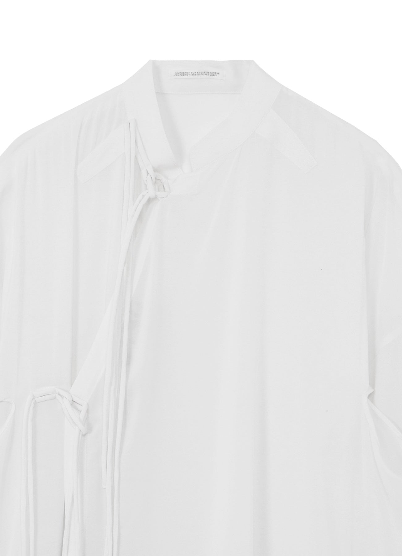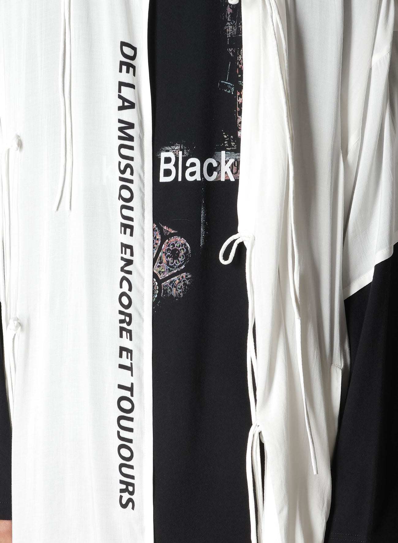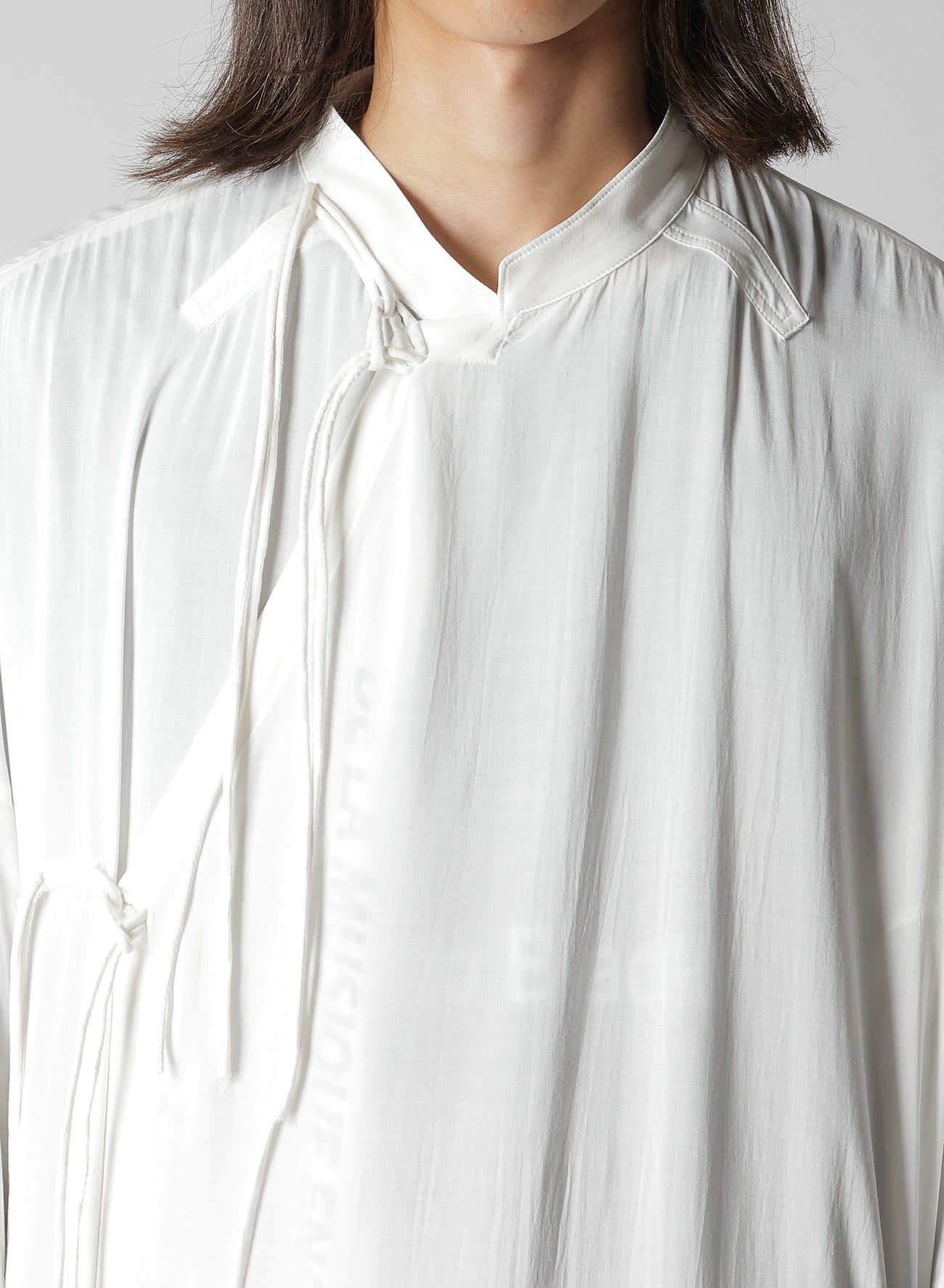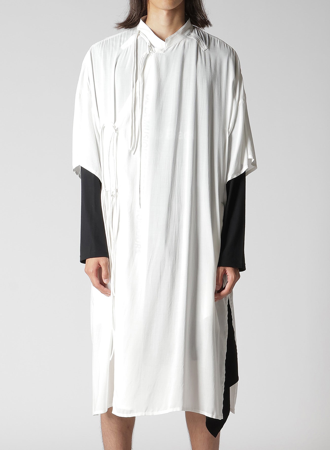 The Yohji Yamamoto POUR HOMME S/S 2026 Collection features a rayon-printed Chinese dress notable for its lightweight feel, drapery, and smooth texture. Designer messages are inkjet printed in a Kyoto factory, leveraging years of expertise to produce rich color depth.