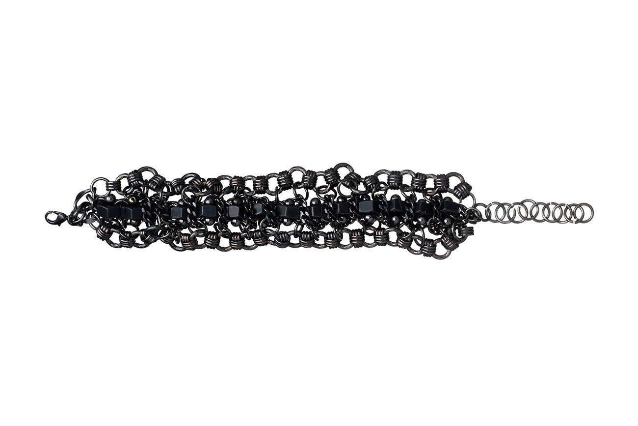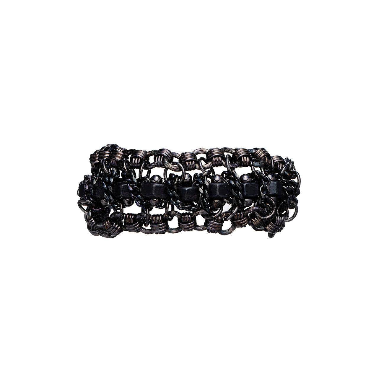 这款手链由金属链、齿轮形部件和多种材料组成,提供独特的质感。其设计旨在包裹身体,超越金属的冰冷感。单独佩戴或与其他配饰叠加,均能为您的造型增添深度。