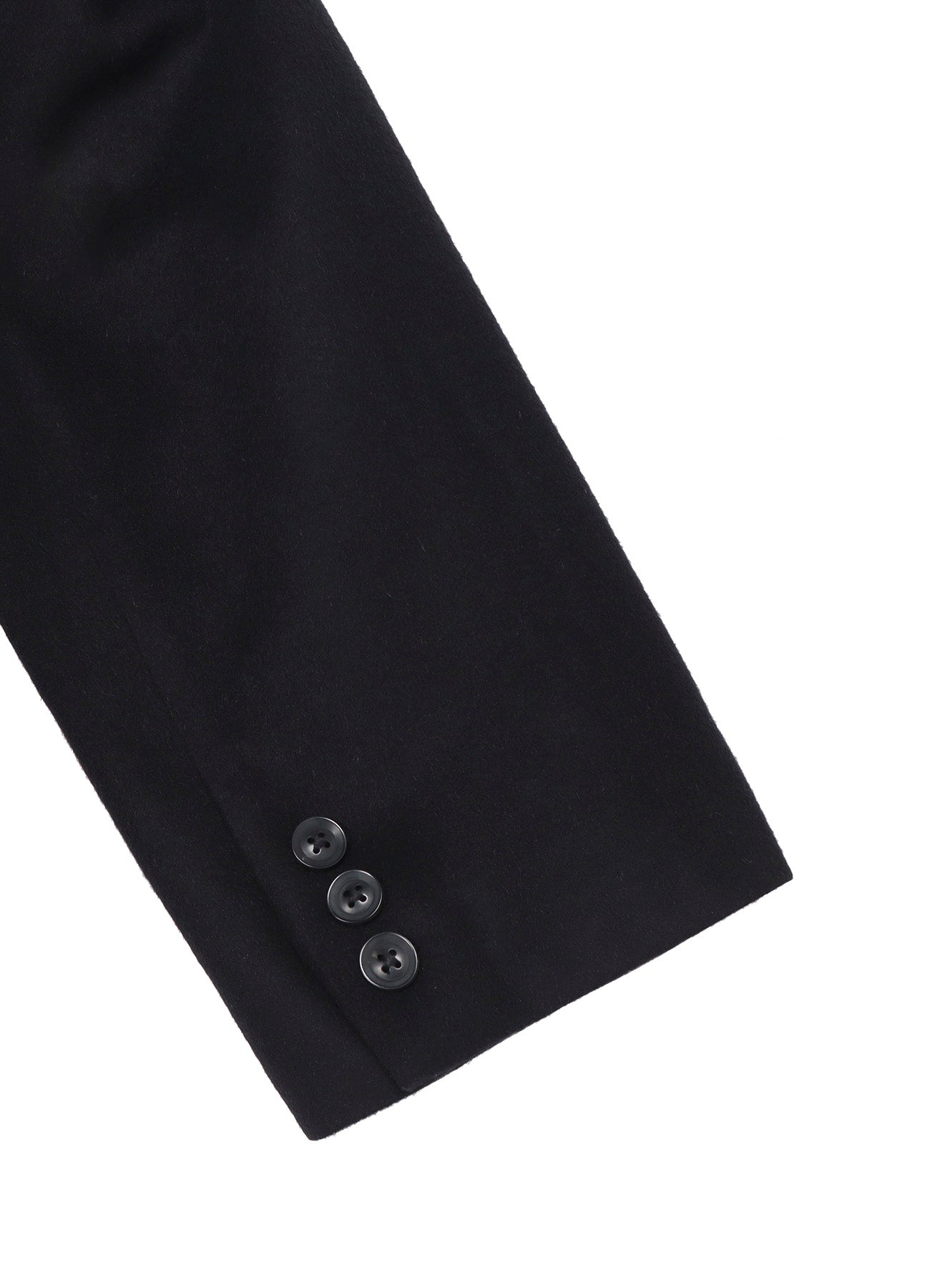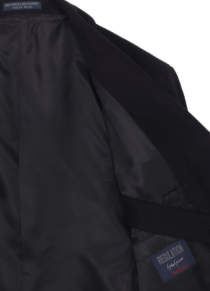 A REGULATION Yohji Yamamoto doctor jacket made from a wool and cashmere blend. The short beaver tailoring gives it a soft, shiny appearance. It features an inner belt to maintain its shape even when the front buttons are open.