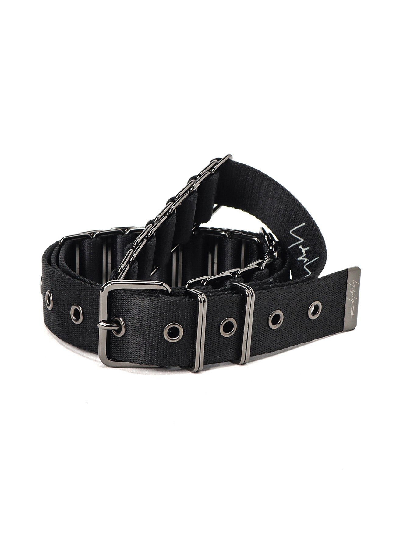 这是一个使用30毫米宽单面转印尼龙带的管状腰带。该带子编织成一个设计,展示了圆形金属丝压缩横截面形状转变为方形管的样子。
