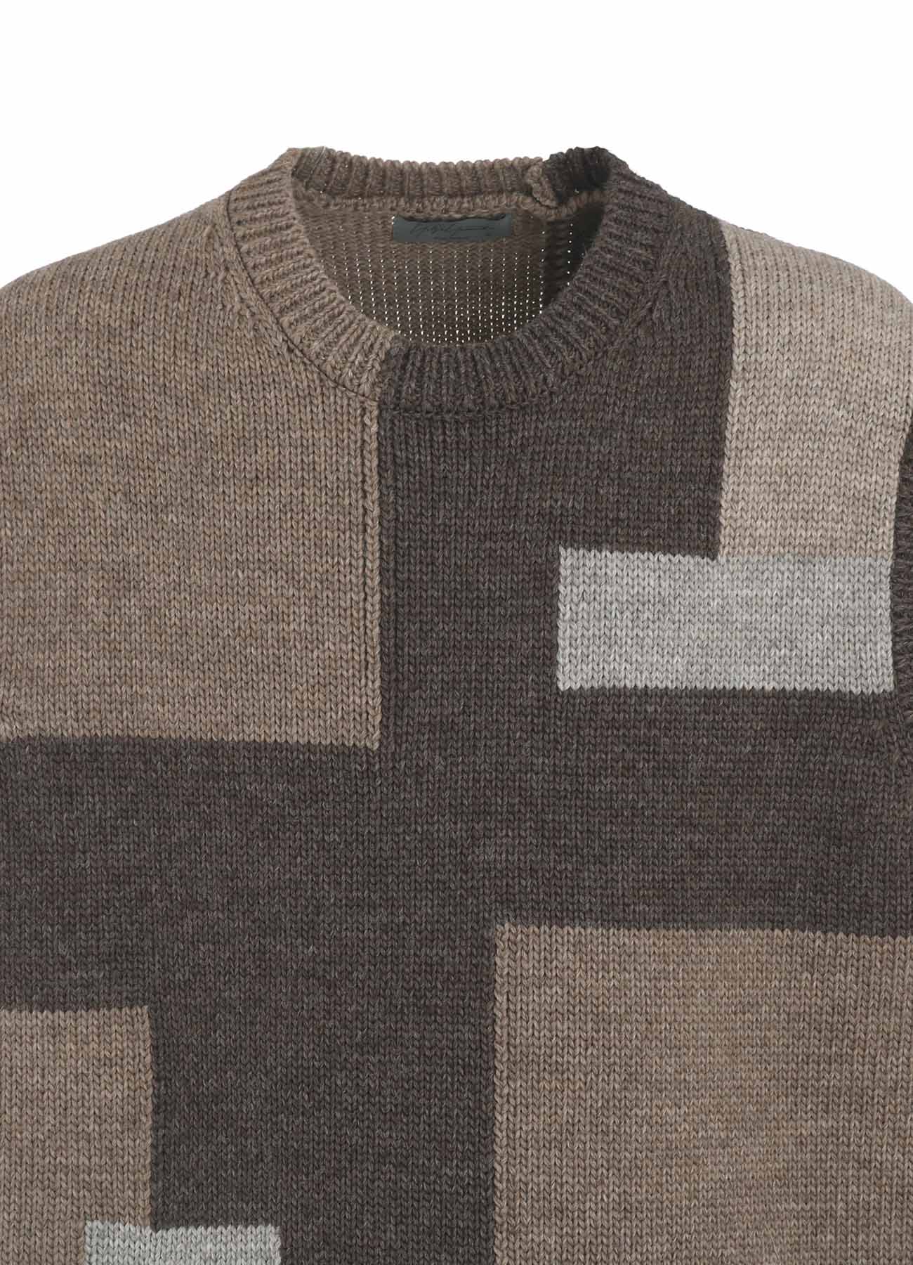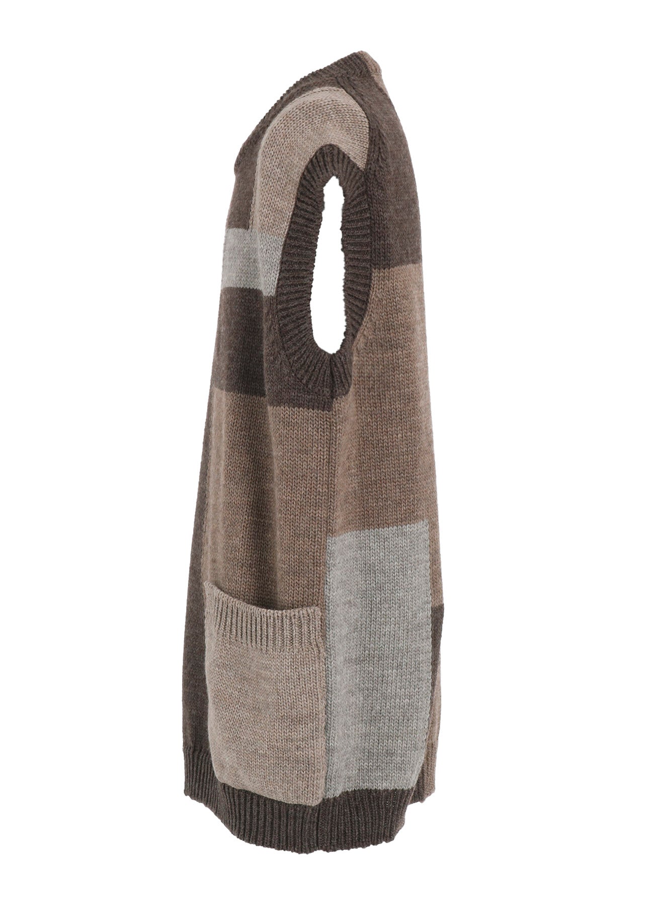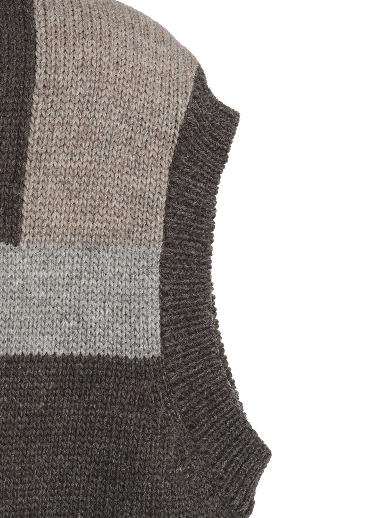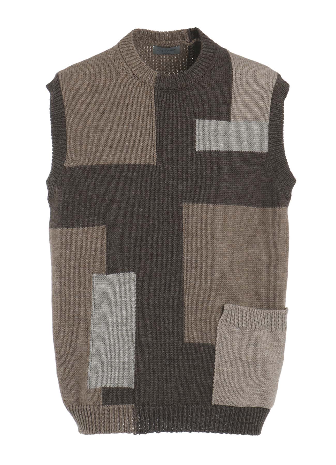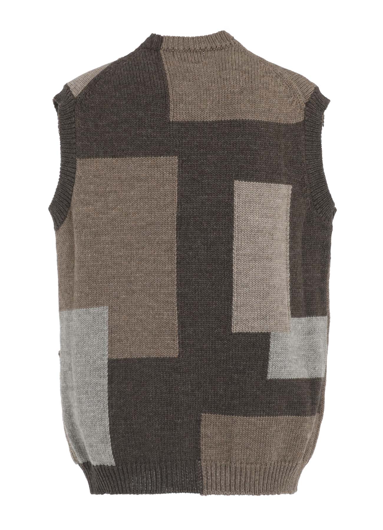 这款针织背心由100%羊毛制成,采用四种颜色的英国羊毛混纺。其设计仿佛拼布图案,具有羊毛织物特有的温暖和质感,使其在视觉上引人注目且保暖。