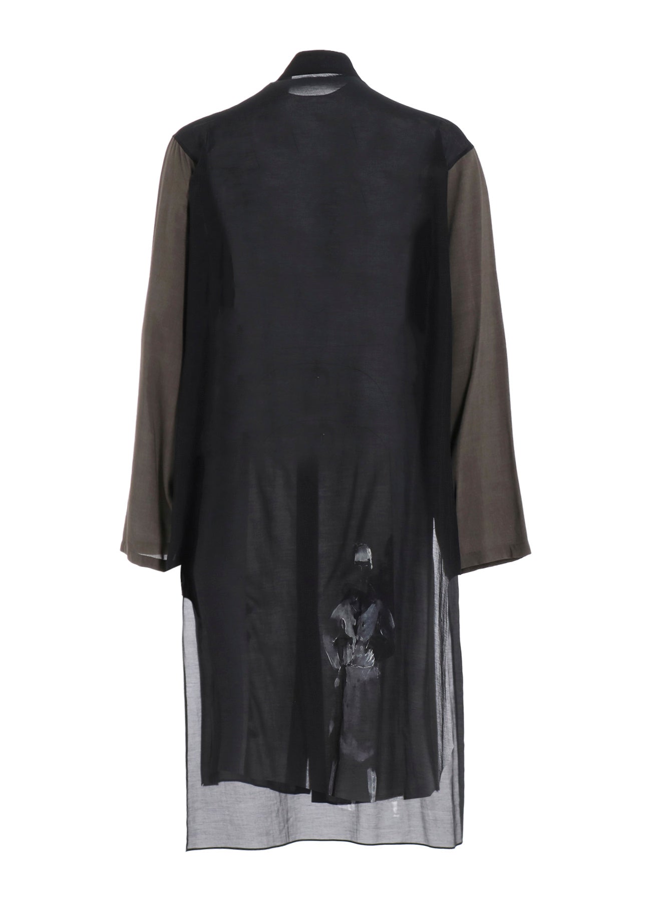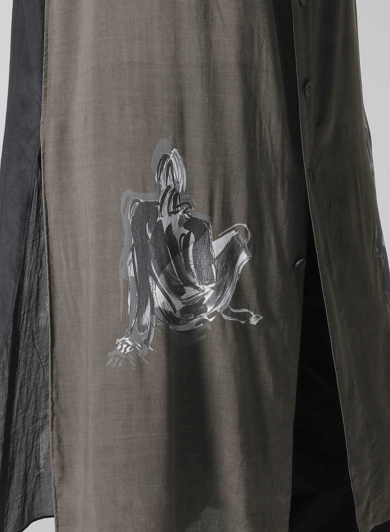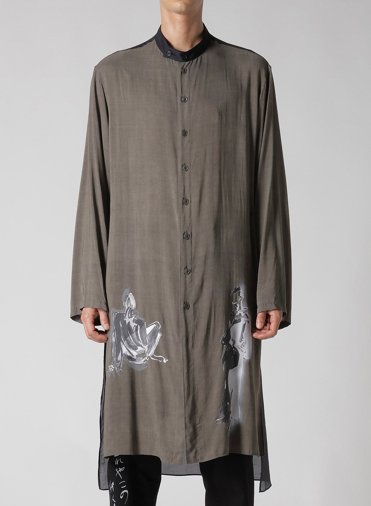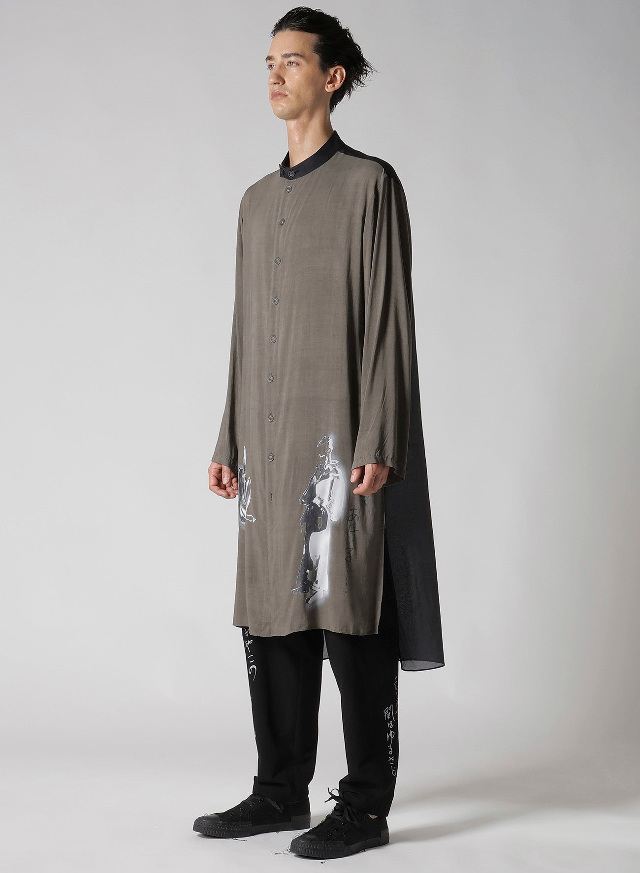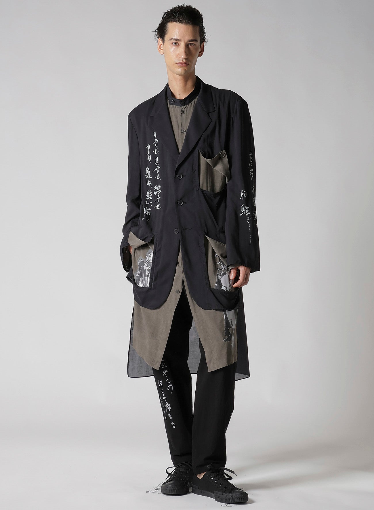 由Yohji Yamamoto POUR HOMME S/S 2025系列推出的长款衬衫,将光泽的丝绸与垂褶和京都西阵墨染人造丝相结合。工匠使用奈良墨水进行手工染色,同时面料上印有设计师的草图和手写信息。