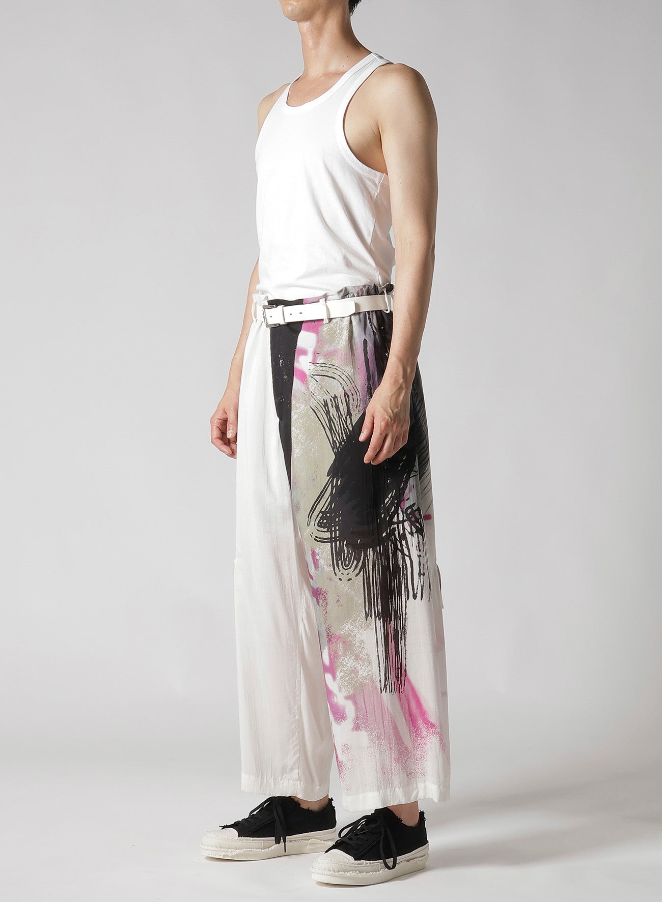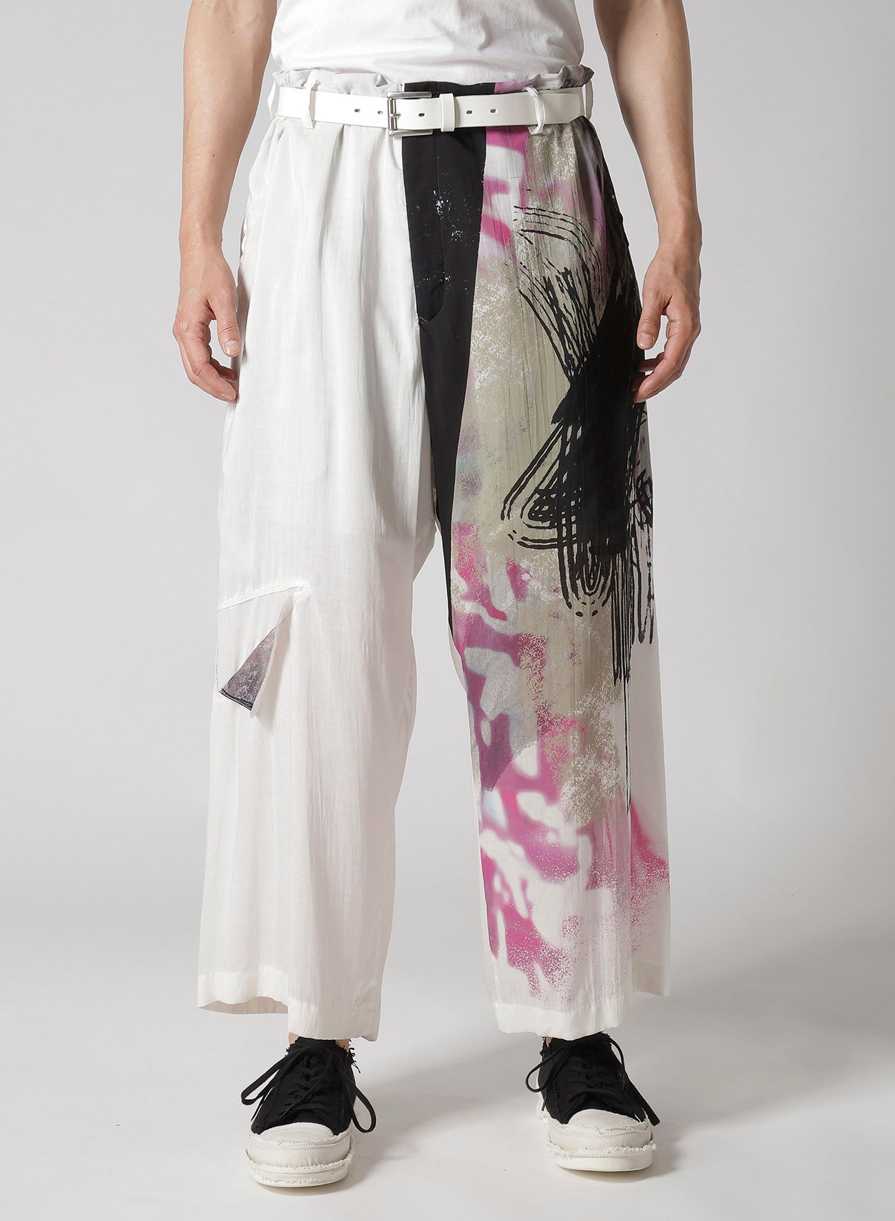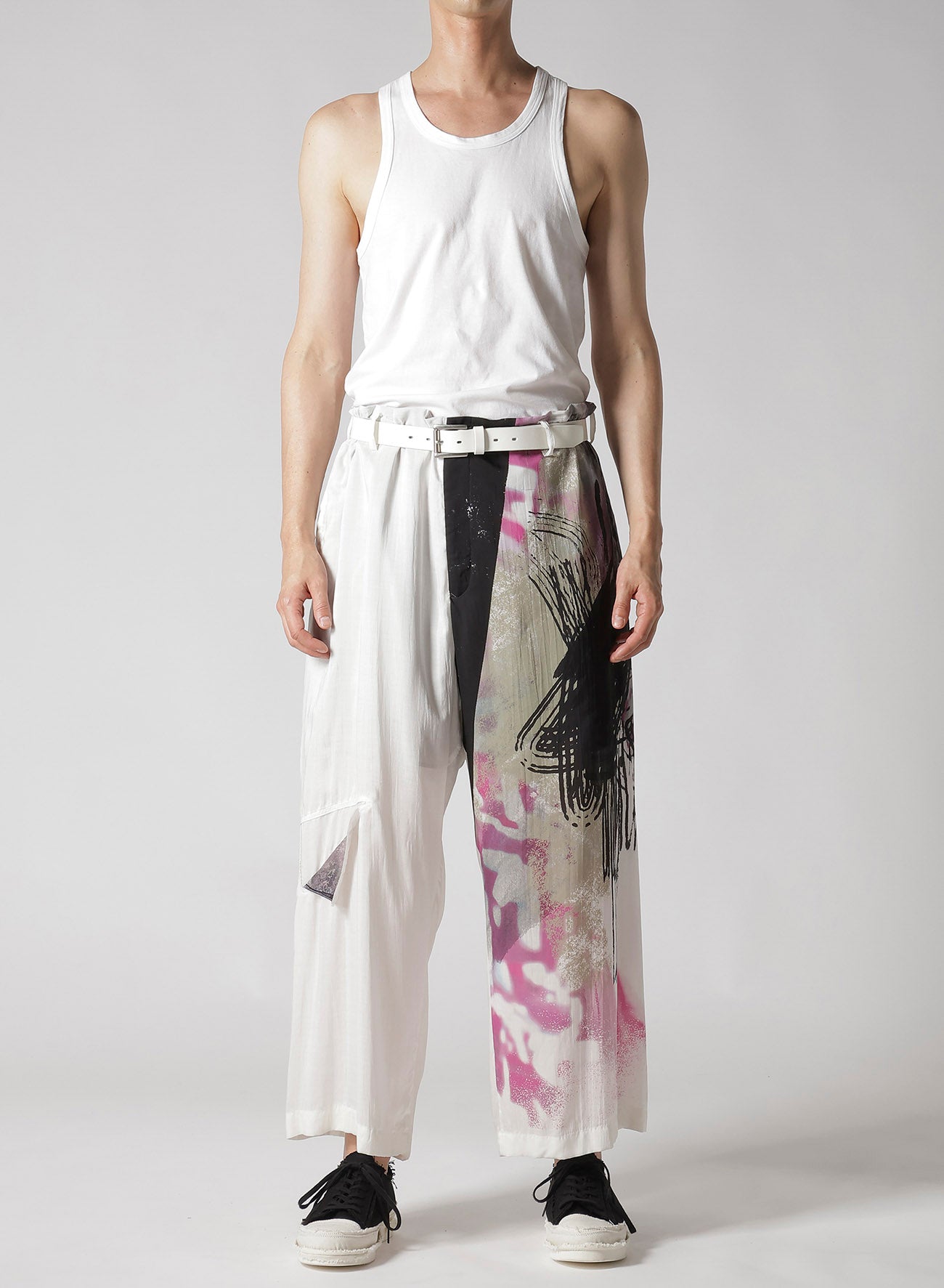 Yohji Yamamoto POUR HOMME的S/S 2025系列中,第5组的标志性裤子,采用独特的切片设计,展现身体之美,成为当季的标志。微形莫代尔草坪面料,采用在京都工厂喷墨印刷的原创图案。