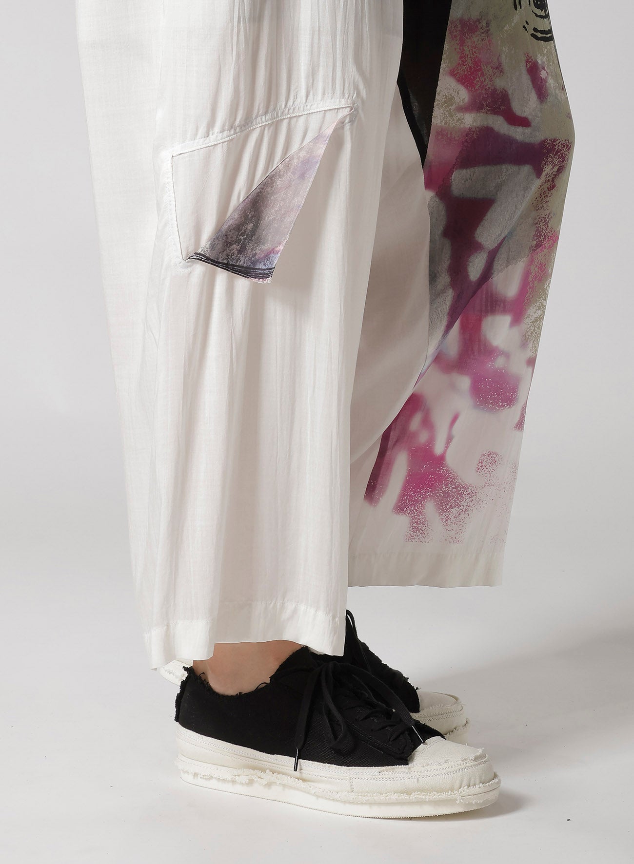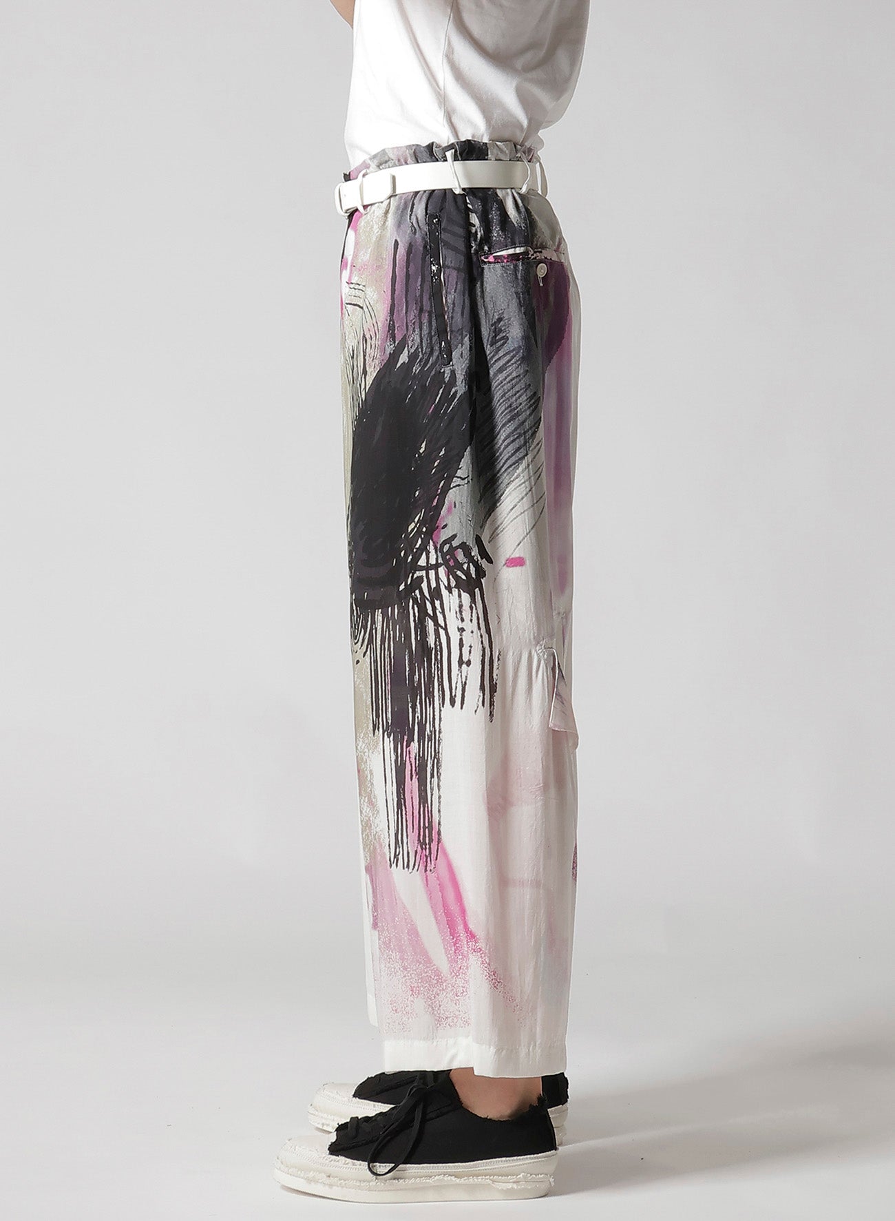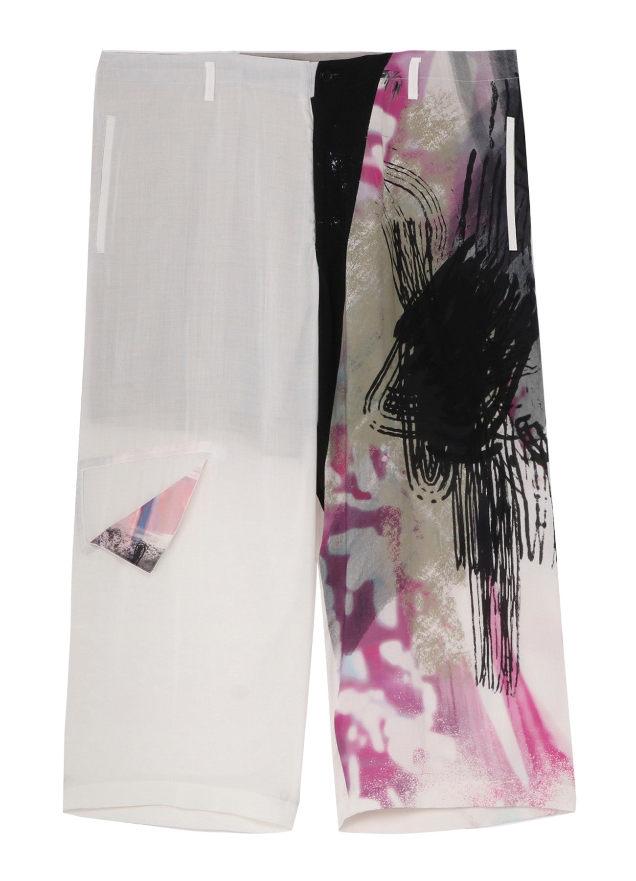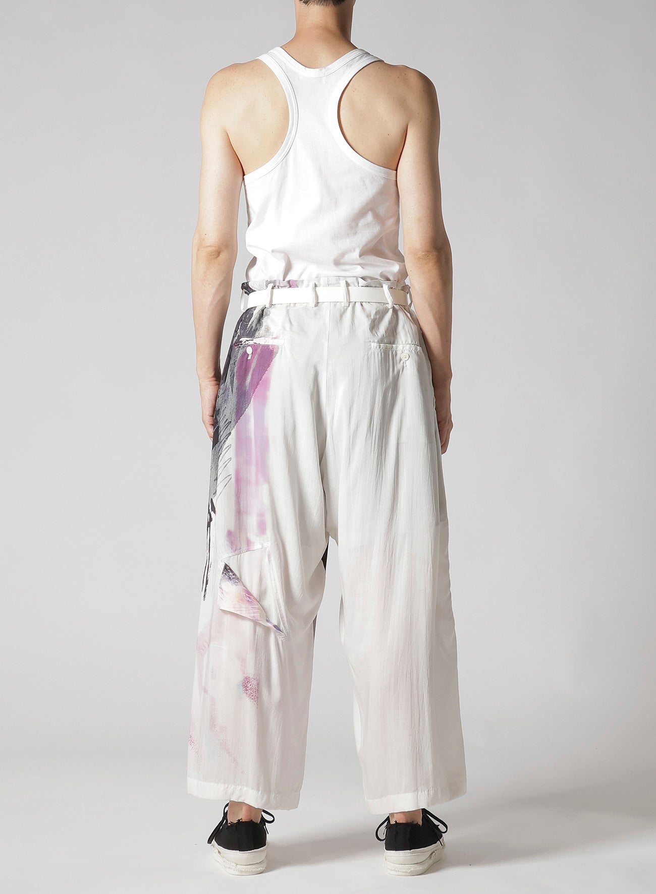 Yohji Yamamoto POUR HOMME的S/S 2025系列中,第5组的标志性裤子,采用独特的切片设计,展现身体之美,成为当季的标志。微形莫代尔草坪面料,采用在京都工厂喷墨印刷的原创图案。