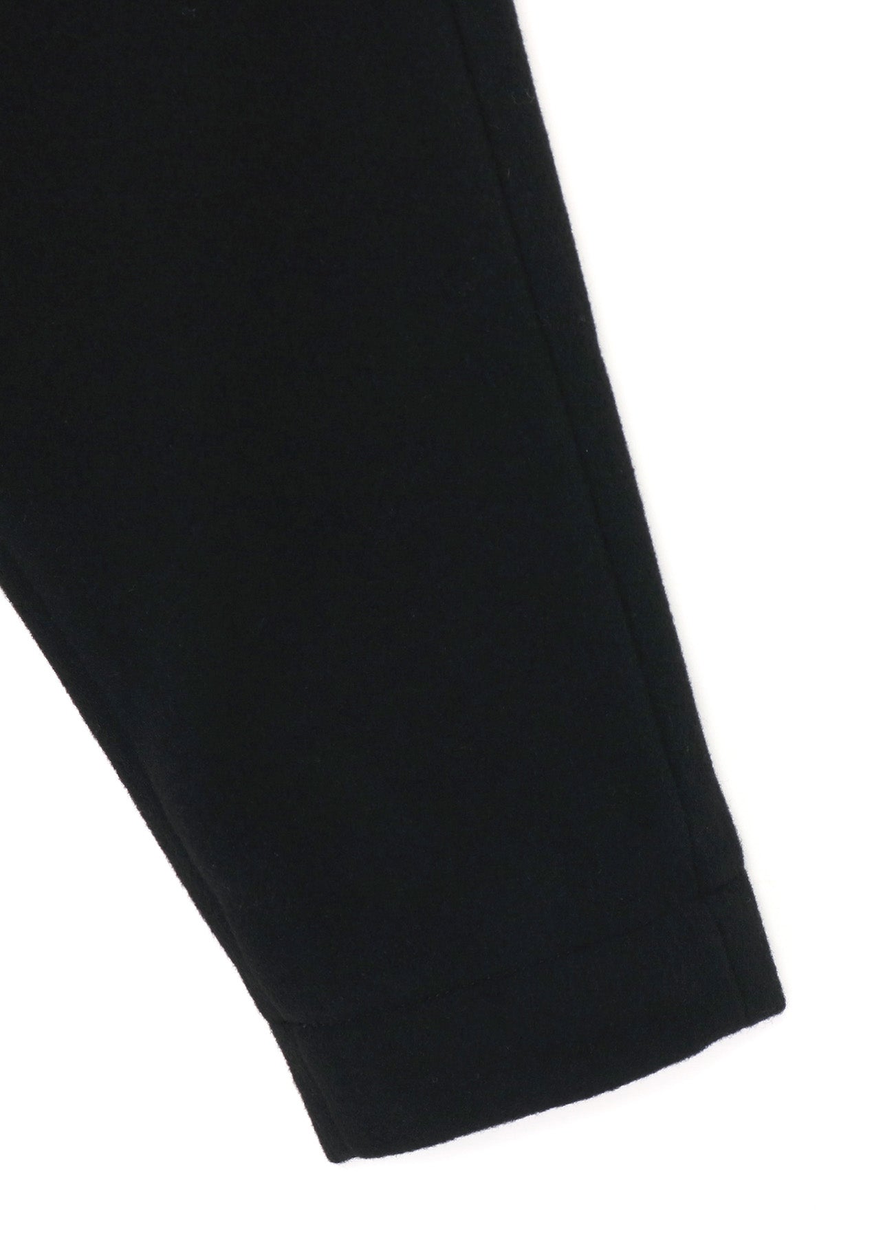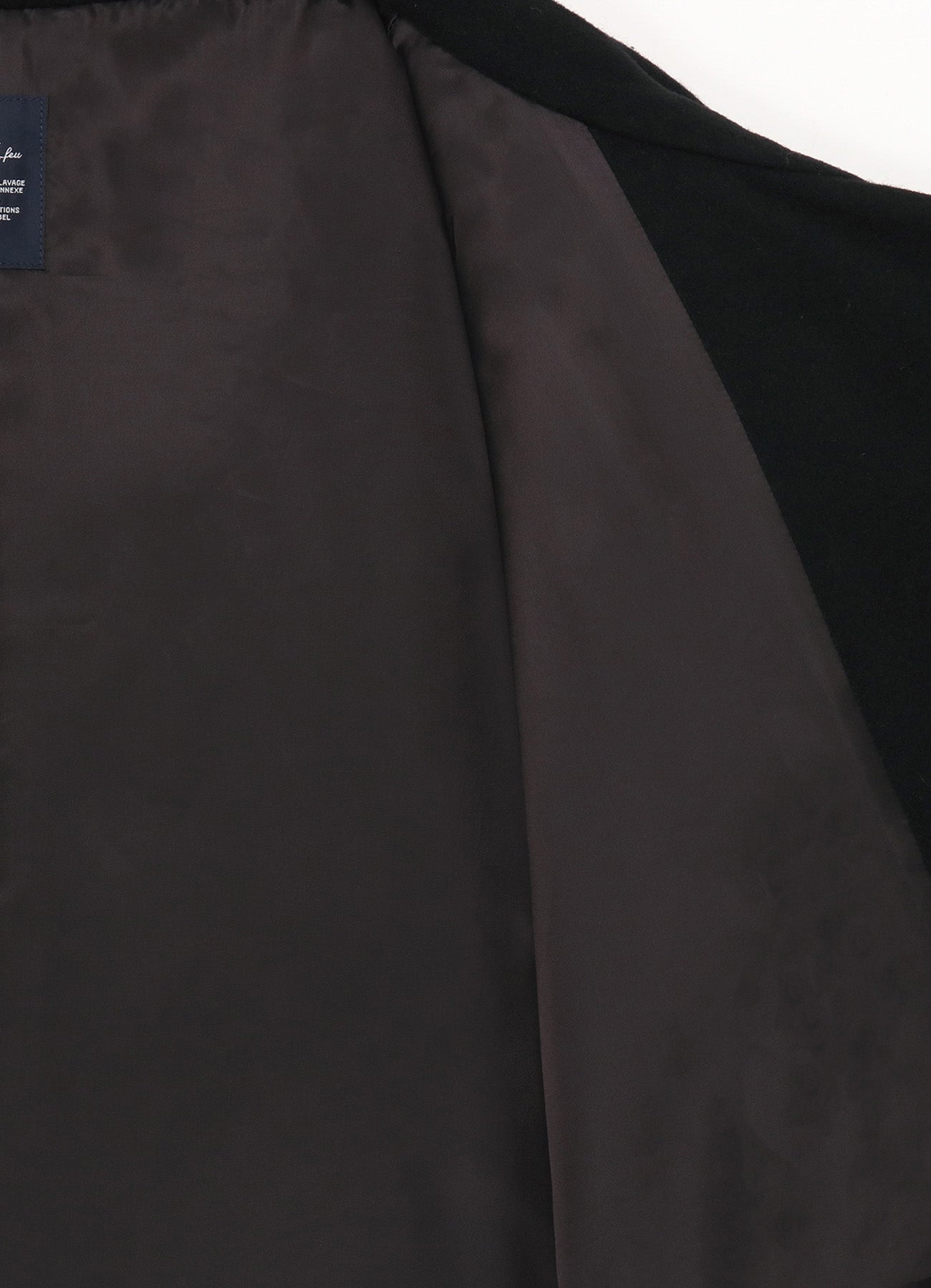 这种羊毛面料以其温暖、干燥的手感为特点,采用粗厚的纱线编织成高密度的织物,然后进行缩绒和起毛,最后减少绒毛。厚实而坚固,但又轻便,具有独特的质感。披肩部分可以放下以增加活动性。