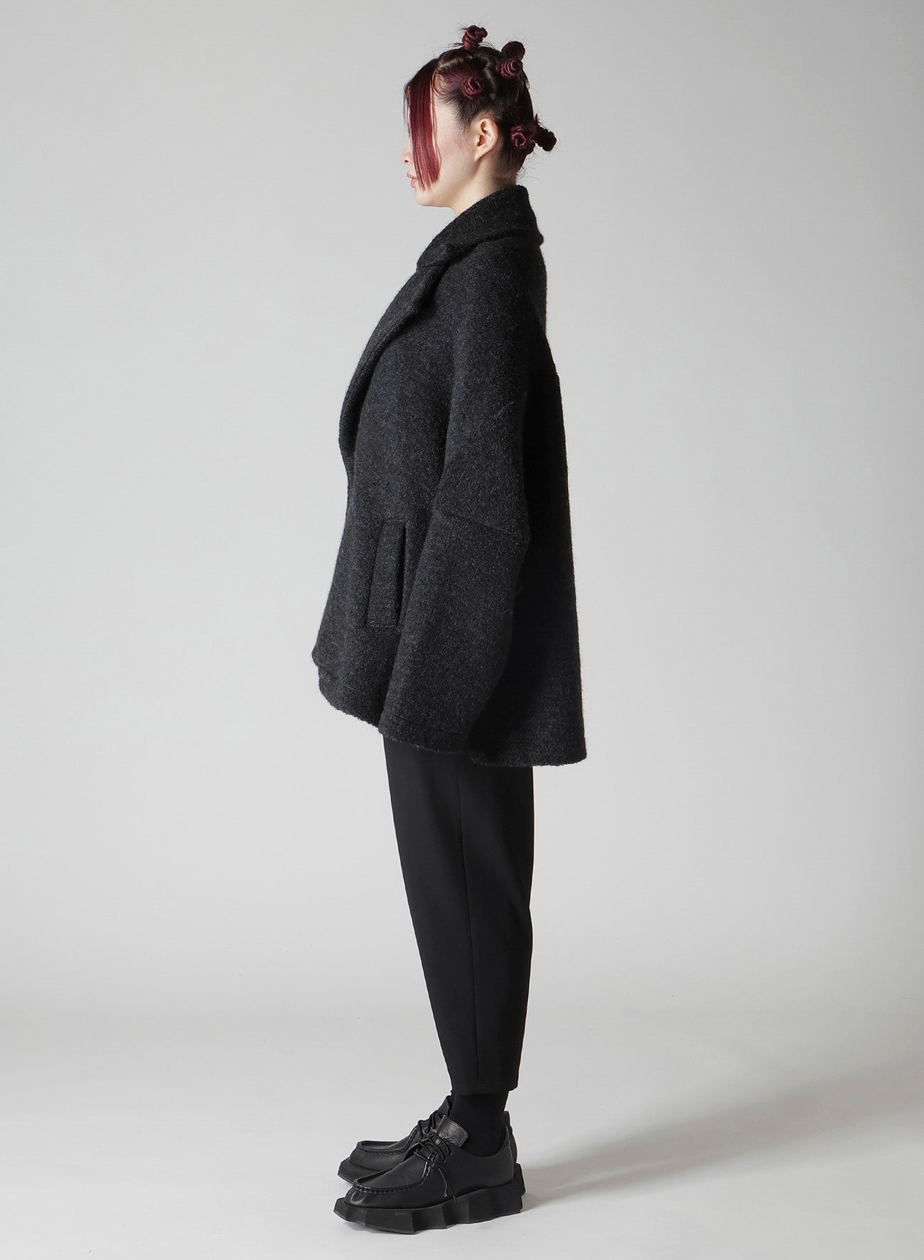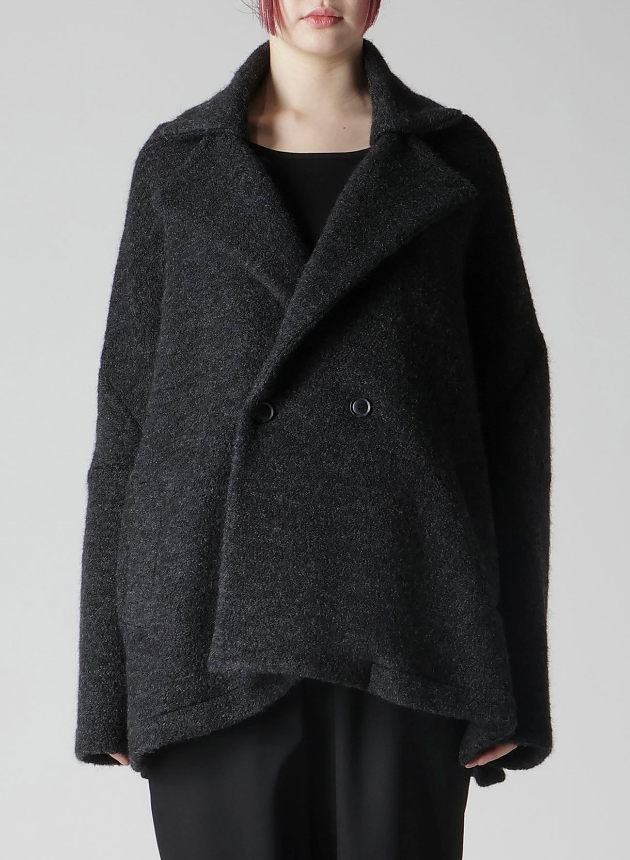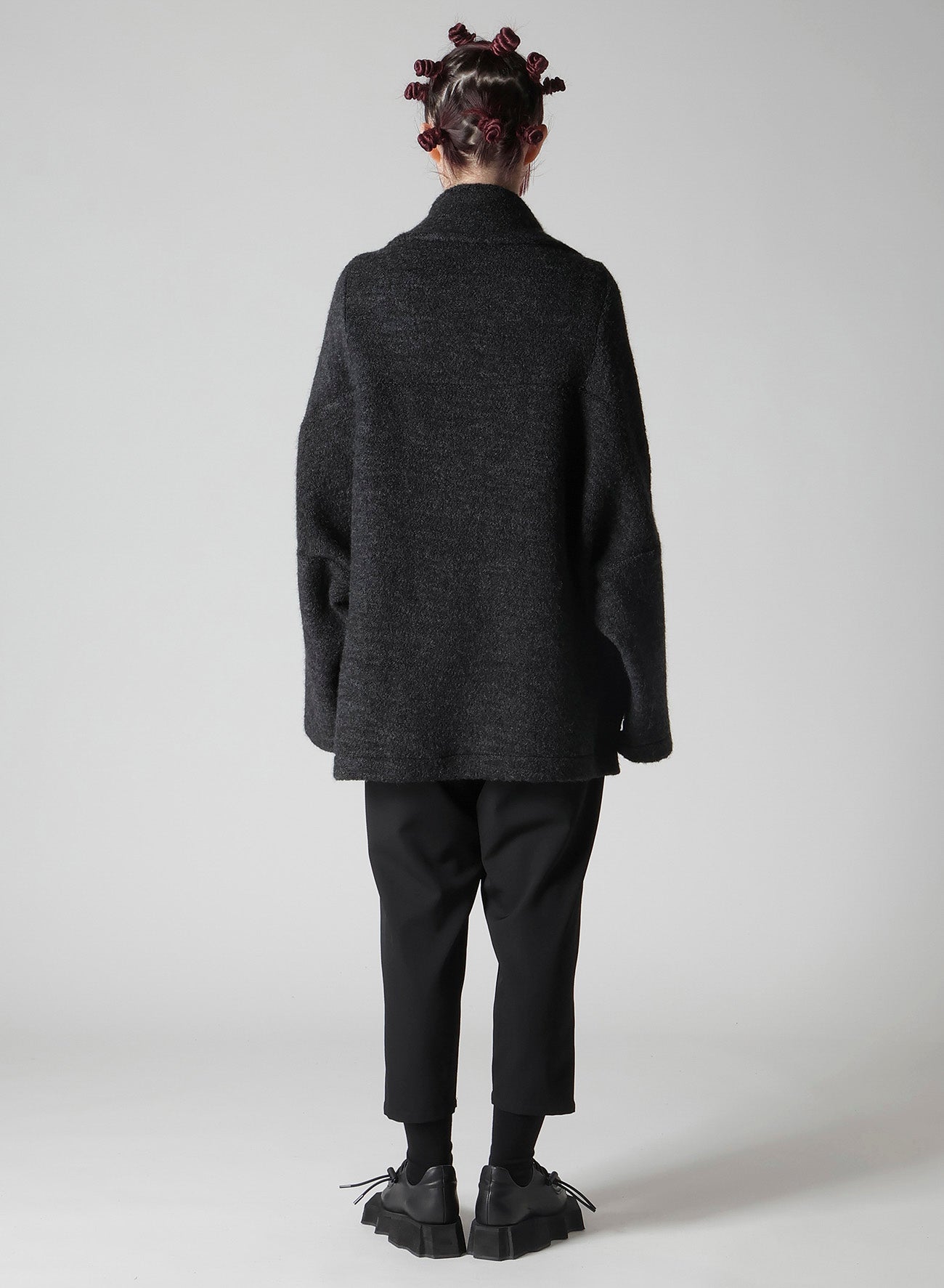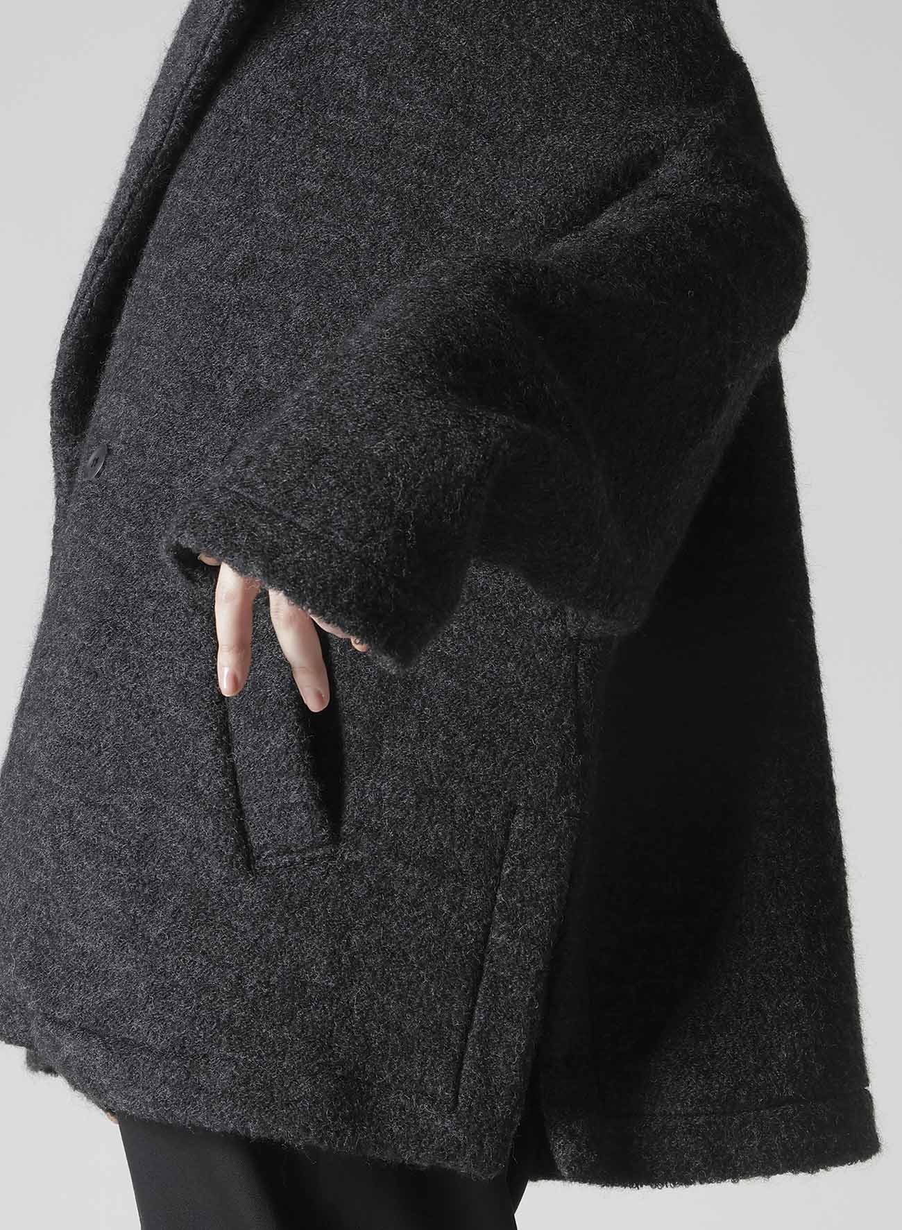 一种带剪毛的绒毛羊毛面料,创造出柔软、温暖的材料,令人联想到羊毛。剪毛工艺使用双辊刷毛,赋予其独特质感。上衣配有大翻领、宽松的袖子和直筒剪裁,轻便且适合作为日常外套。