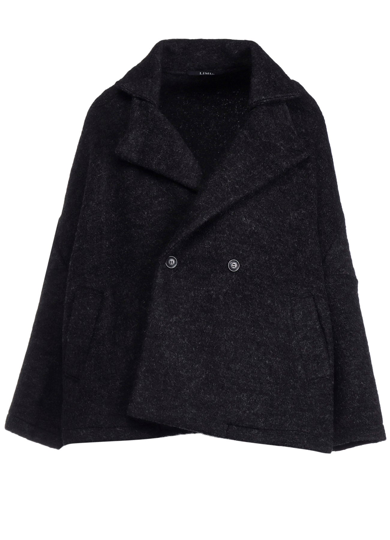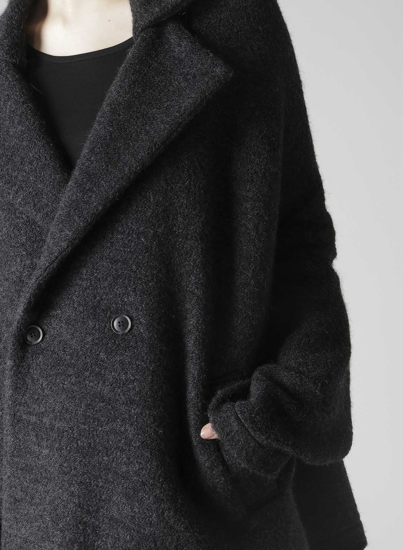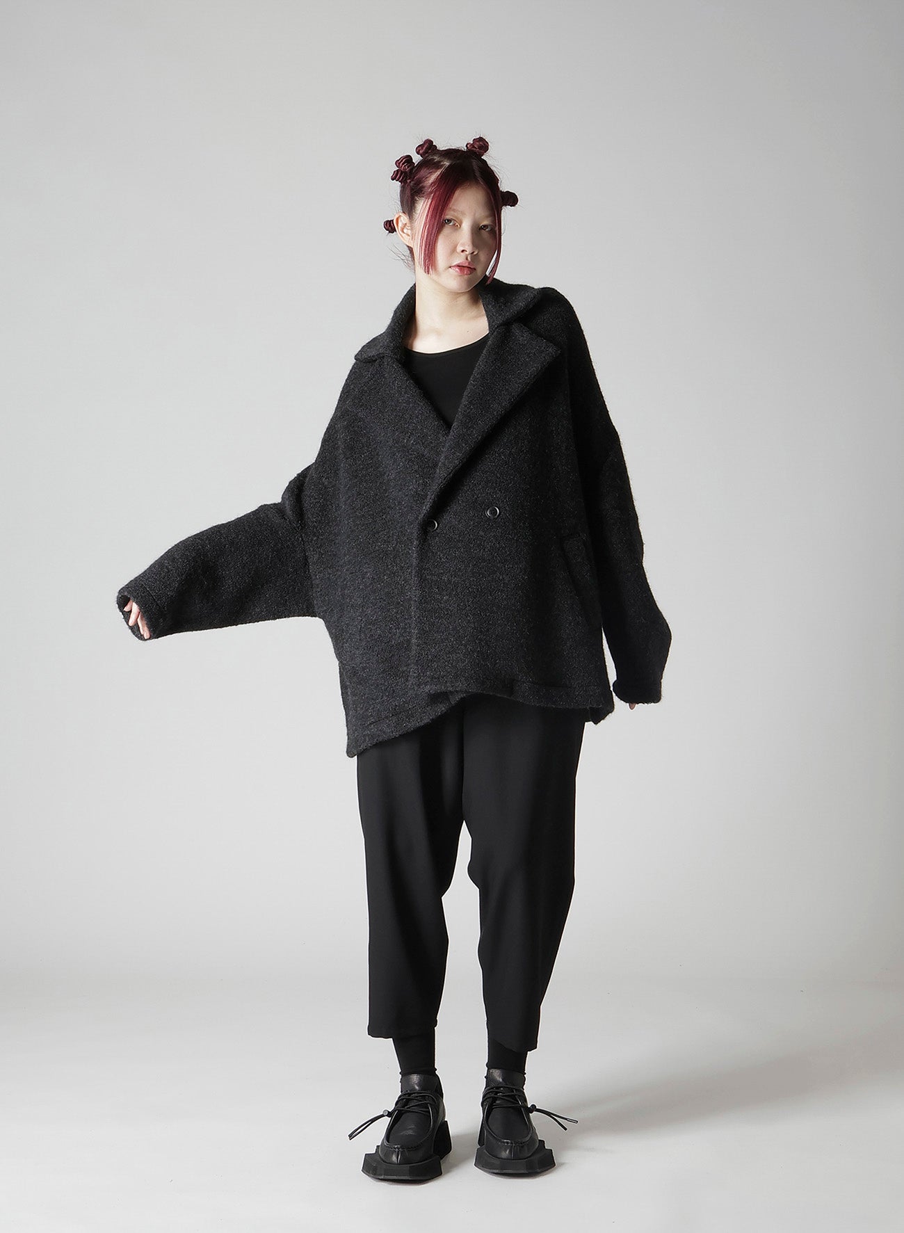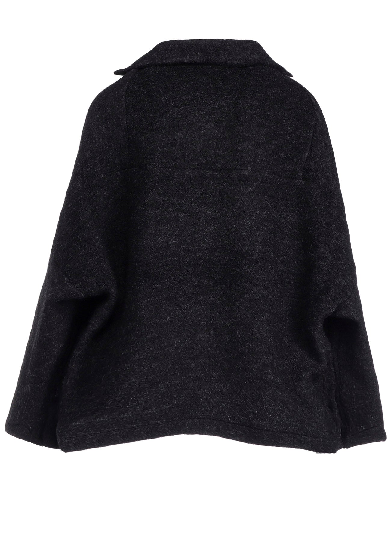 一种带剪毛的绒毛羊毛面料,创造出柔软、温暖的材料,令人联想到羊毛。剪毛工艺使用双辊刷毛,赋予其独特质感。上衣配有大翻领、宽松的袖子和直筒剪裁,轻便且适合作为日常外套。
