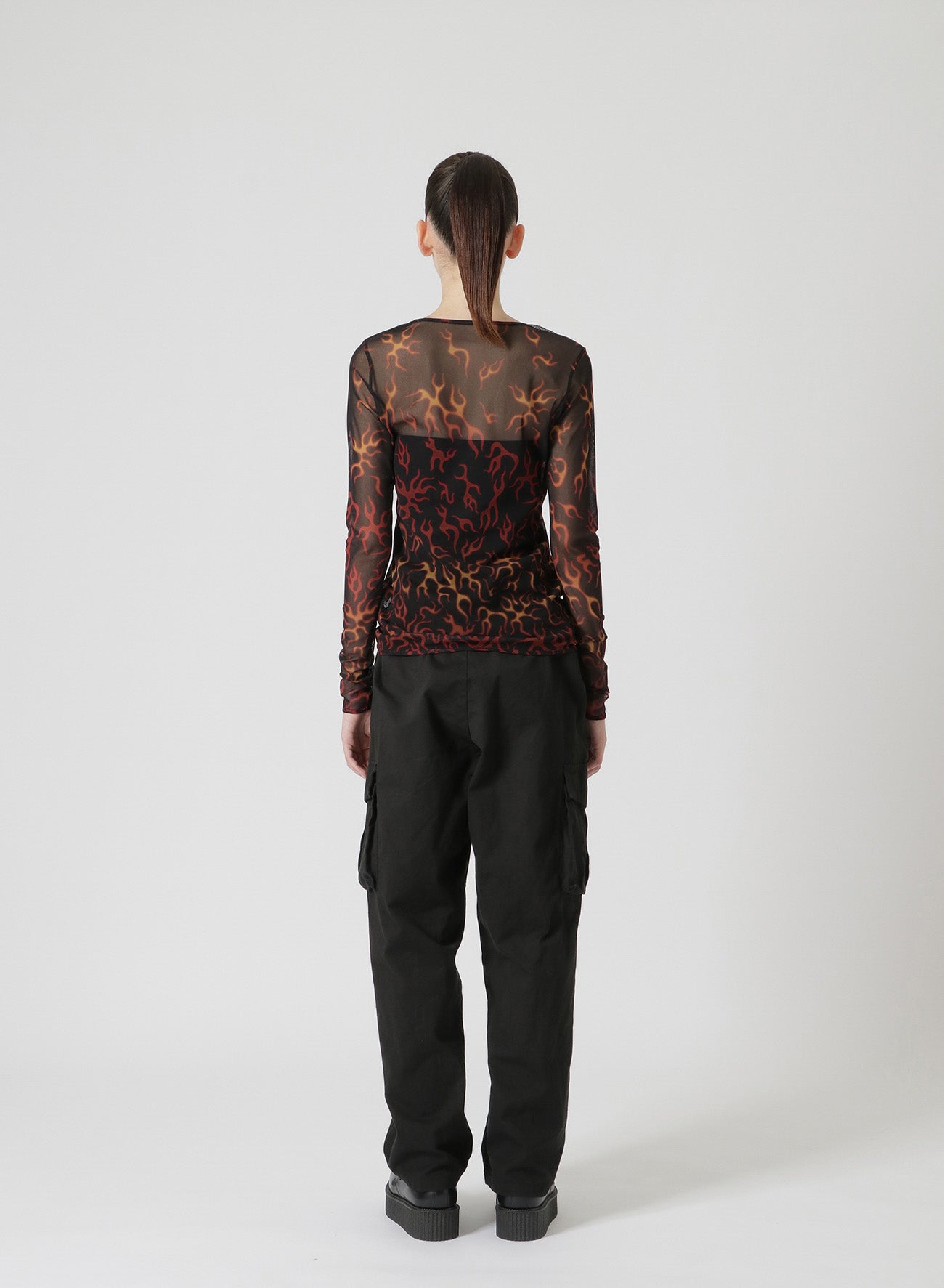 图形化体现“feu”(法语中的火焰和激情)的形象,这款充满活力的火焰印花展示了红色、橙色和黄色的渐变以及火焰密度,突显出动态、有机的运动。采用透明的薄纱面料,印花微妙地为任何服装增添了引人注目的同时又适应性强的点缀。