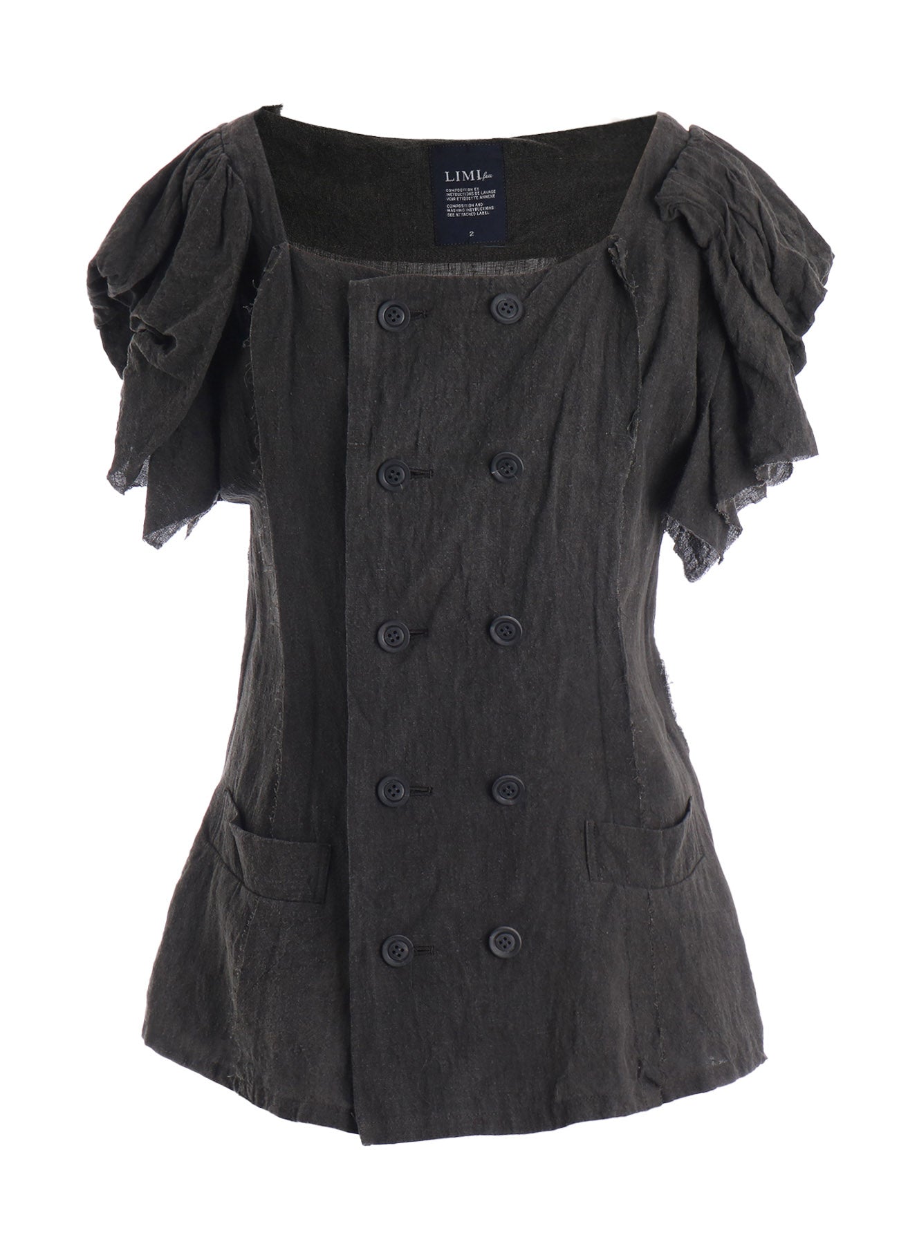 This jacket features a compact silhouette that clings to the body, with a square neckline and a double-breasted front for a clean look. Made from linen with a unique sumi ink dye, it offers a distinctive color and texture. Variation in cut edges and fading over time enhances its unique appeal.